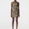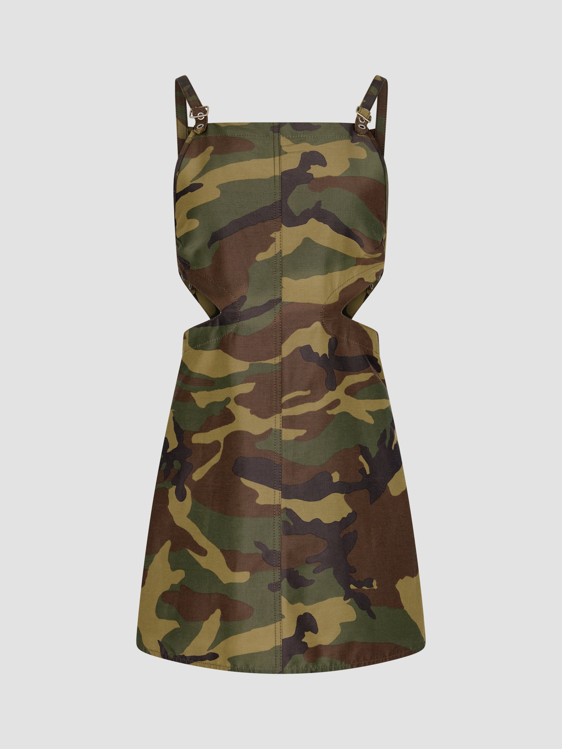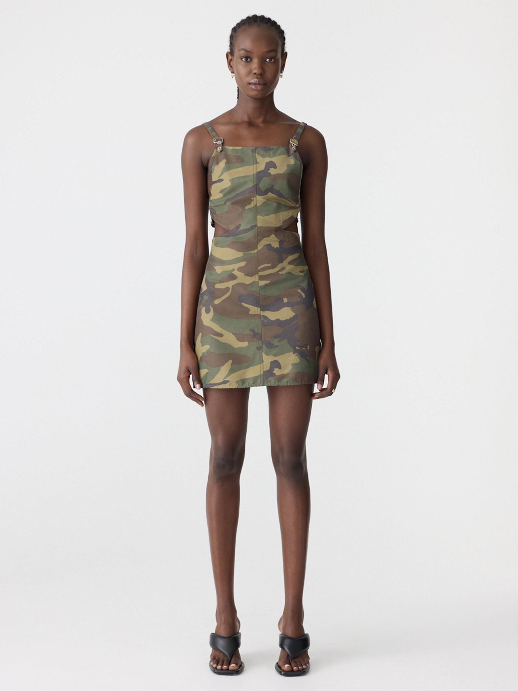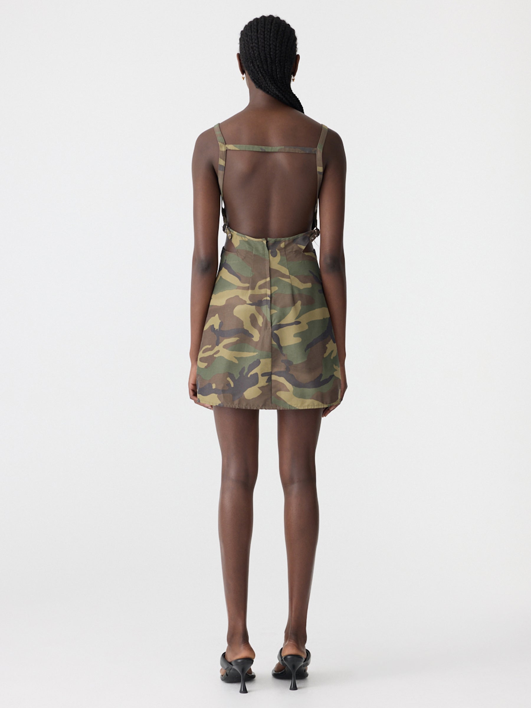 The Utility Detail Camo Mini Dress is crafted from Japanese cotton blend with a structured, tactile feel. Designed with adjustable shoulder straps and front buckles, side straps to cinch the waist, a centre back concealed zip, and cross-back strap detailing. Finished with twin-needle utility stitching in thick khaki thread for a functional, utilitarian edge.