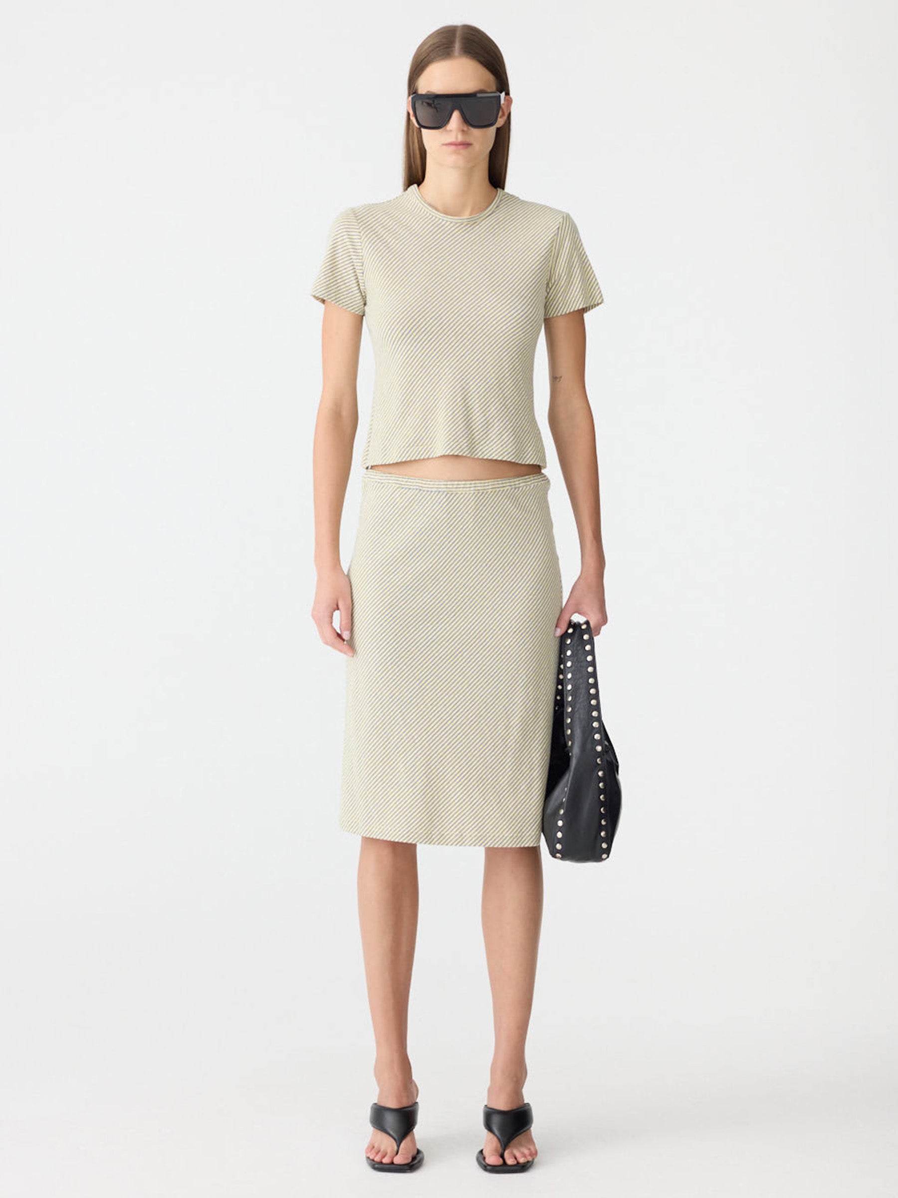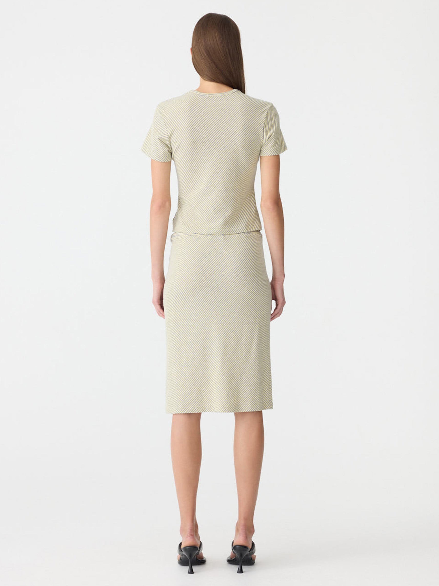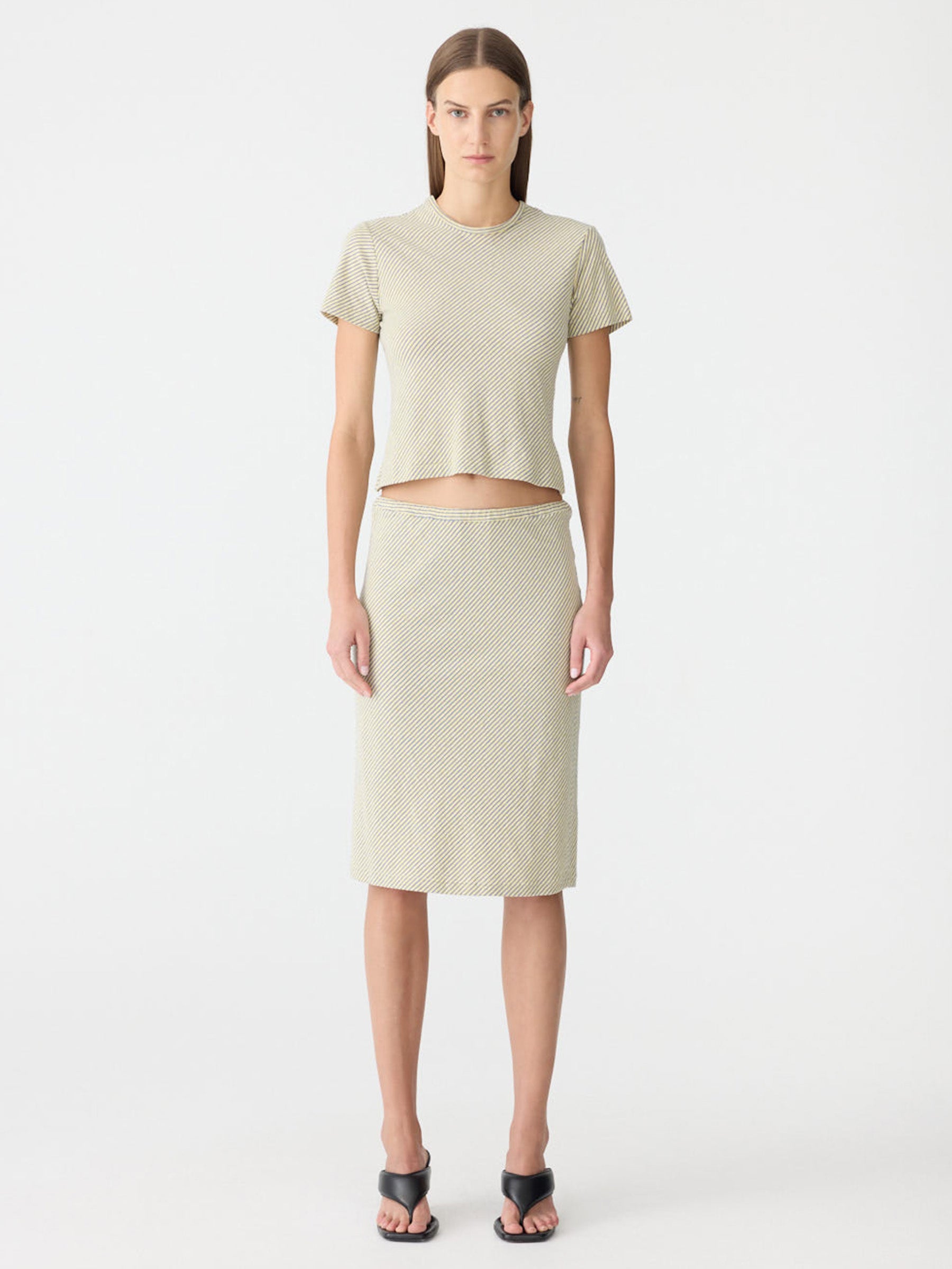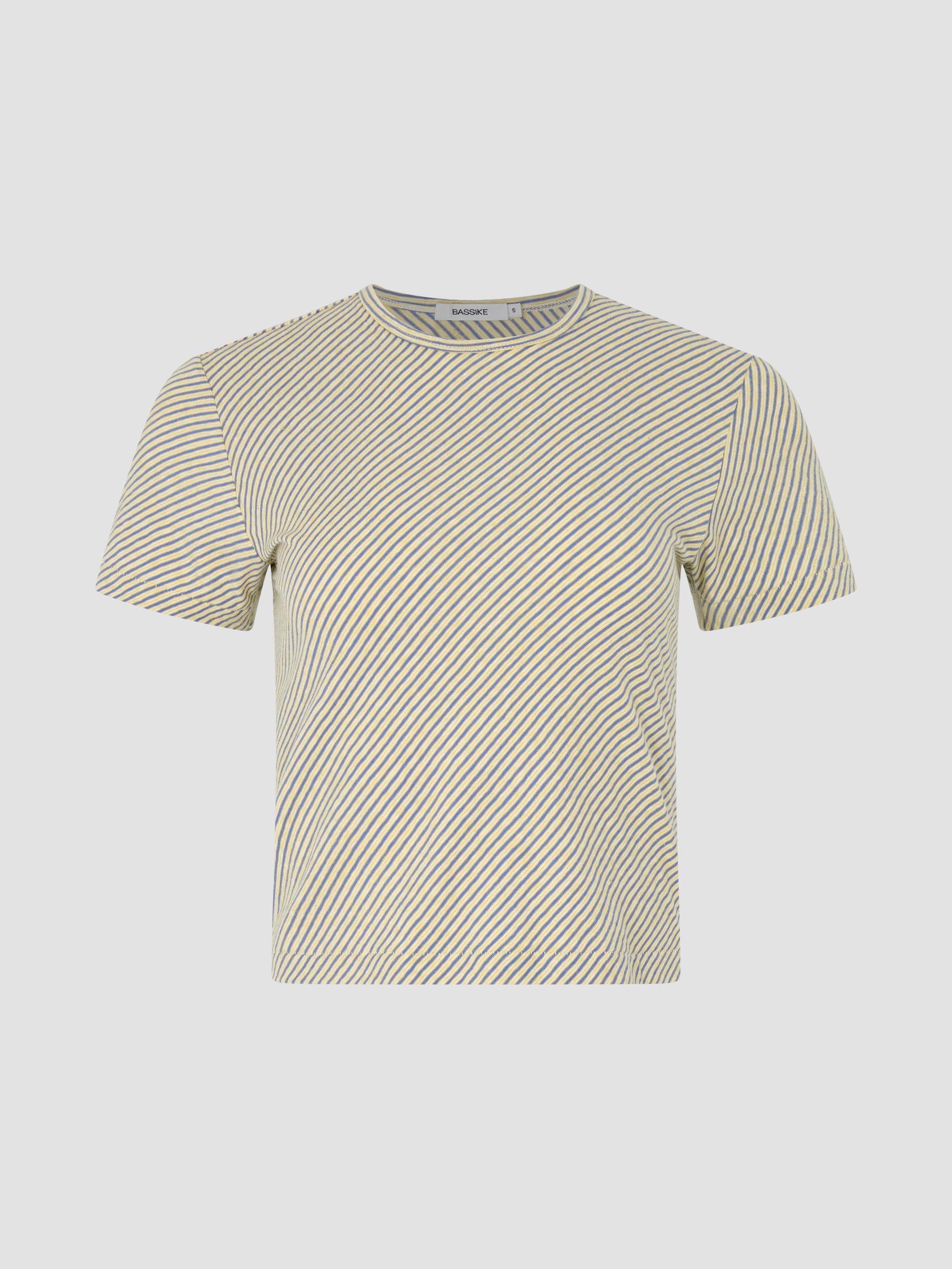 The Bias Stripe Baby T-Shirt is a slim fit, short sleeve style crafted from Japanese cotton stripe. Cut on the bias for a soft drape and natural movement, finished with a clean hem, self neck bind and signature Bassike stitching at the back neck.
