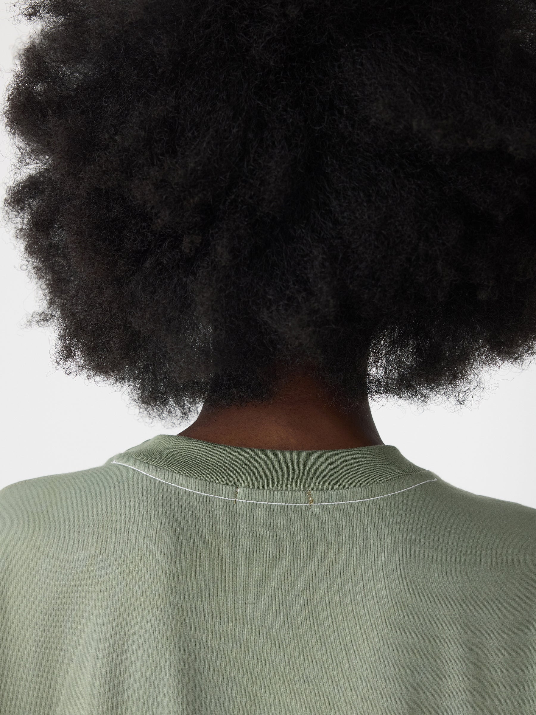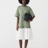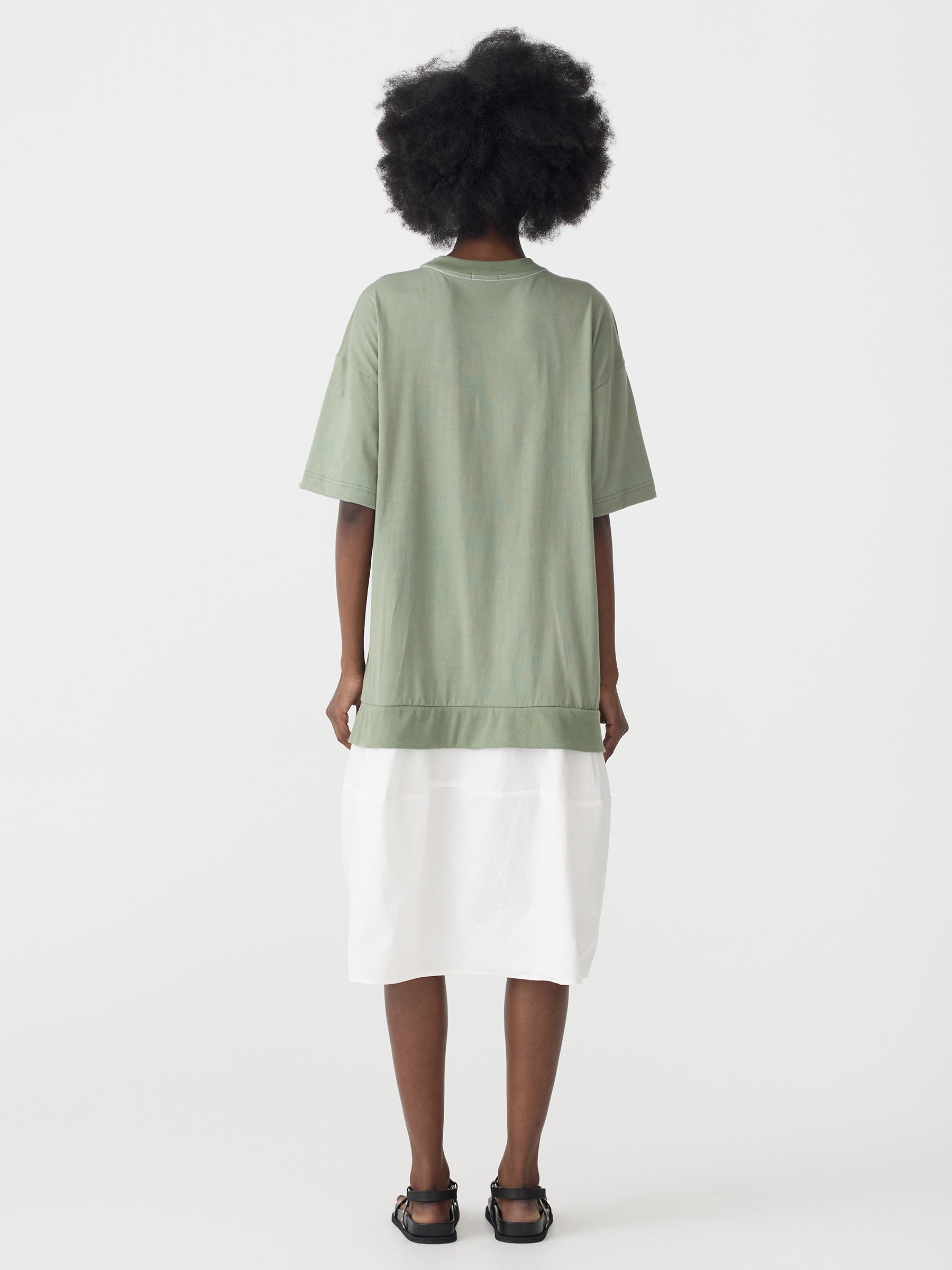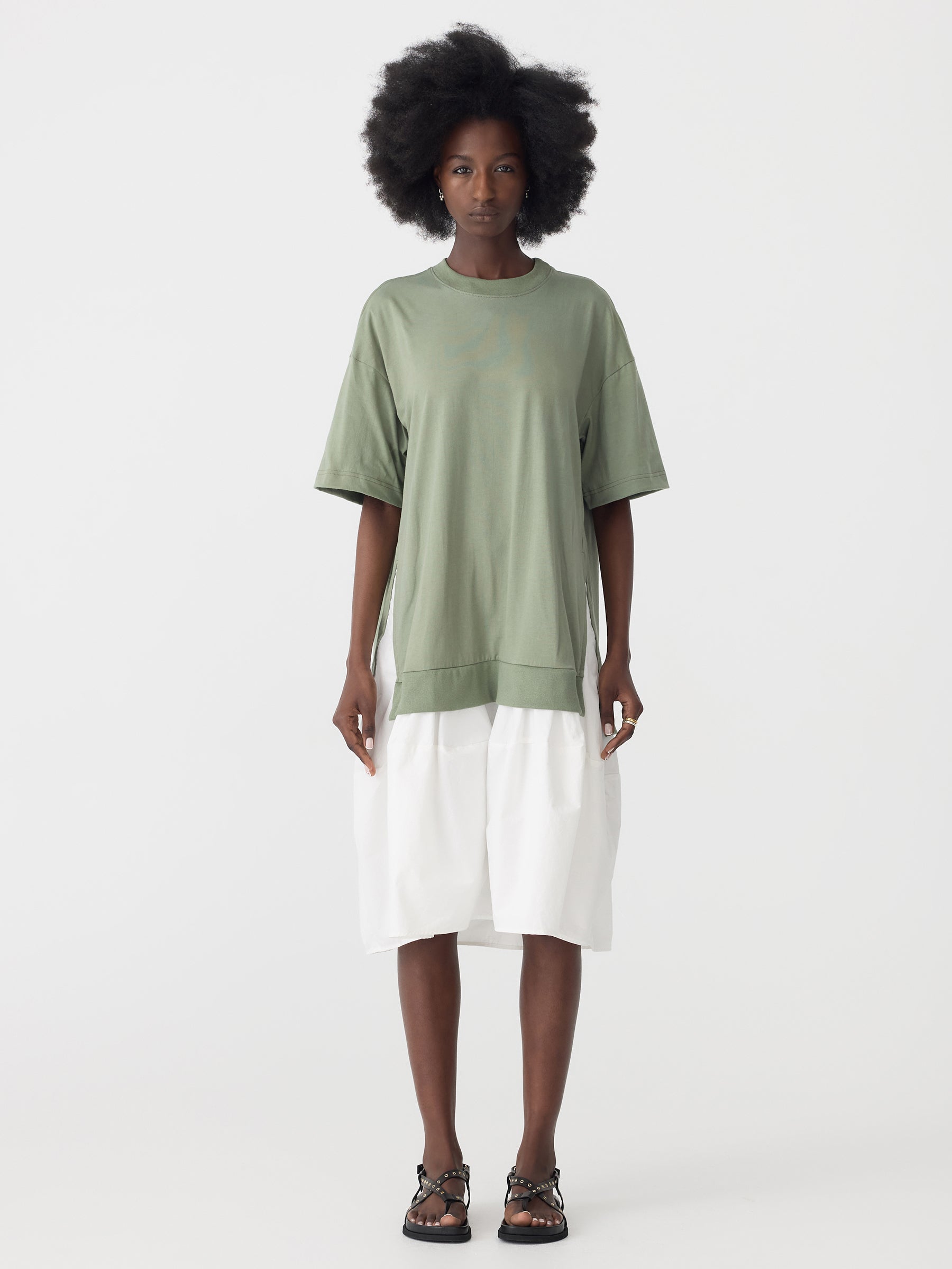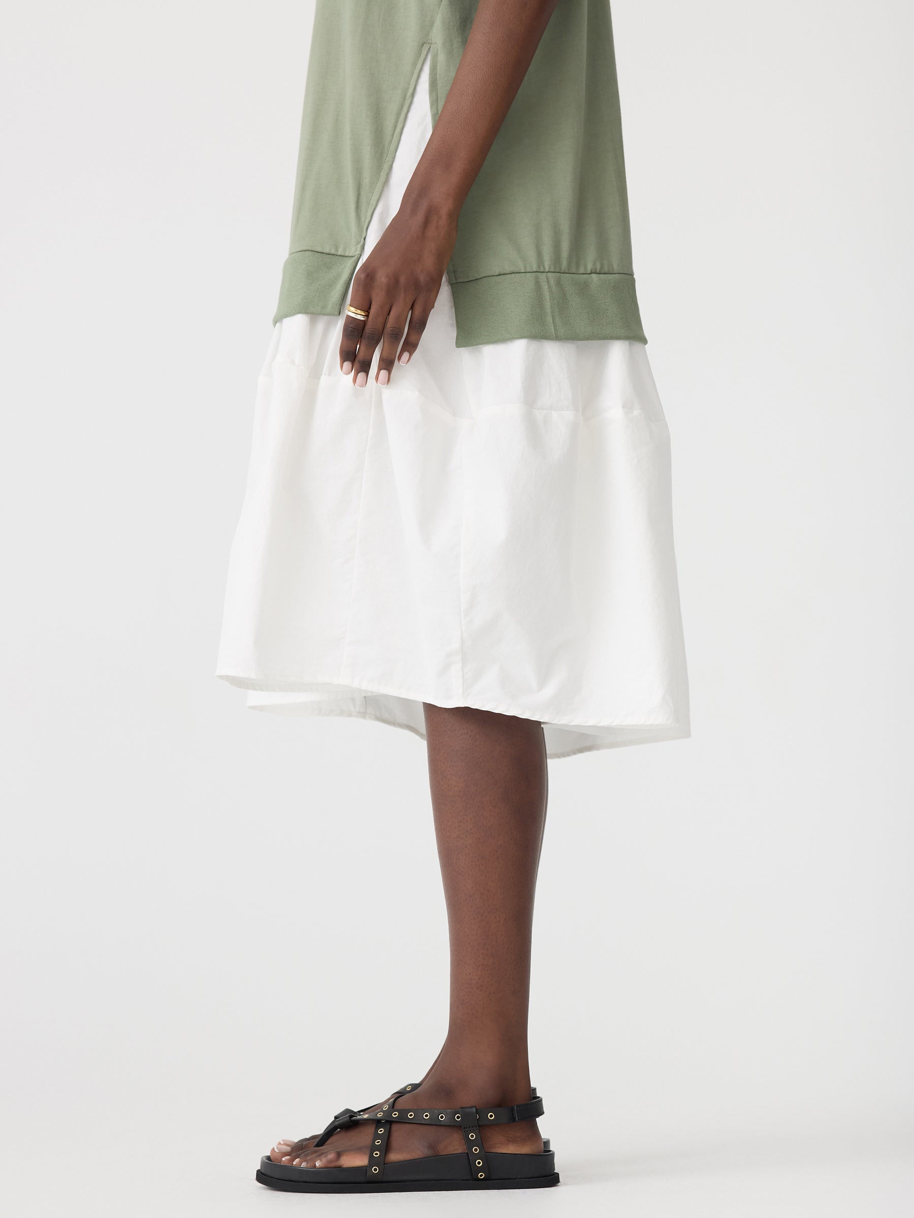 A slouched fit and flare silhouette designed with the look of two pieces. The Contrast Paneled Dress is crafted with a slouched fit top in organic double jersey with band at bottom hip. Contrast skirt in crushed cotton with a panel detail. Refined by signature Bassike contrast topstitching at back.
