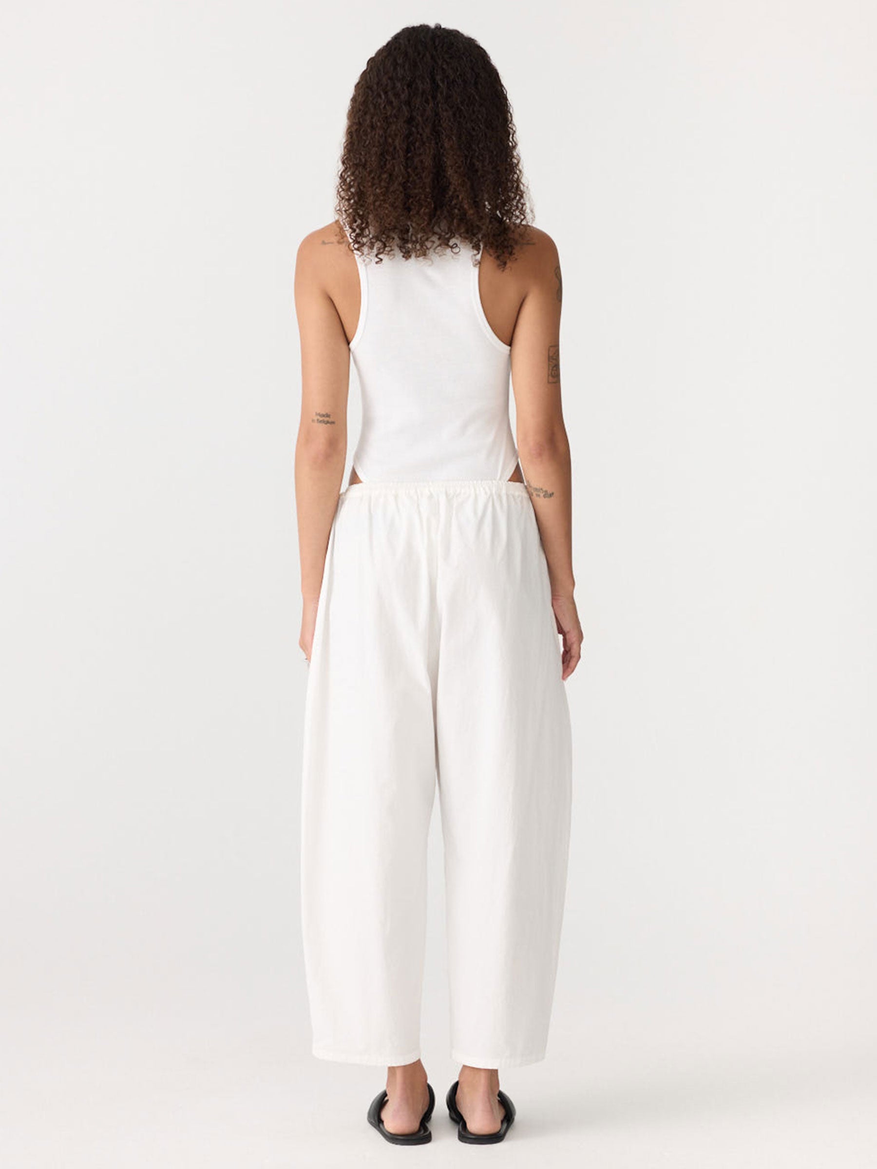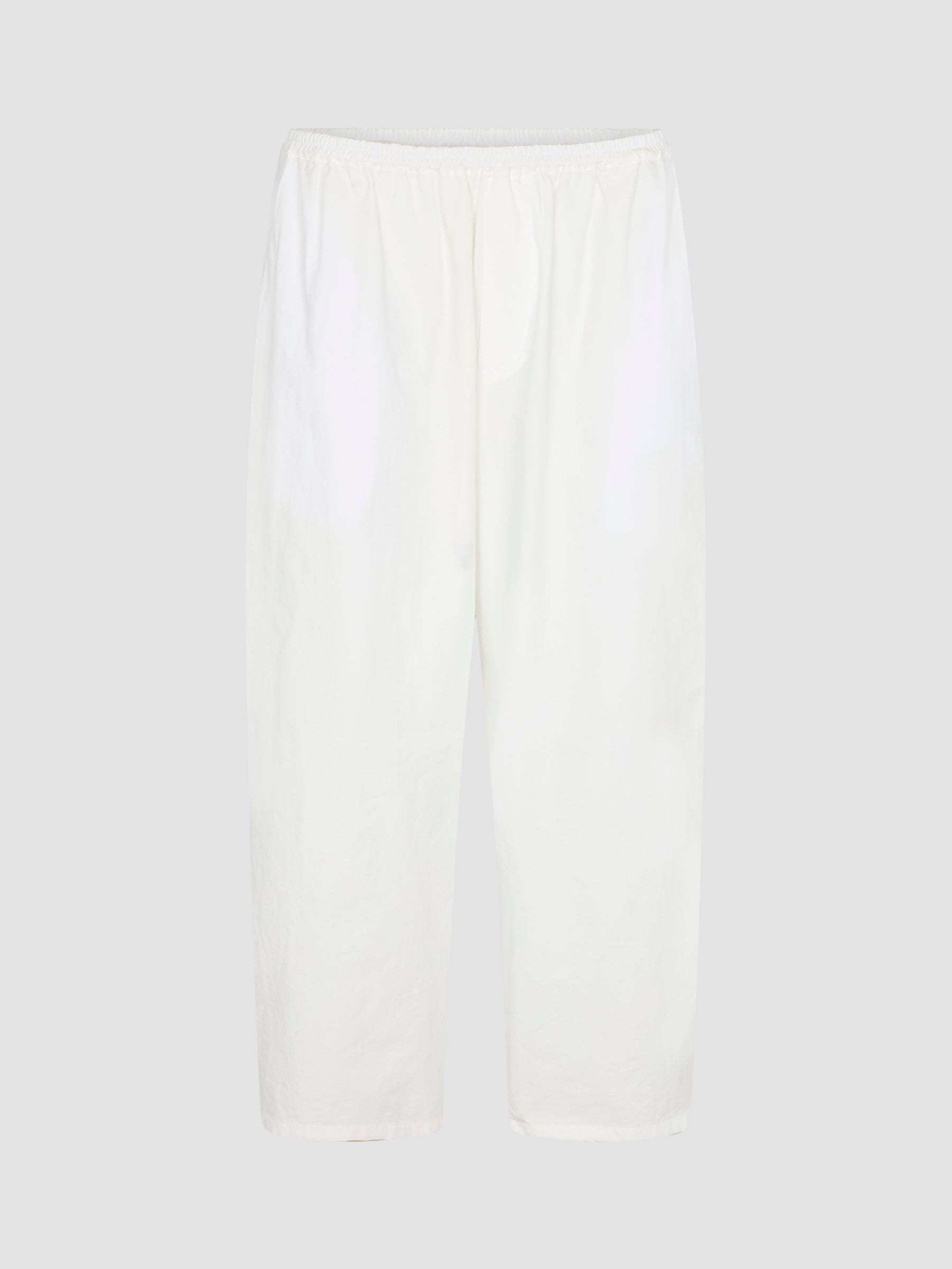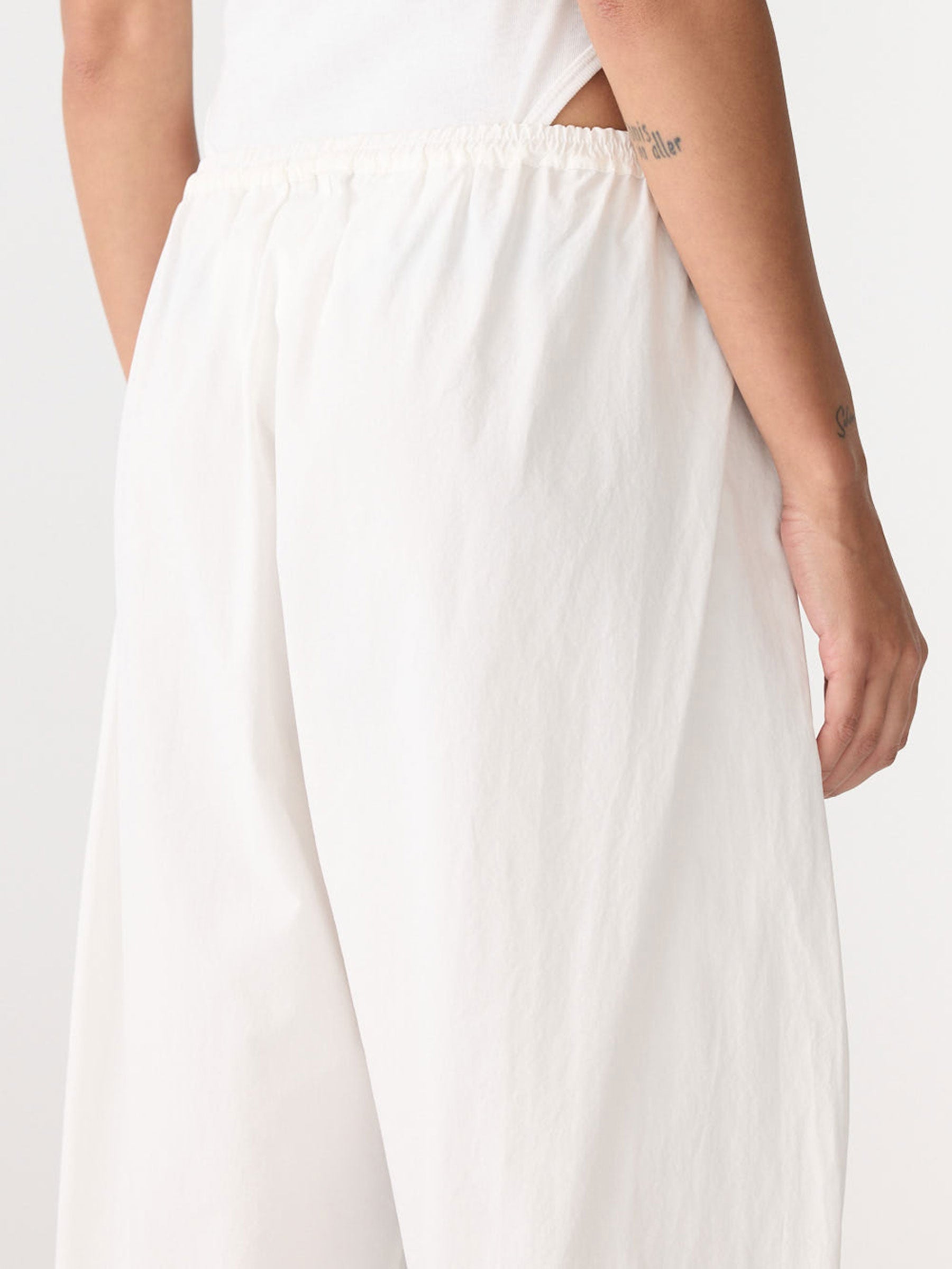 The Cotton Crop Gathered Pant is a cropped, voluminous pull-on style crafted from lightweight compact cotton with a natural crushed texture. Designed with a fine elasticated waistband, pre-made drawcord and topstitch detailing. Finished with side entry pockets and a faux fly for a relaxed, utilitarian edge.