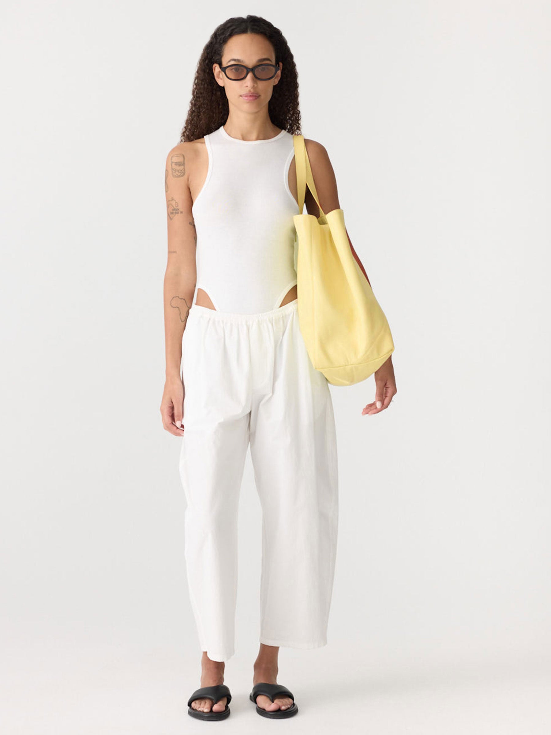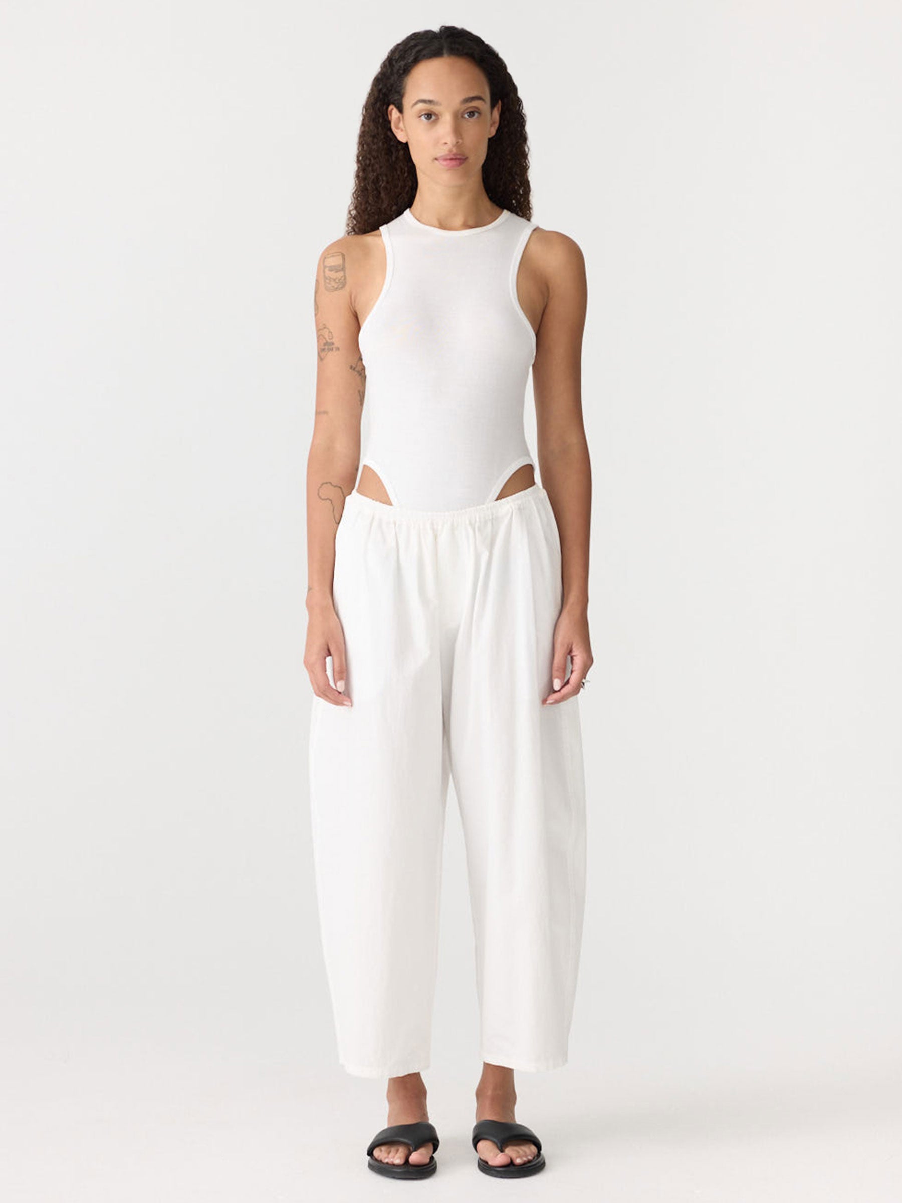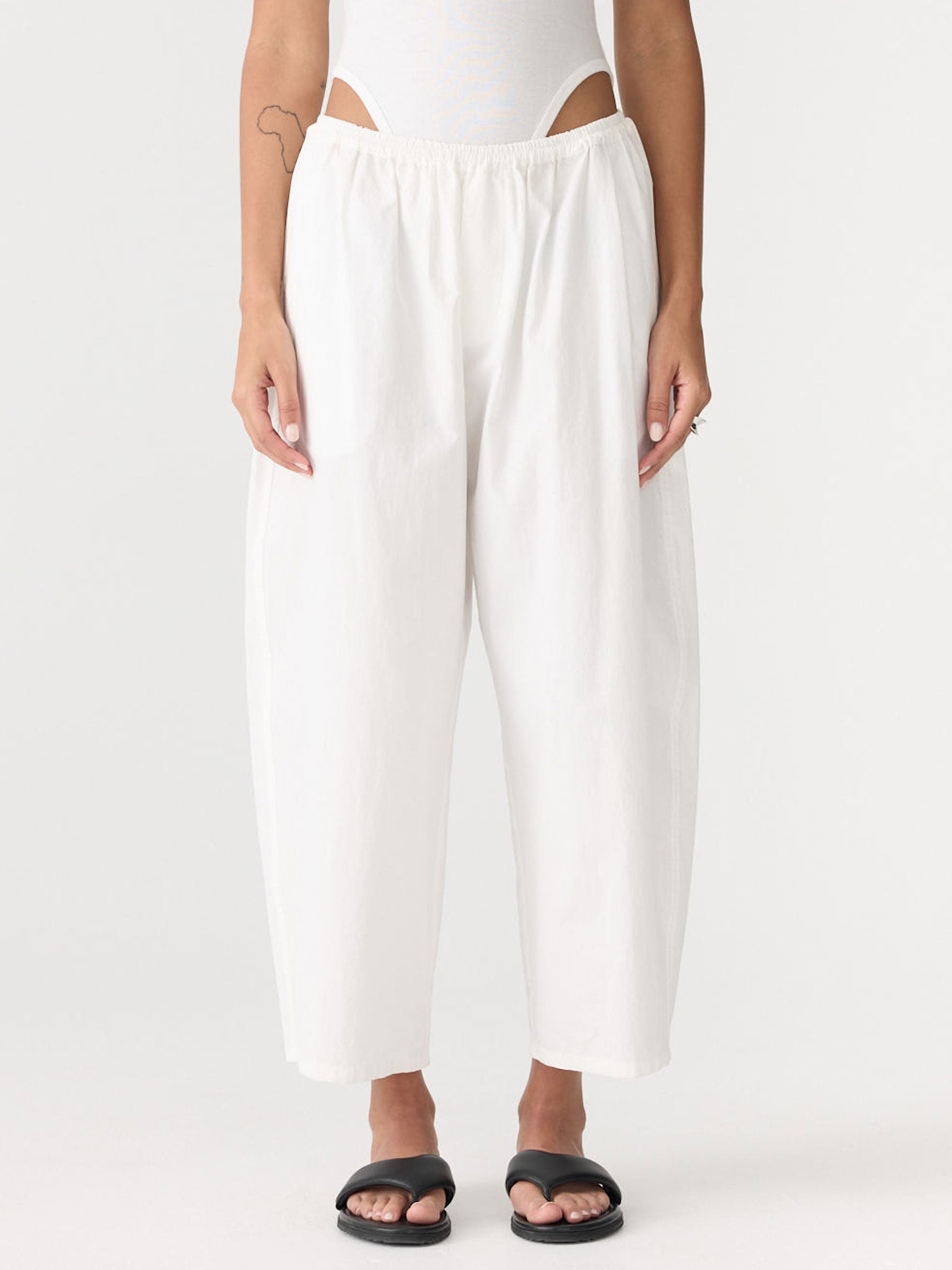The Cotton Crop Gathered Pant is a cropped, voluminous pull-on style crafted from lightweight compact cotton with a natural crushed texture. Designed with a fine elasticated waistband, pre-made drawcord and topstitch detailing. Finished with side entry pockets and a faux fly for a relaxed, utilitarian edge.