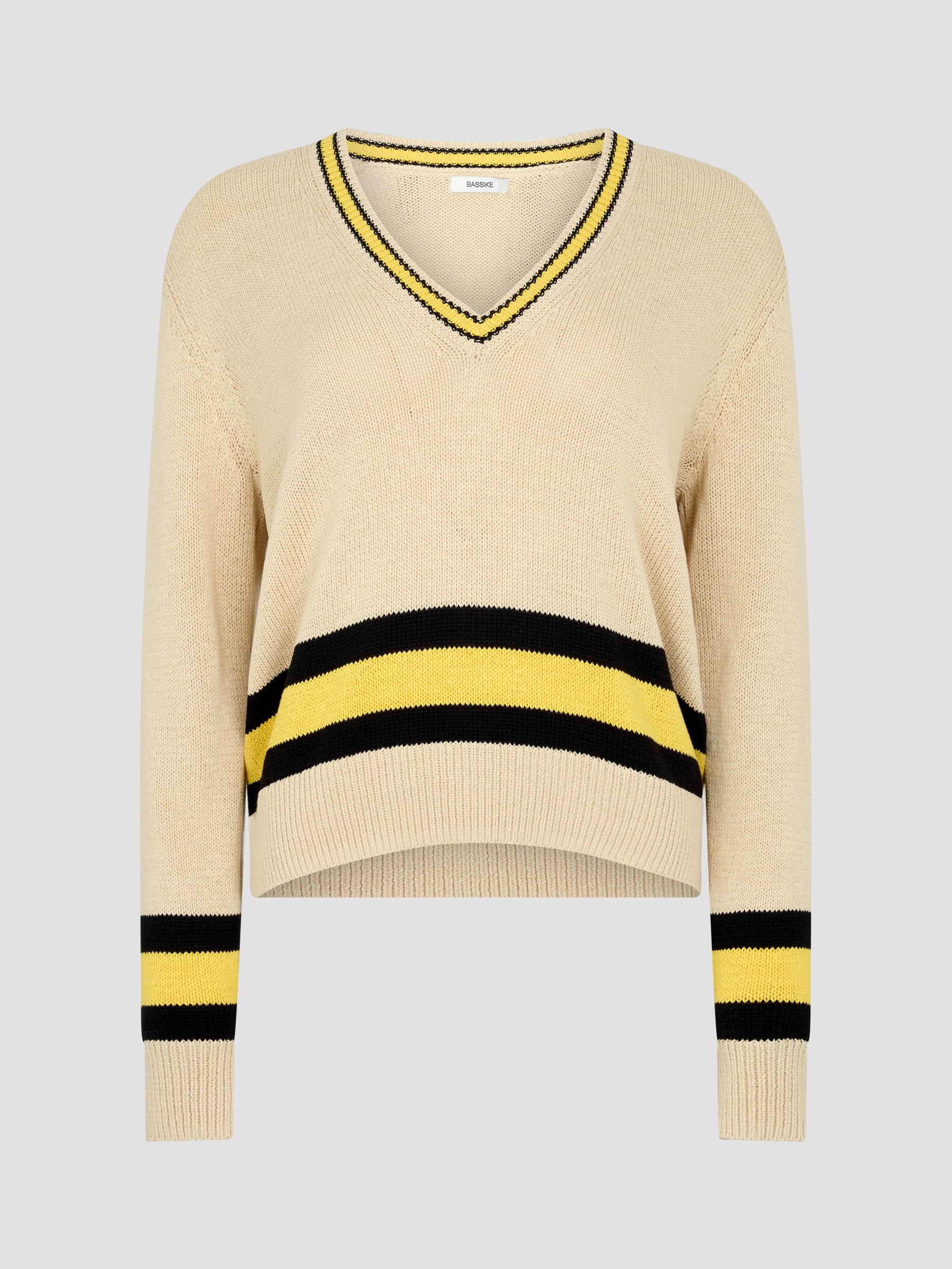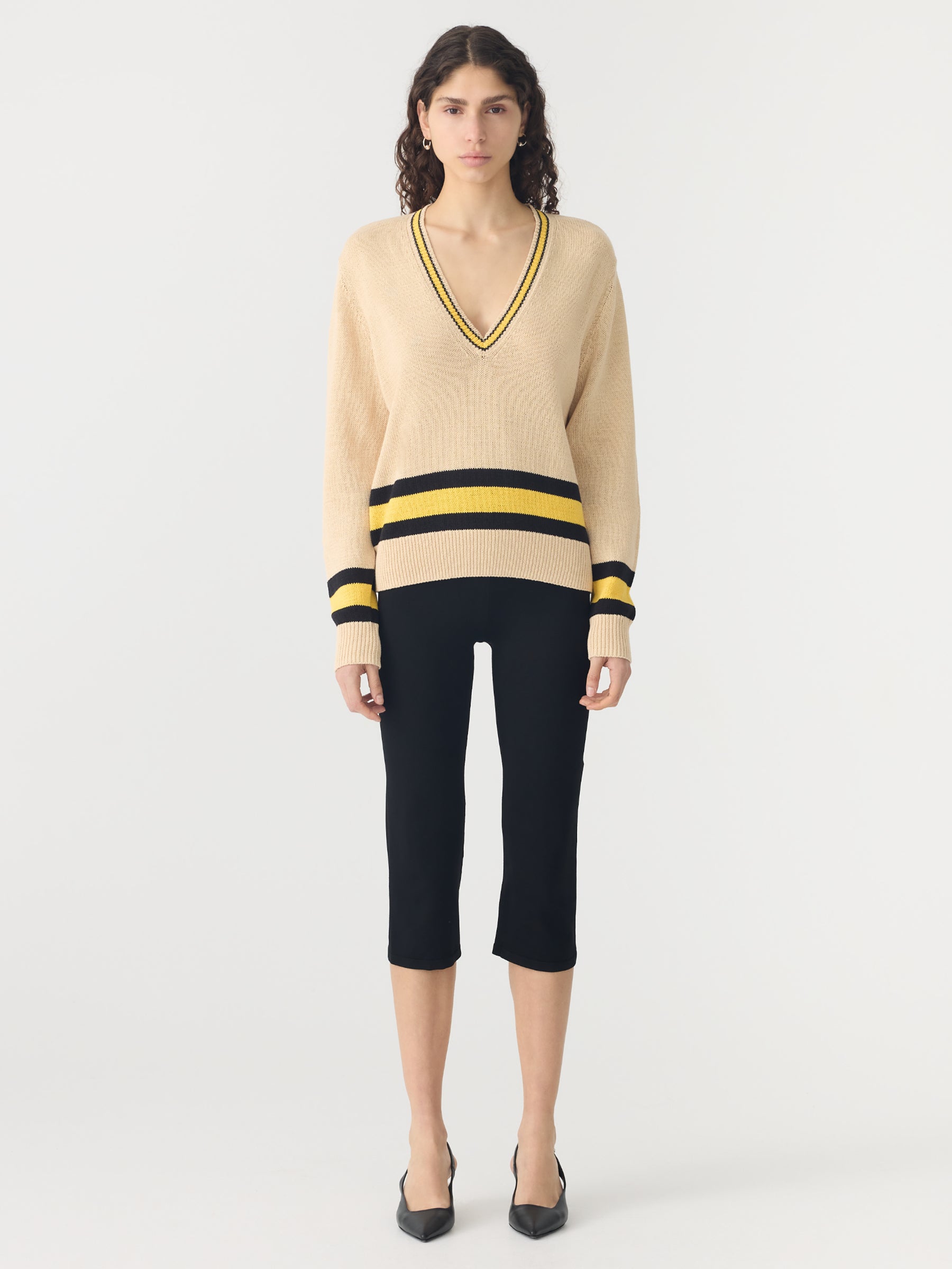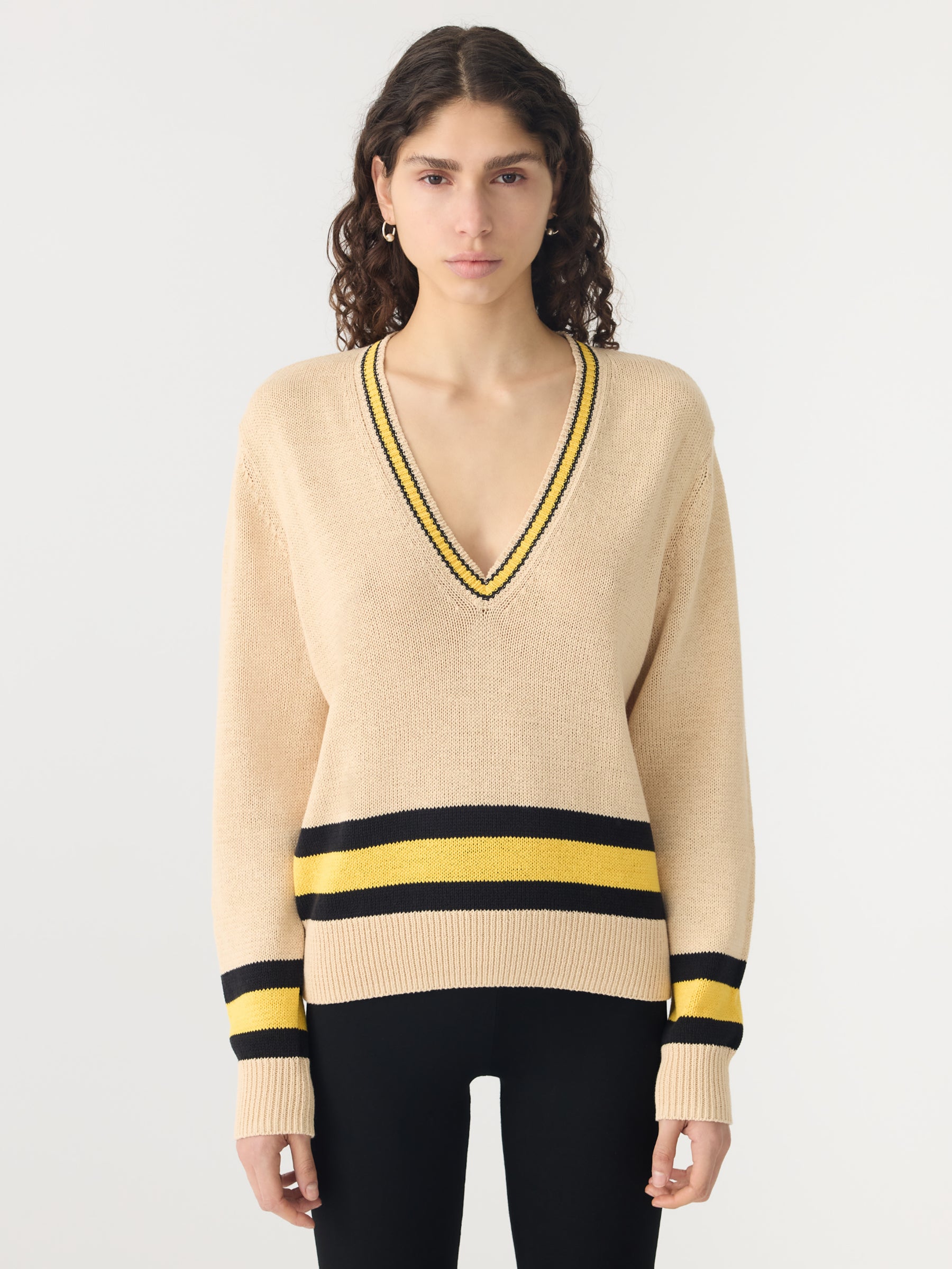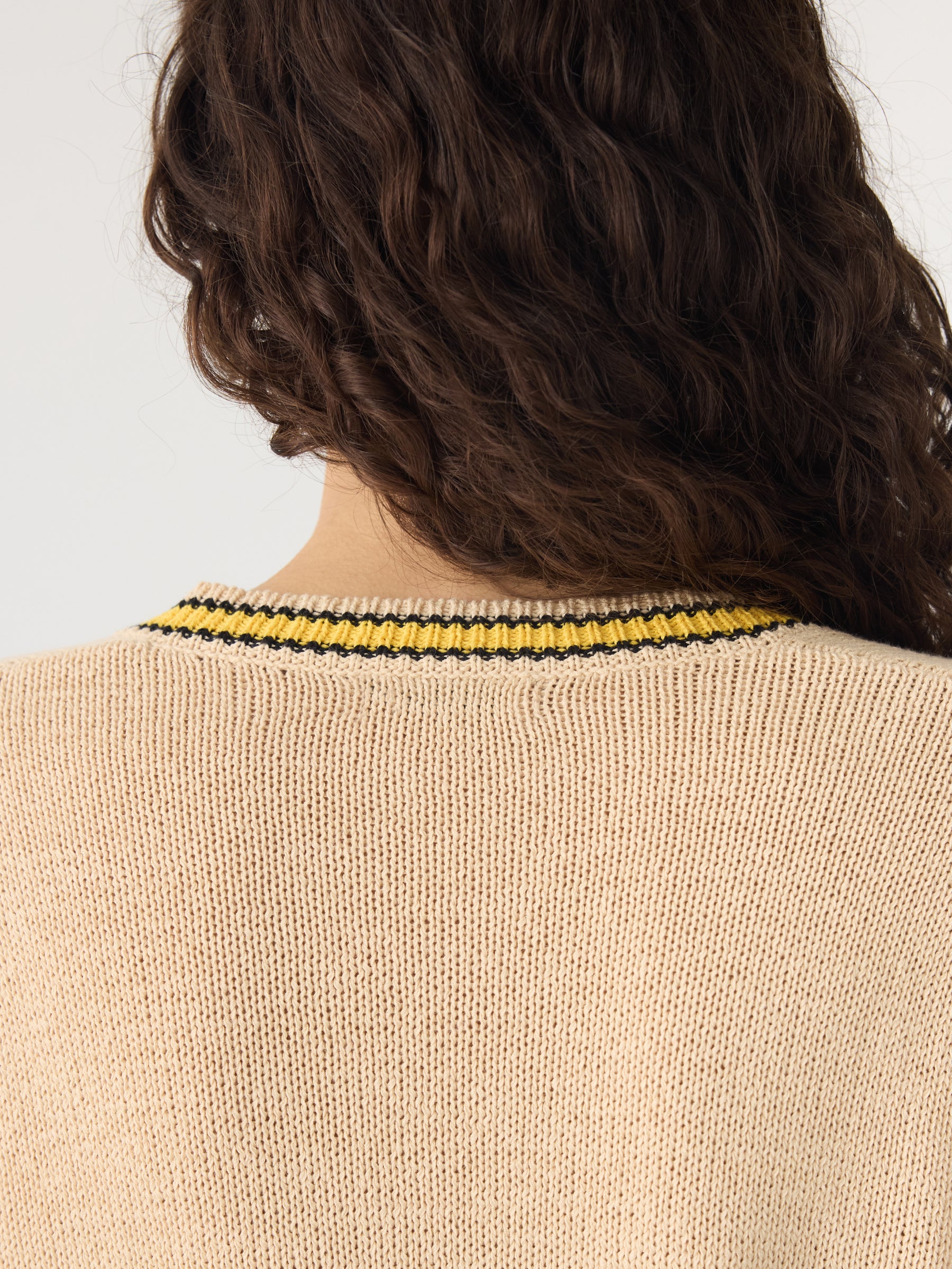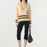 Relaxed V-neck knit crafted in a cotton linen blend. Designed with contrast stripe detailing at the neckline, cuffs and hem, and finished with rib trims for subtle structure.