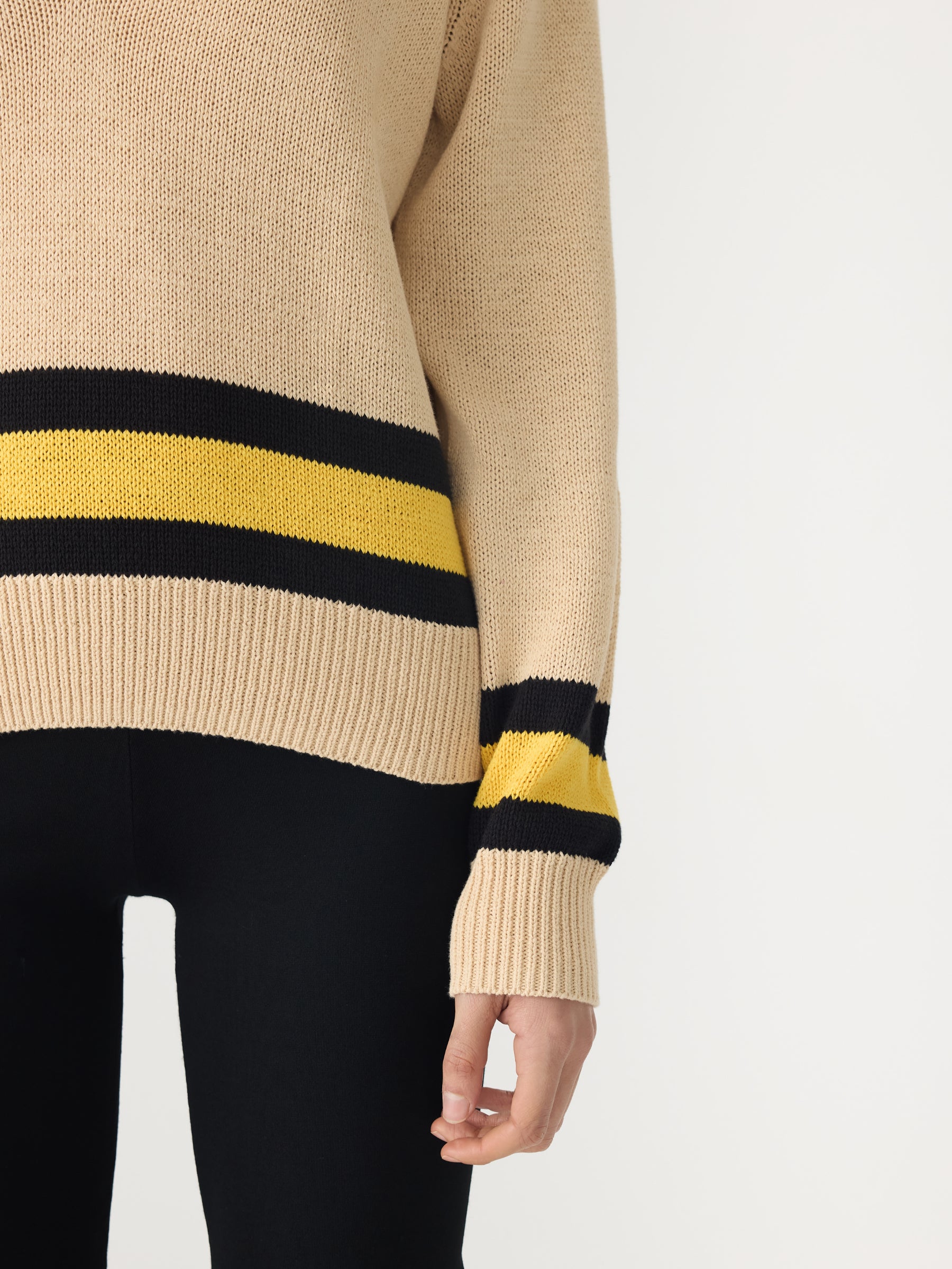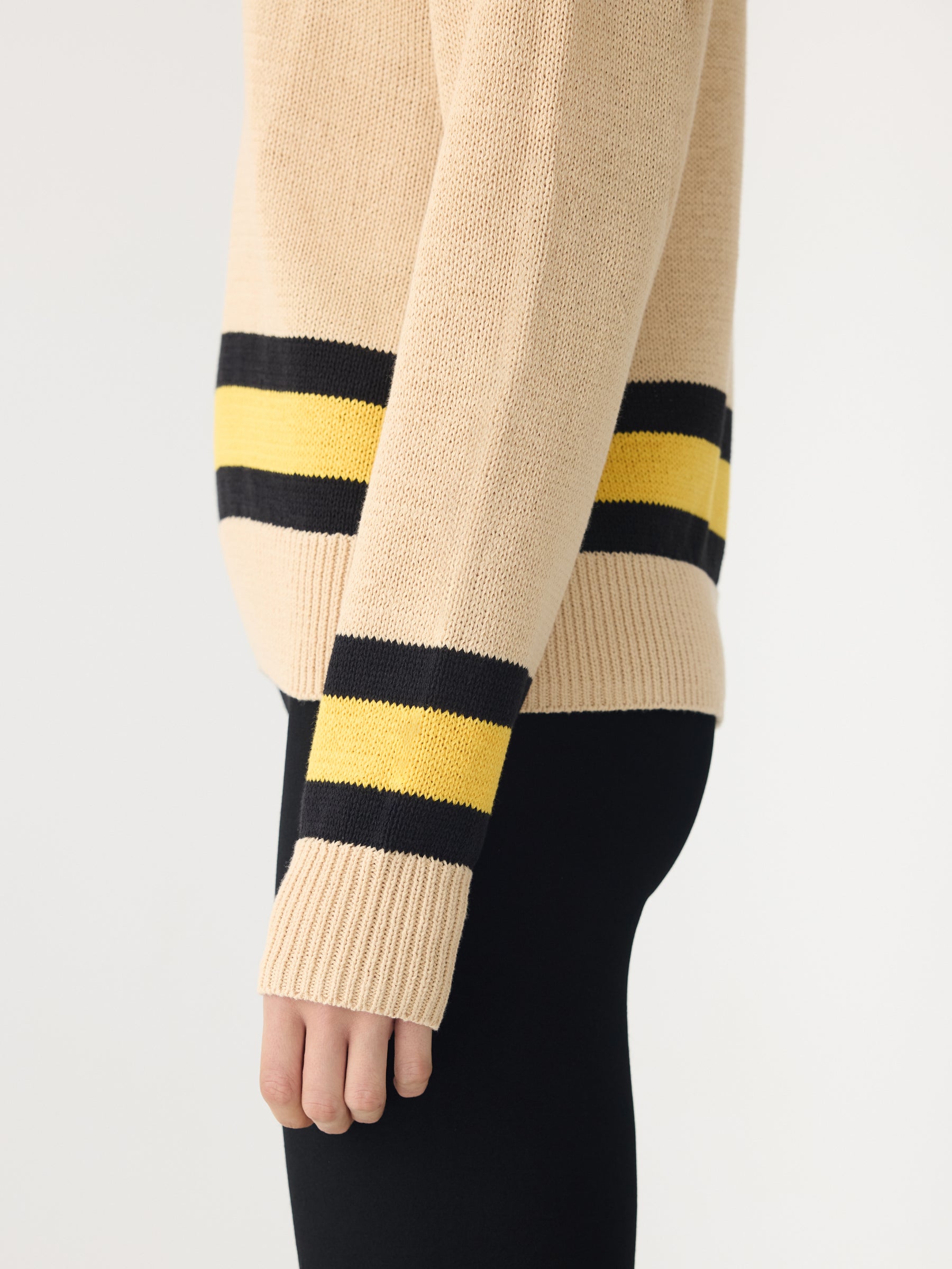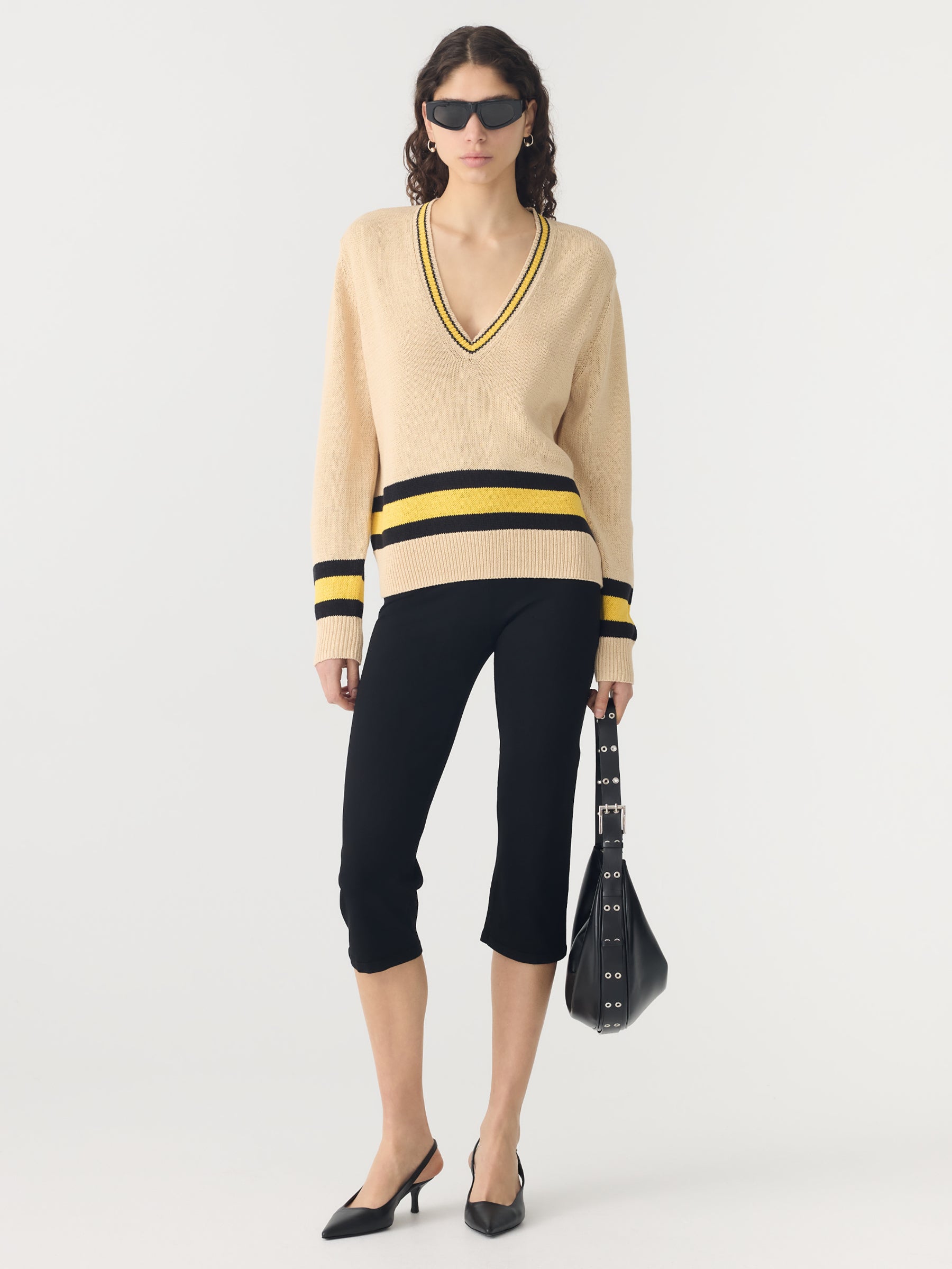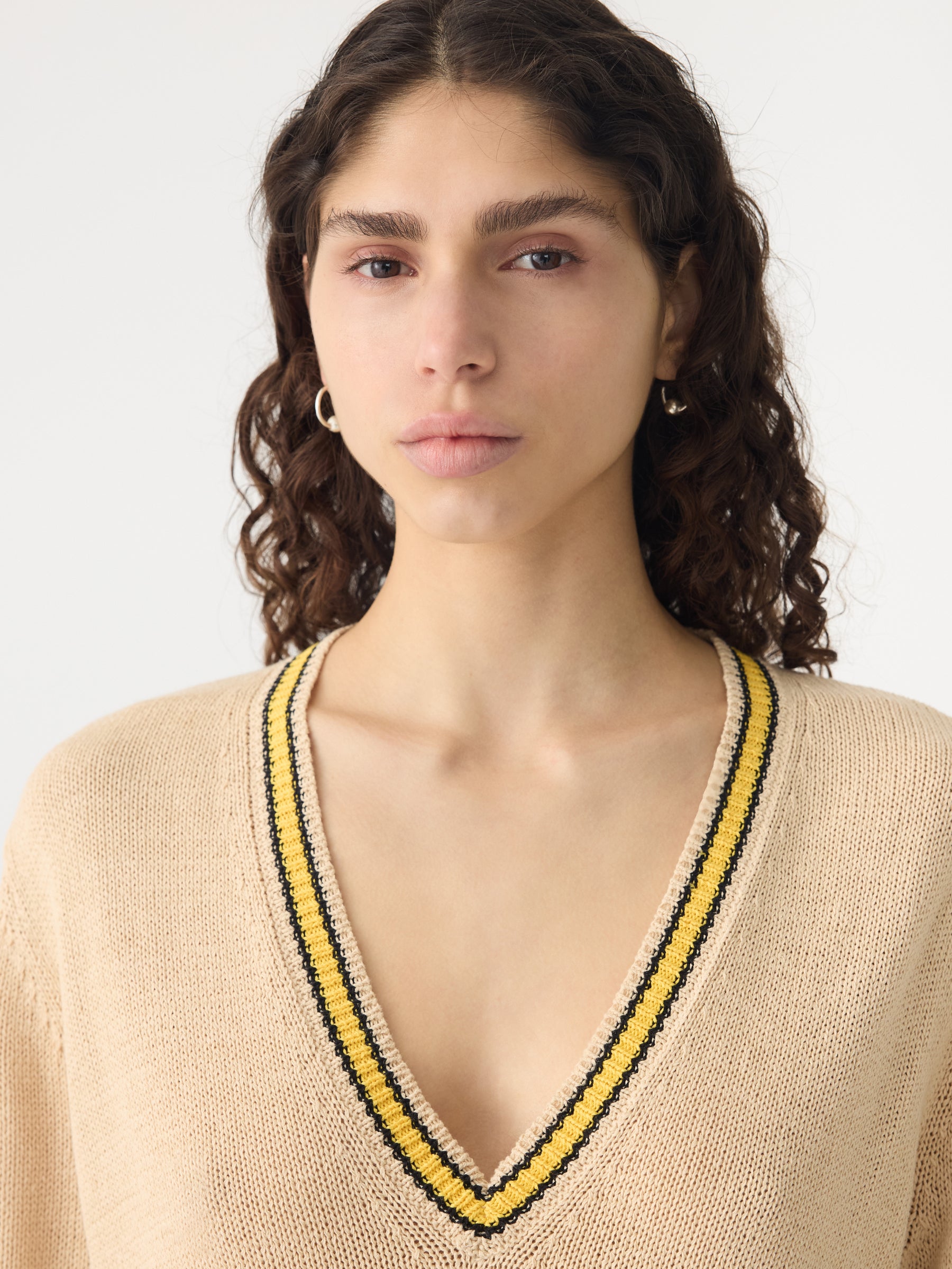 Relaxed V-neck knit crafted in a cotton linen blend. Designed with contrast stripe detailing at the neckline, cuffs and hem, and finished with rib trims for subtle structure.