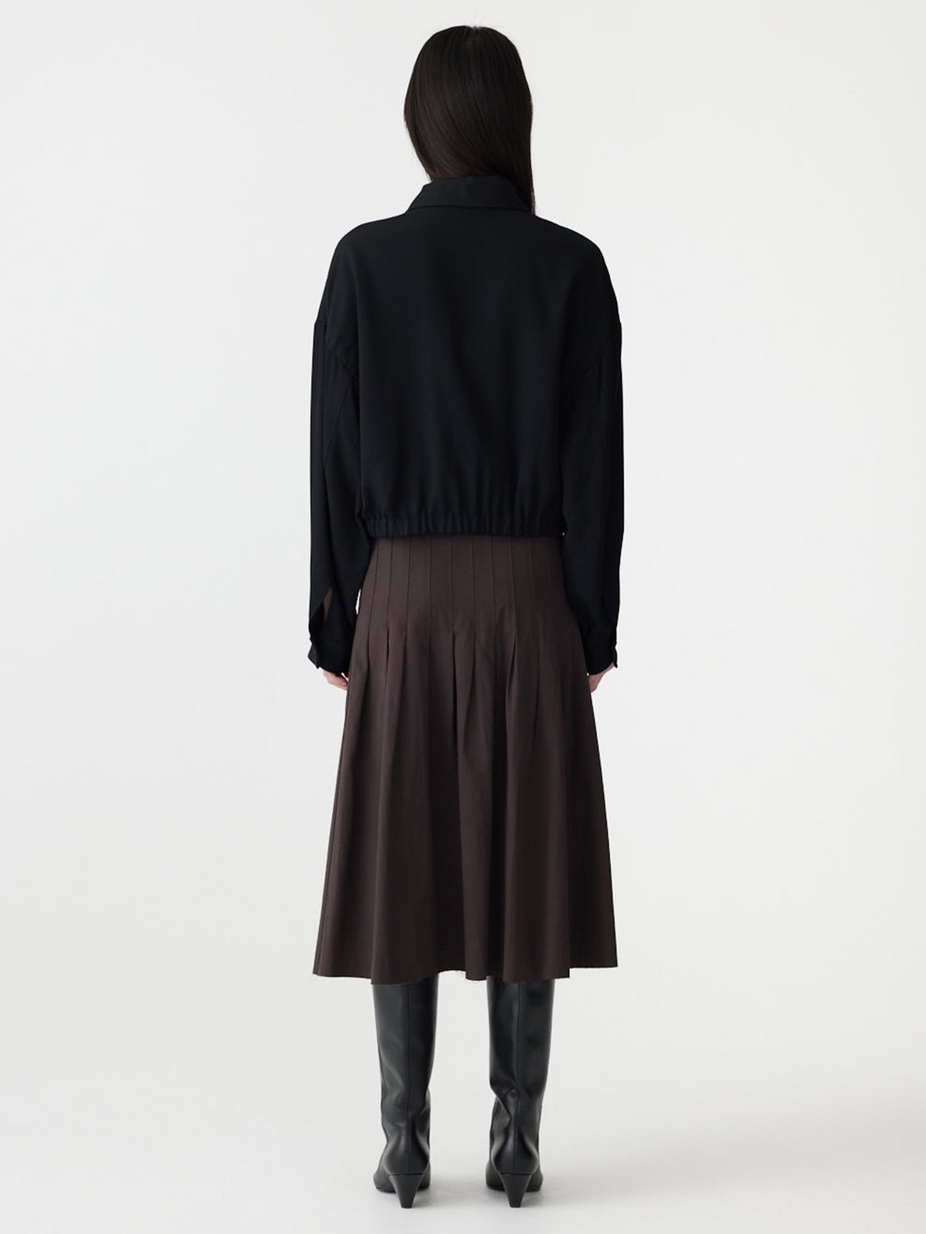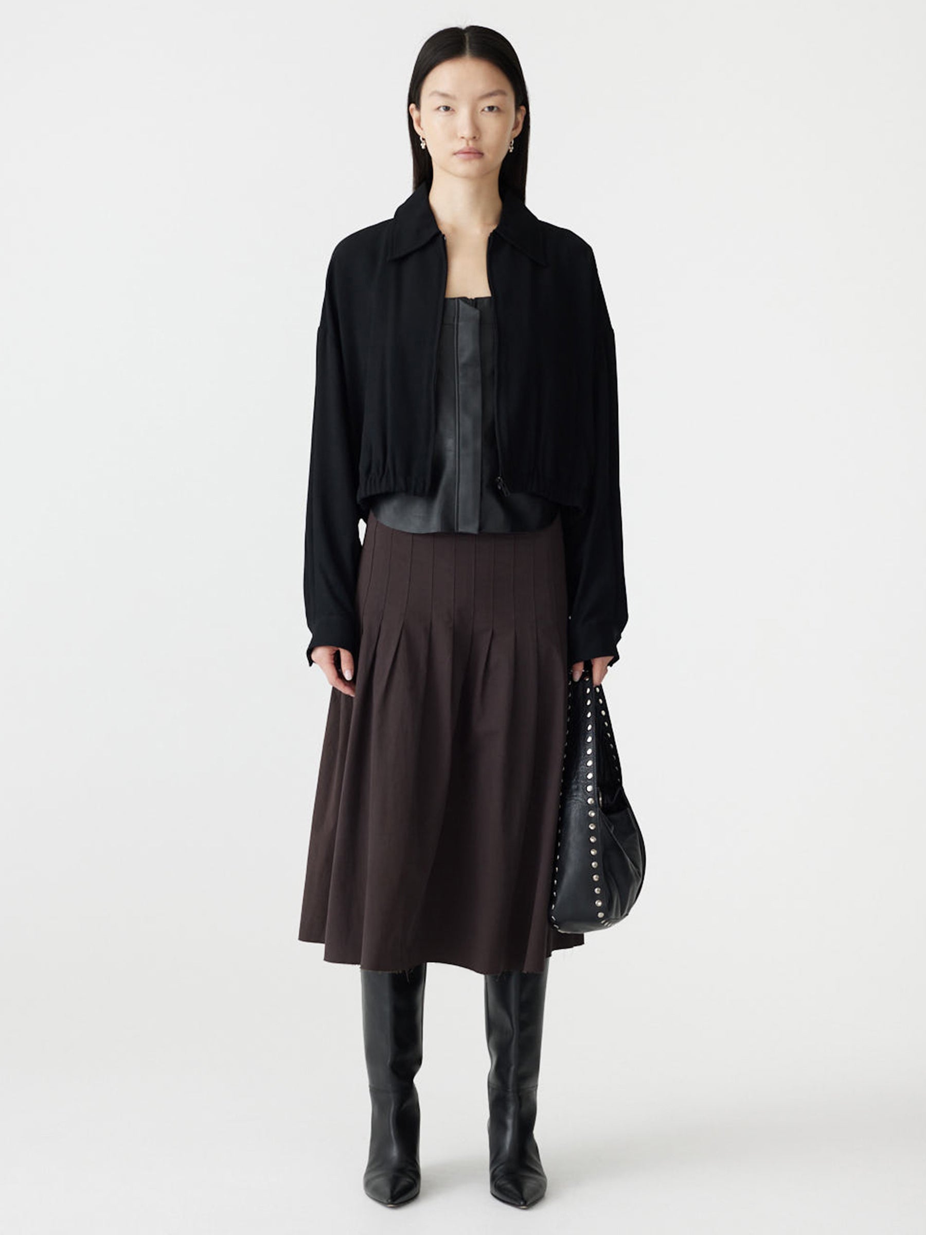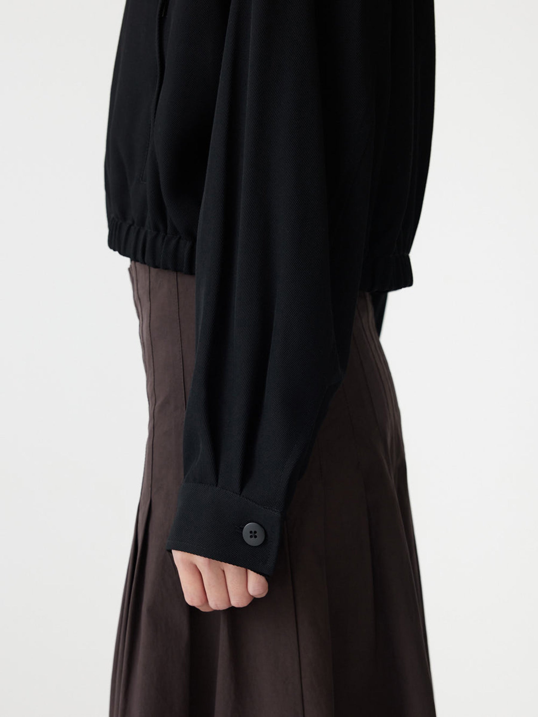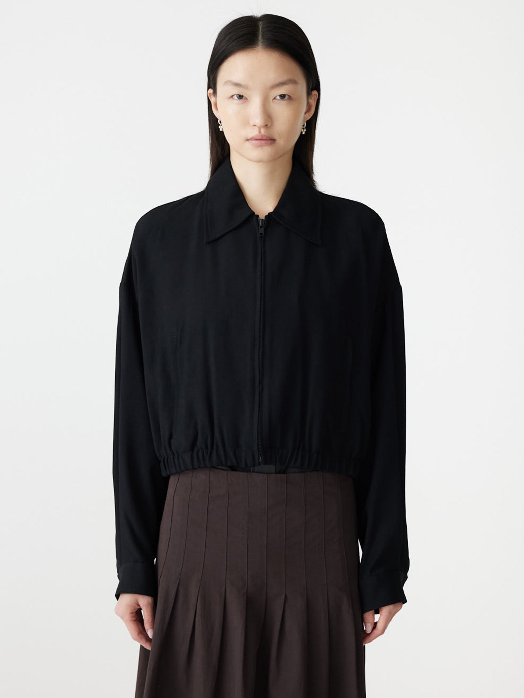 The Cropped Twill Jacket is a zip-up style designed with a clean, modern silhouette. Featuring front zippered welt pockets, an elasticated hem for subtle shape, and buttoned sleeve cuffs. Finished with an internal jet pocket and fully lined for structure and ease. Crafted from Italian raised twill viscose crepe, offering a soft drape with a refined, contemporary feel.