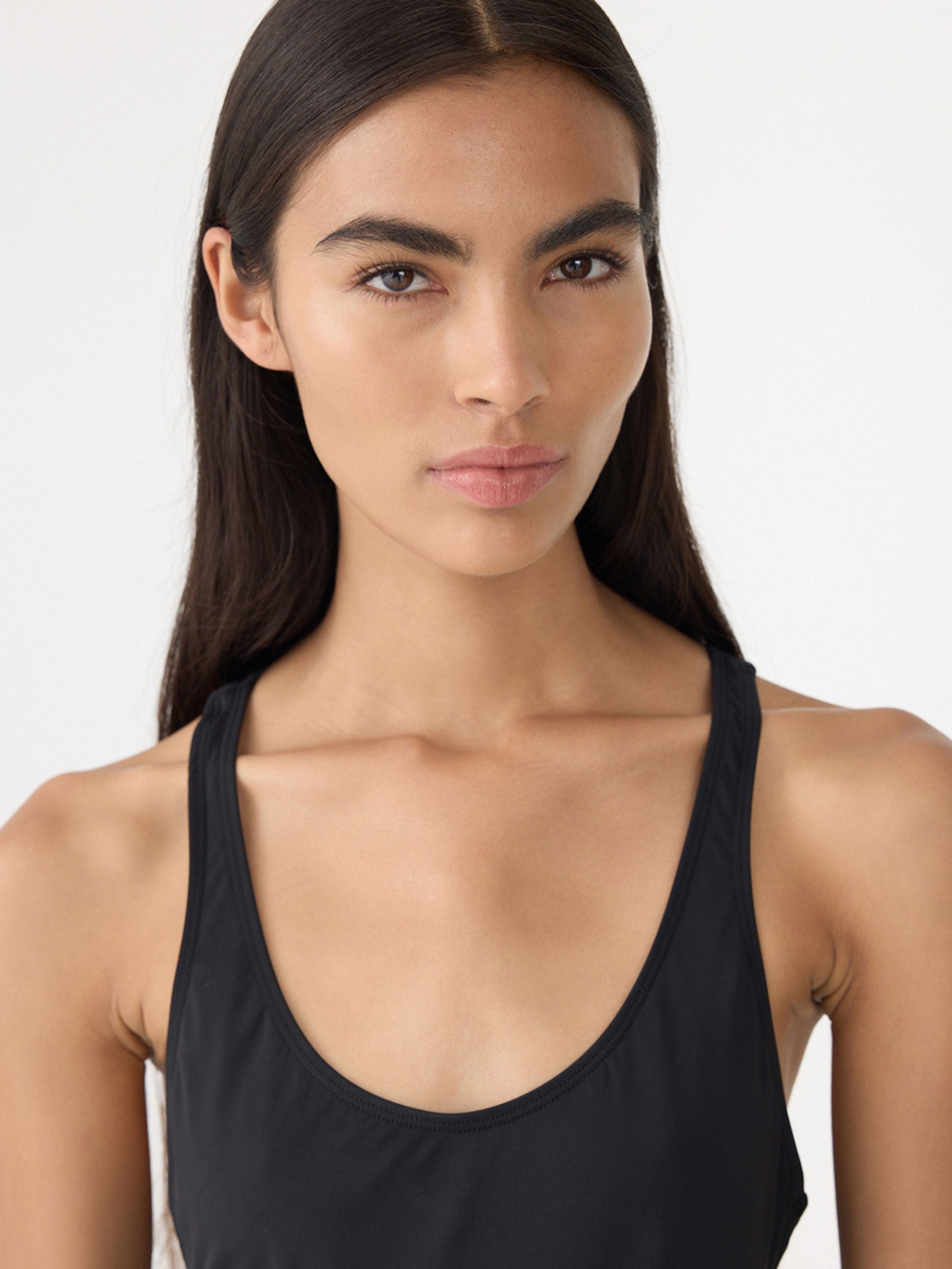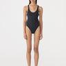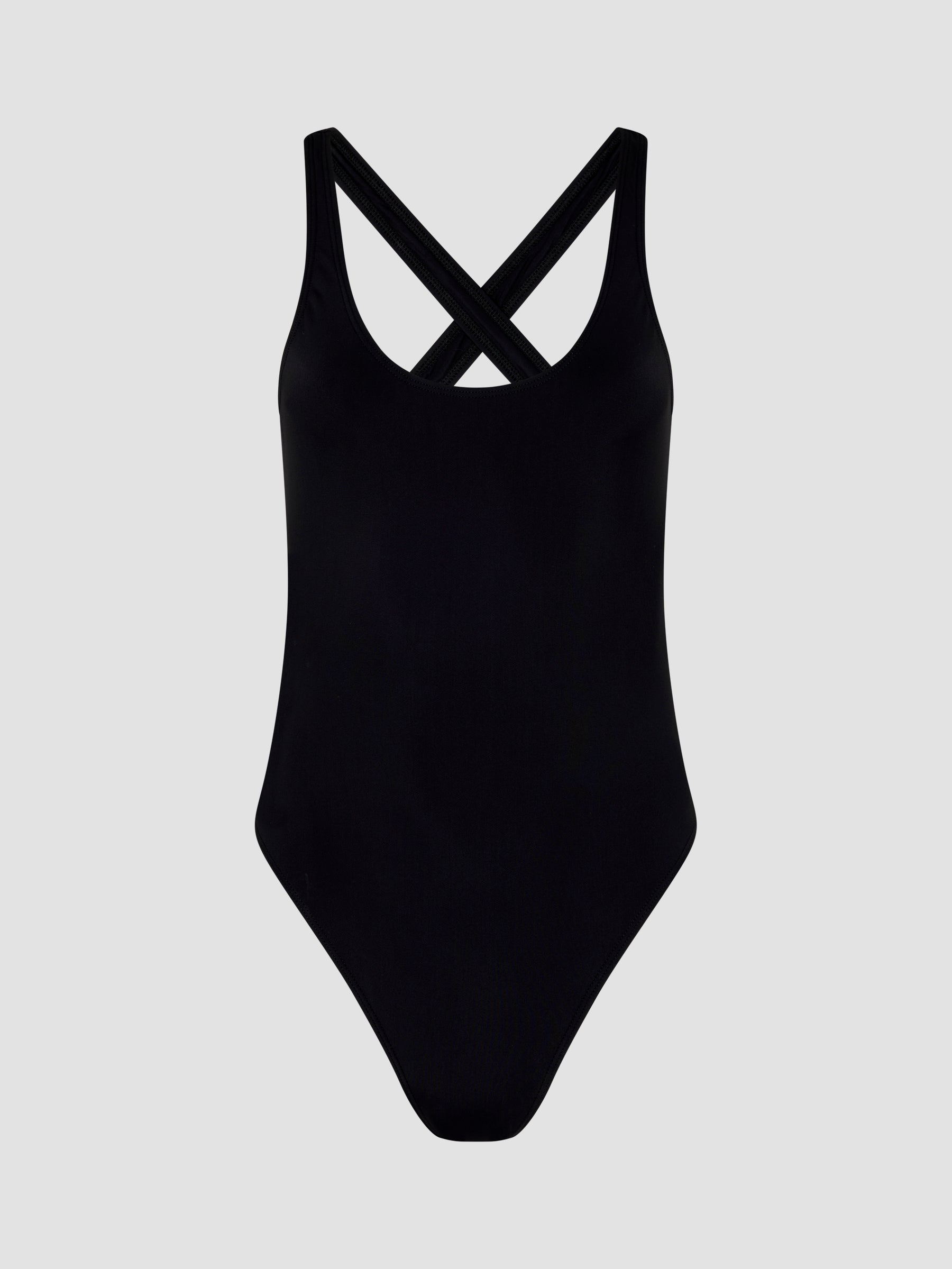 Cross Back One Piece crafted from Italian stretch swimwear fabric. Designed with thick straps that cross at the back, a high-cut leg, and medium coverage for a streamlined, supportive fit.