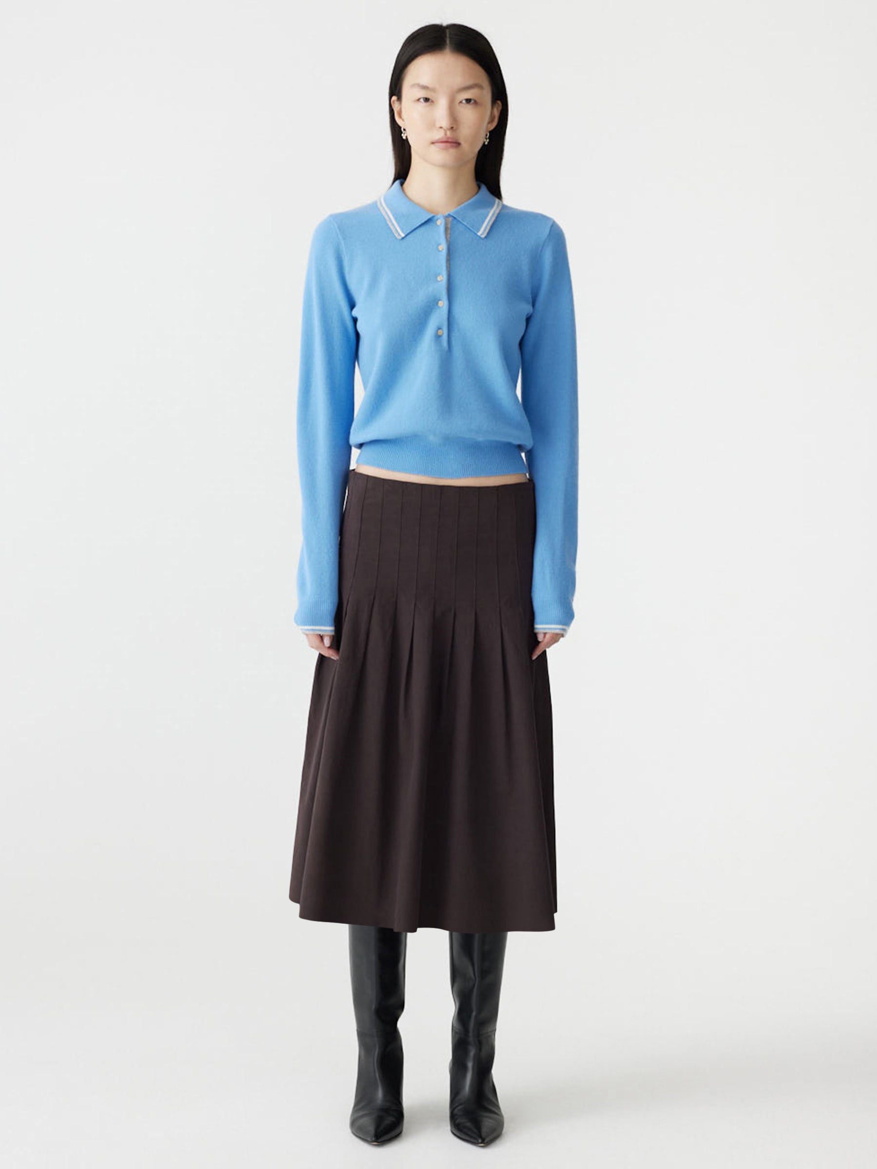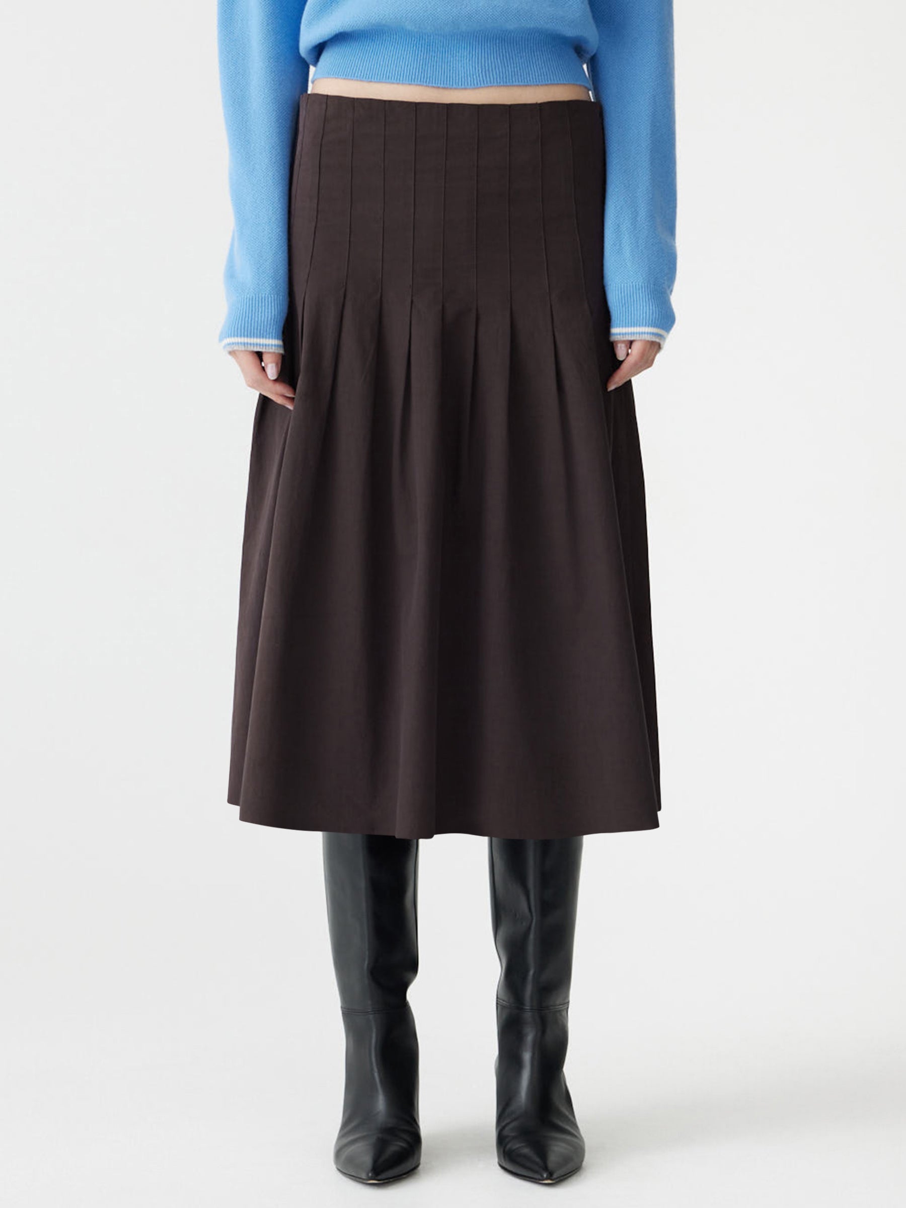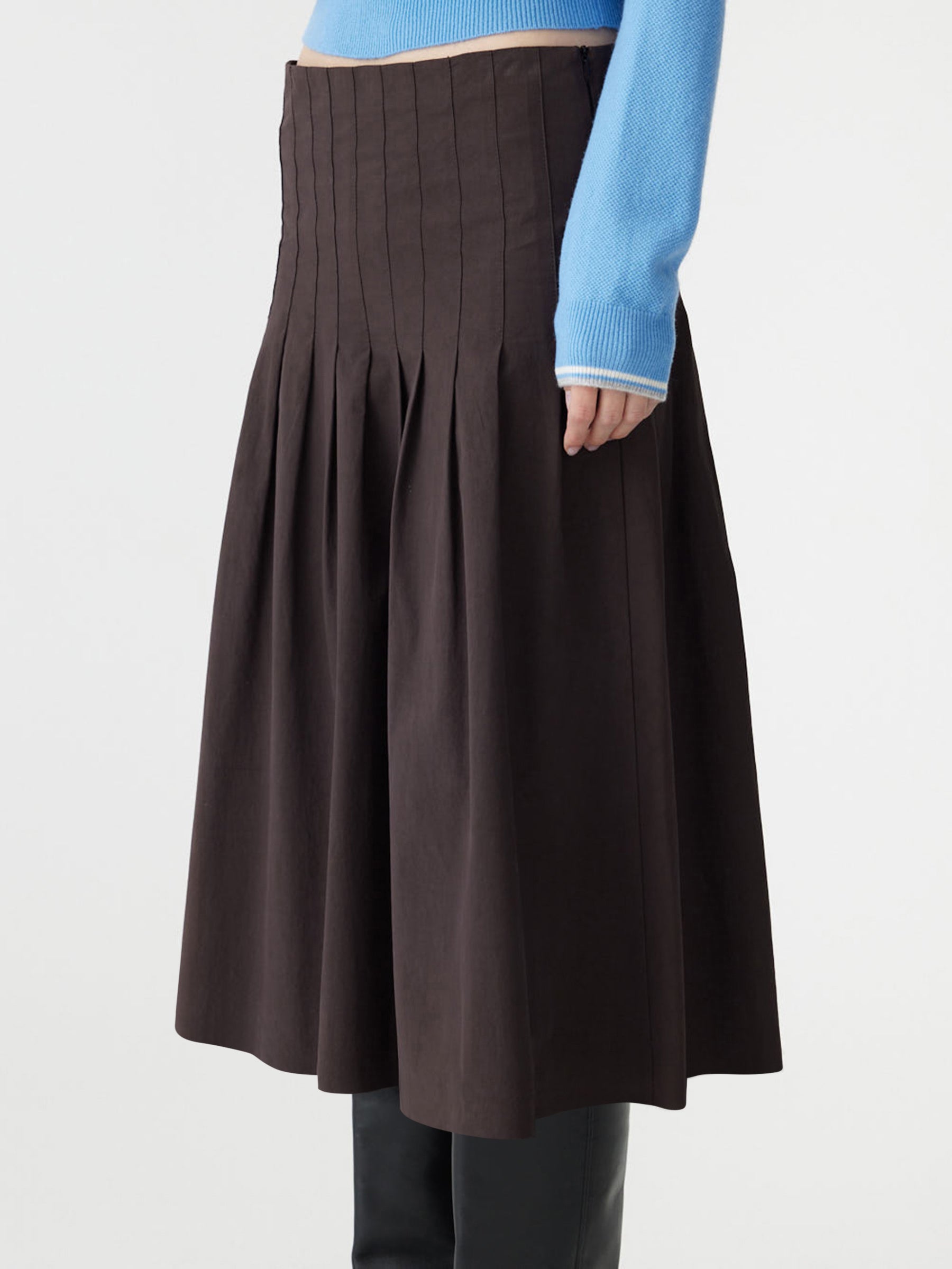 A seasonal essential, the Crushed Cotton Pleated Skirt is crafted from a softly crushed cotton, chosen for its lightweight feel and ability to hold shape. Designed for a regular fit in a midi-length silhouette, this bandless pleated style features in-stitched pleats for clean structure and a side zip closure. Finished with a minimal internal hip-facing along the top edge for subtle structure.