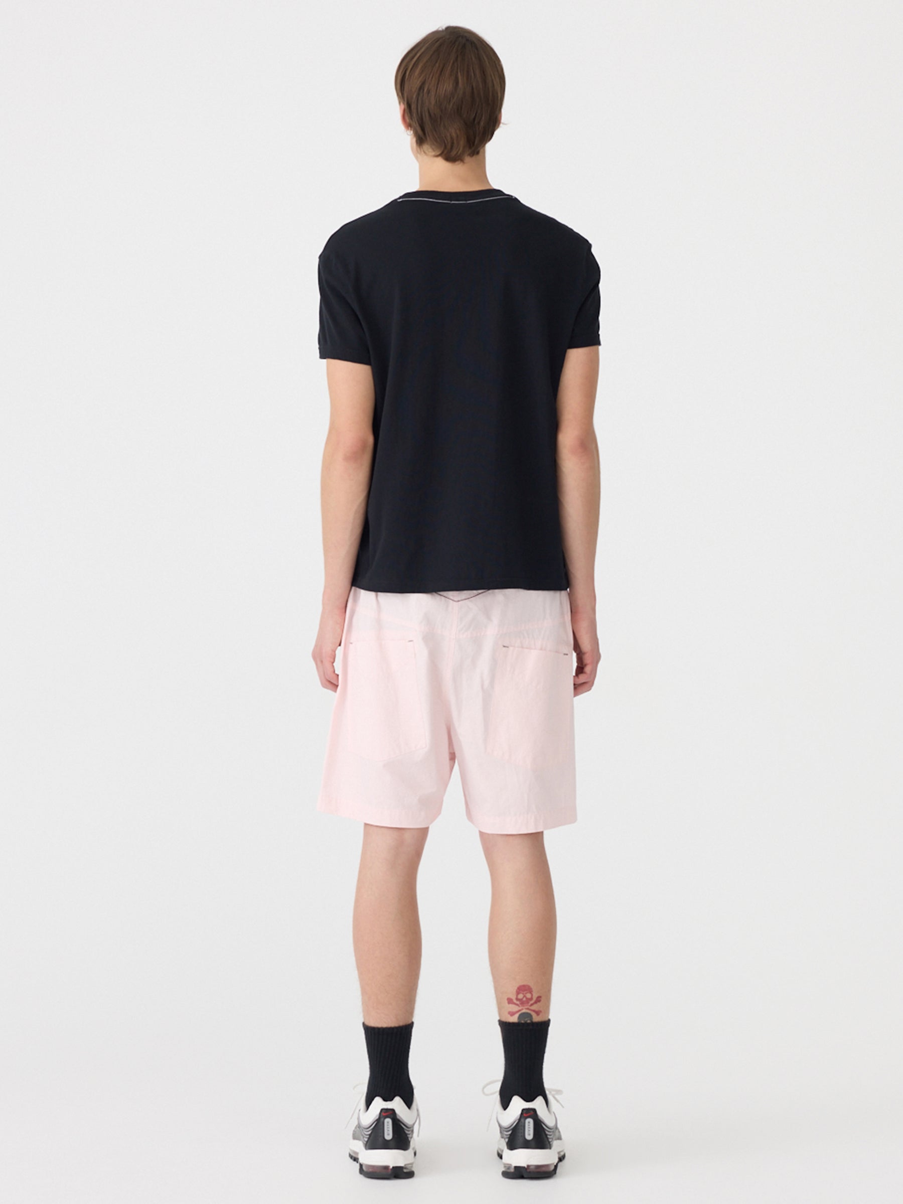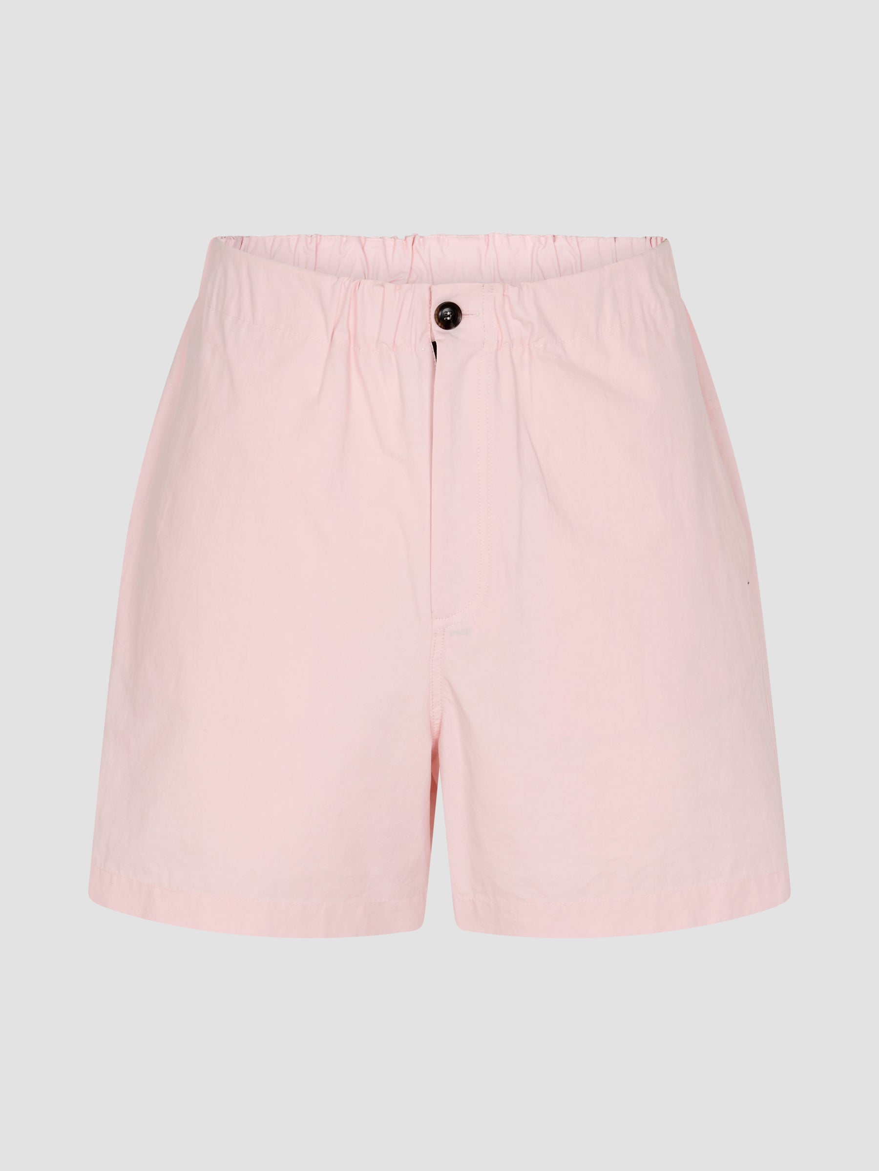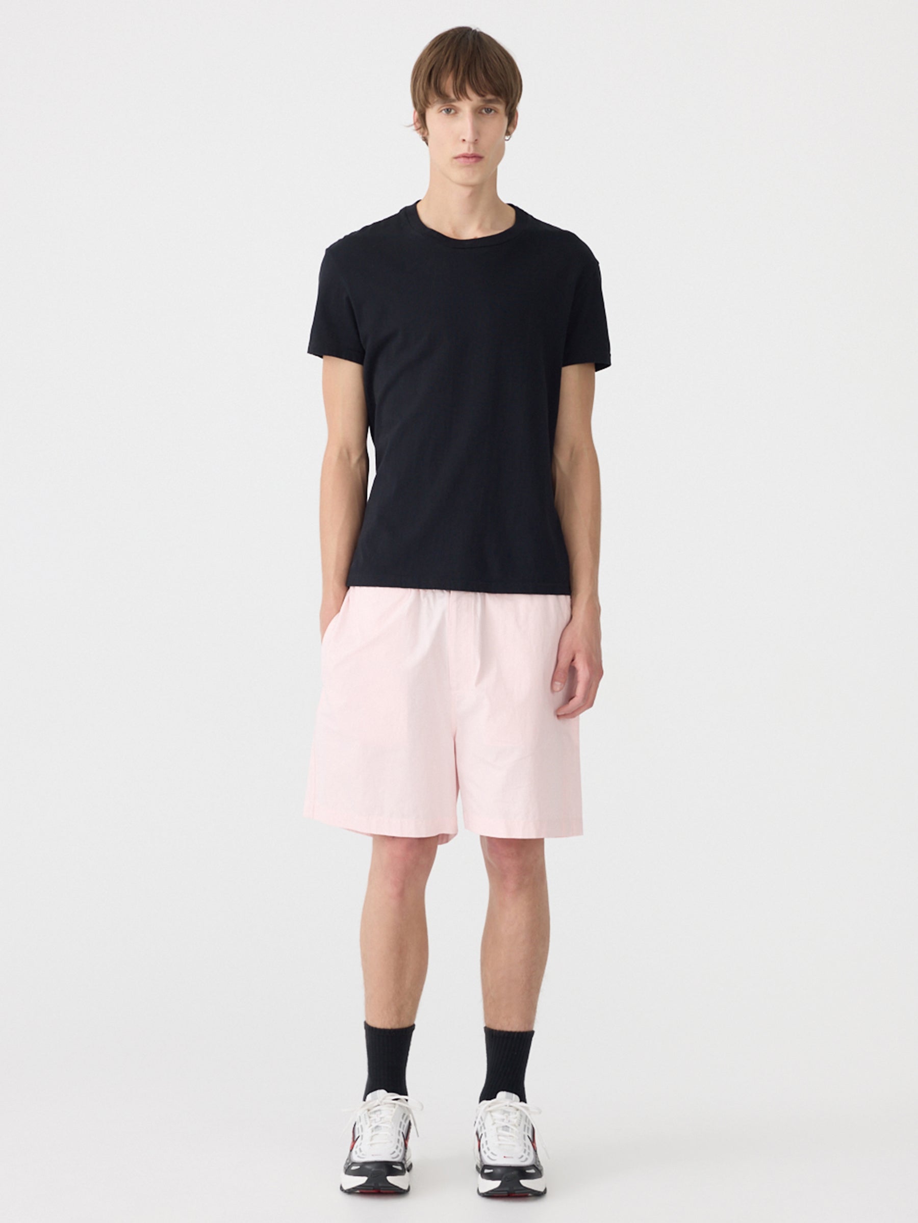 Relaxed fit pull-on short featuring button and zip closure, with an elasticated waistband for ease. Designed with side entry pockets finished with envelope stitch detailing, a back yoke, and back patch pockets. Crafted from lightweight compact cotton with a naturally crushed look and soft hand feel.