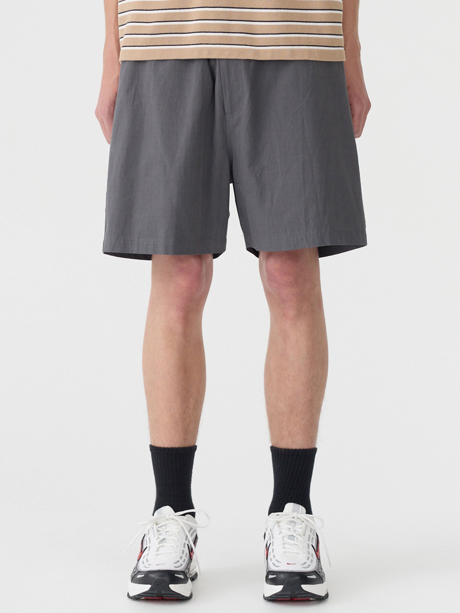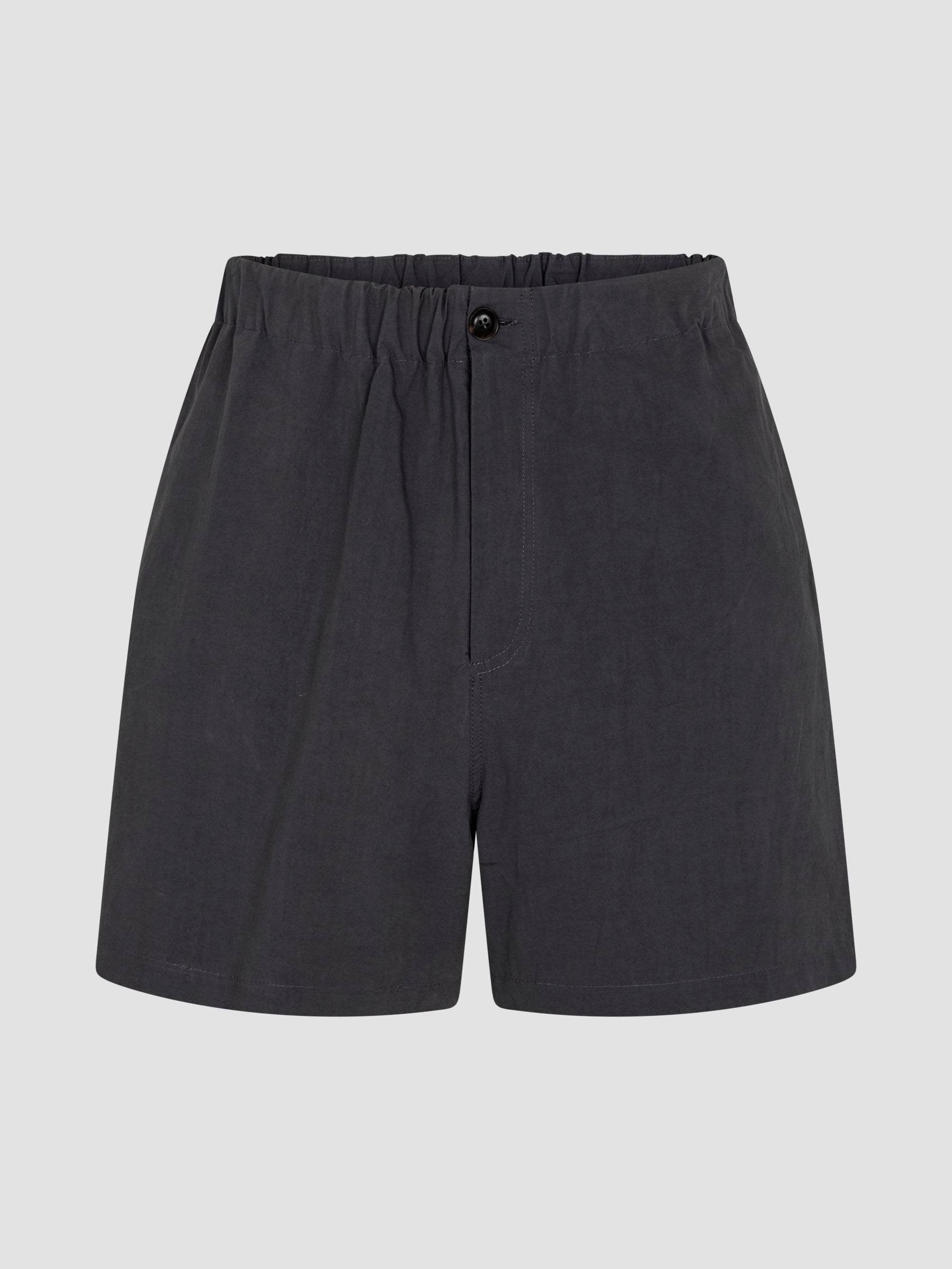 Relaxed fit pull-on short featuring button and zip closure, with an elasticated waistband for ease. Designed with side entry pockets finished with envelope stitch detailing, a back yoke, and back patch pockets. Crafted from lightweight compact cotton with a naturally crushed look and soft hand feel.