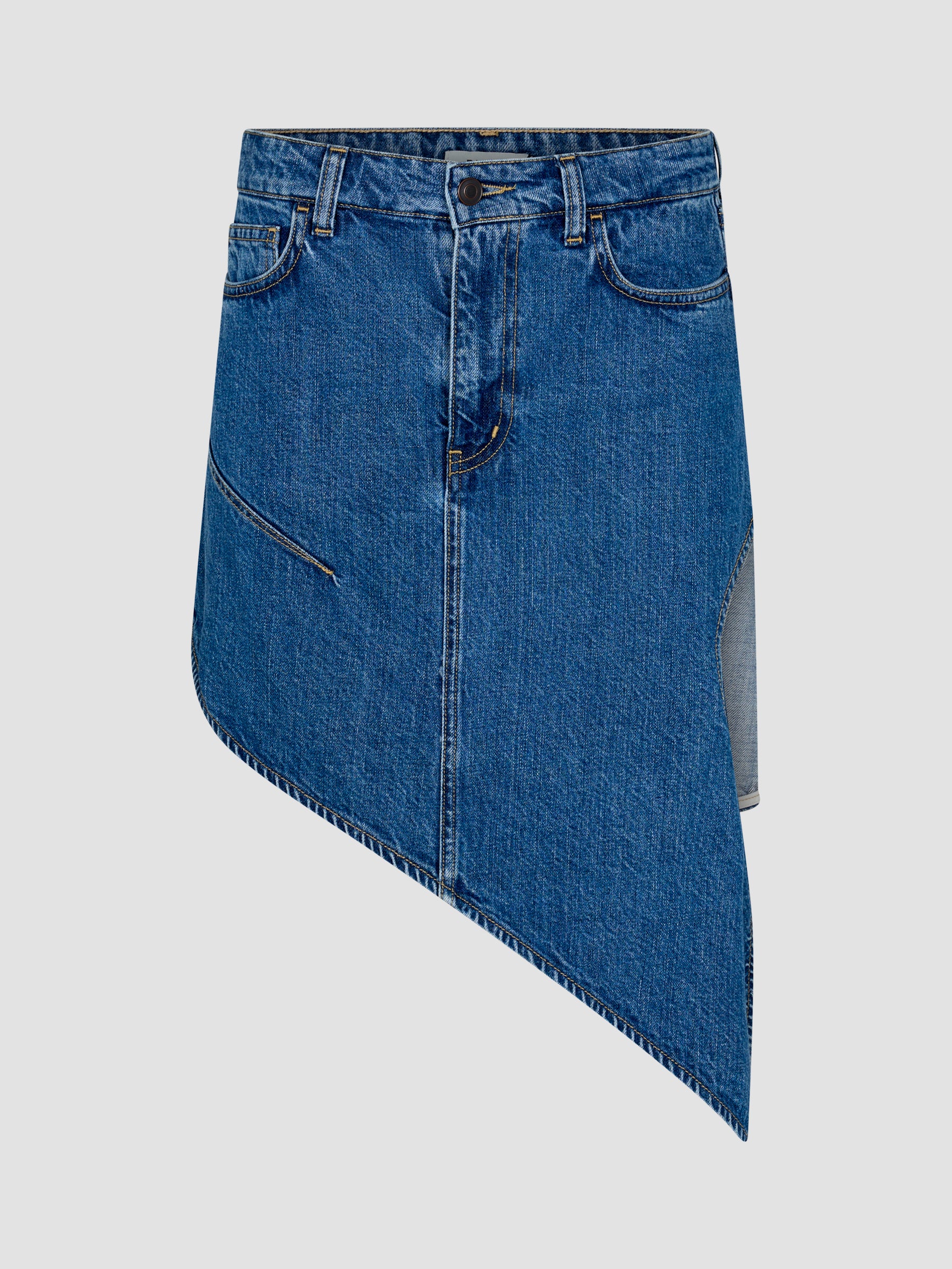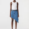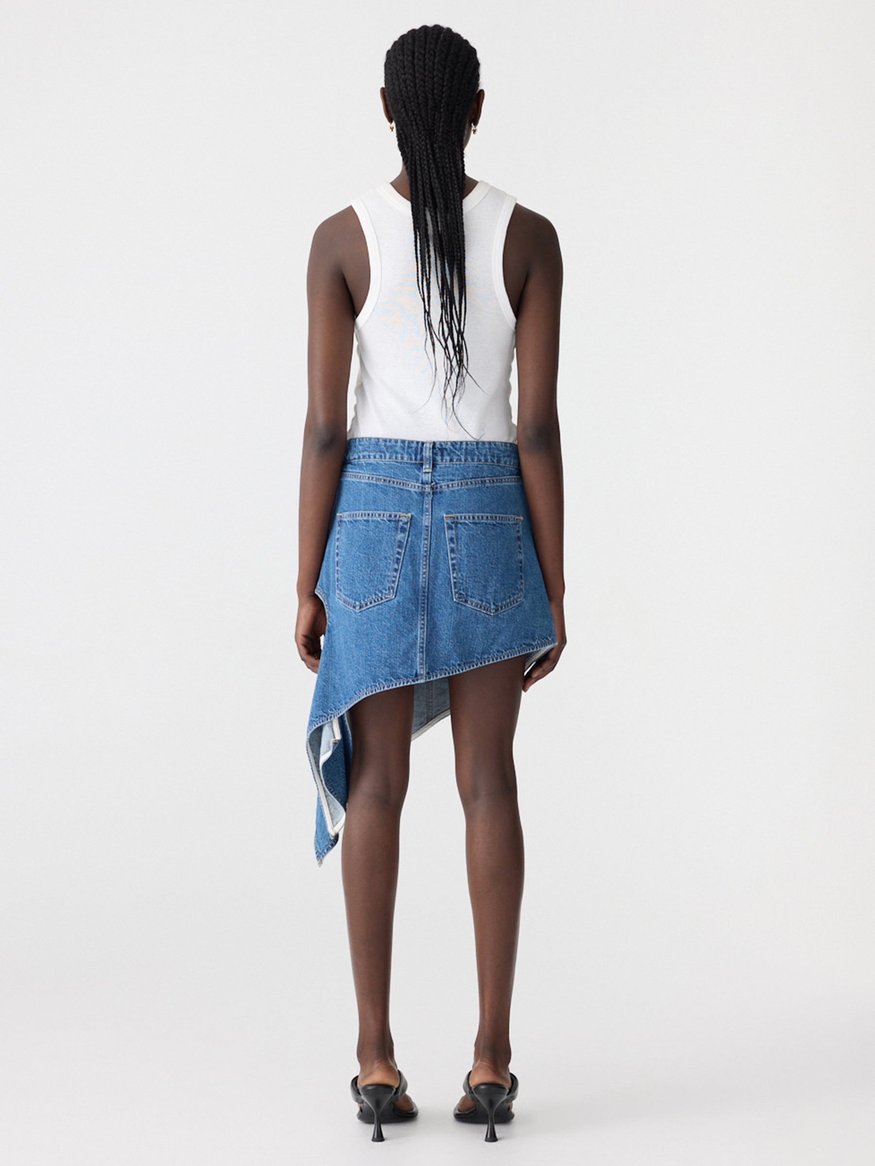 Crafted from midweight Japanese denim, theDeconstructed Denim Skirt designed as a multifunctional style. Designed with contrast topstitching, subtle dart detailing at the front and an angular hemline with a cut-out at the left side seam for a modern finish.