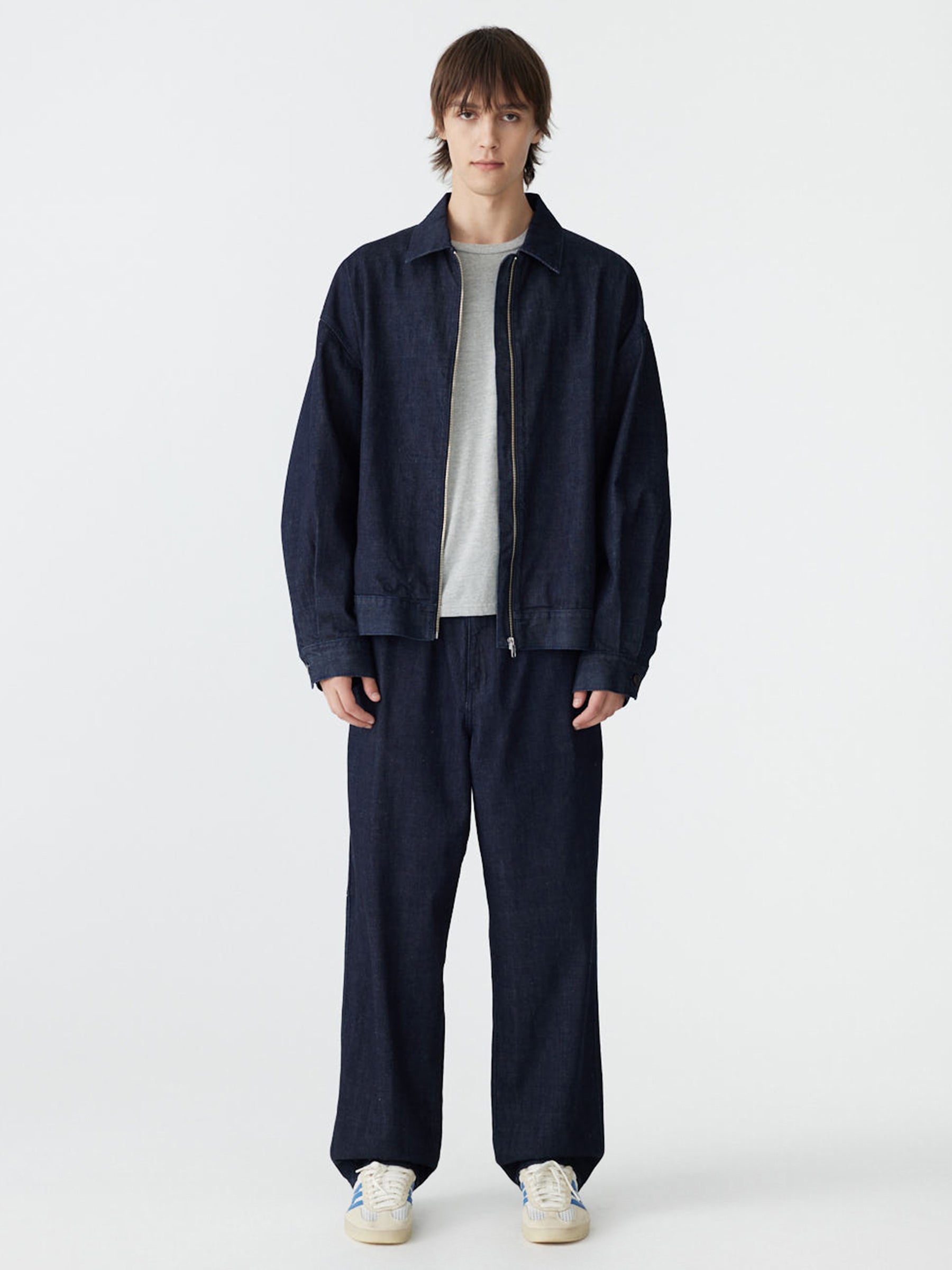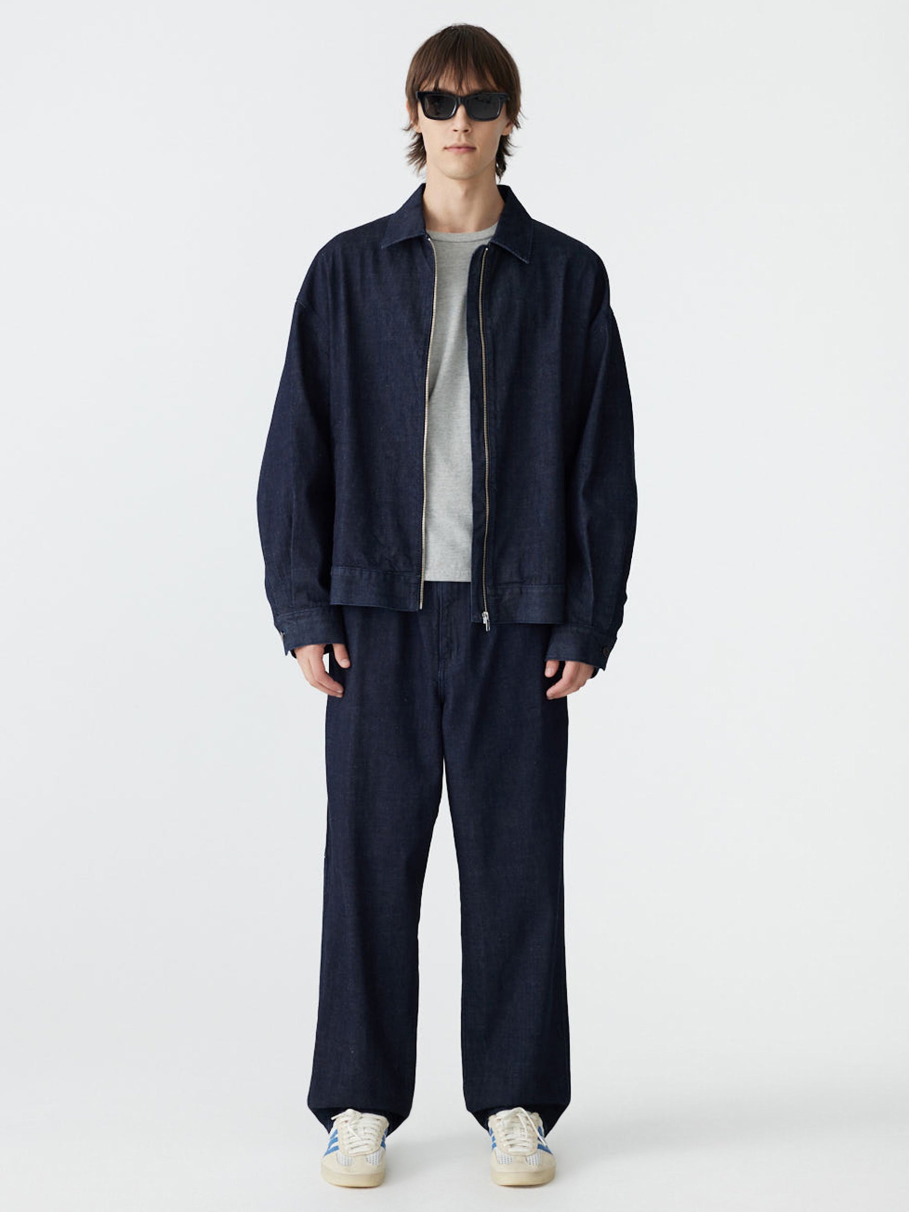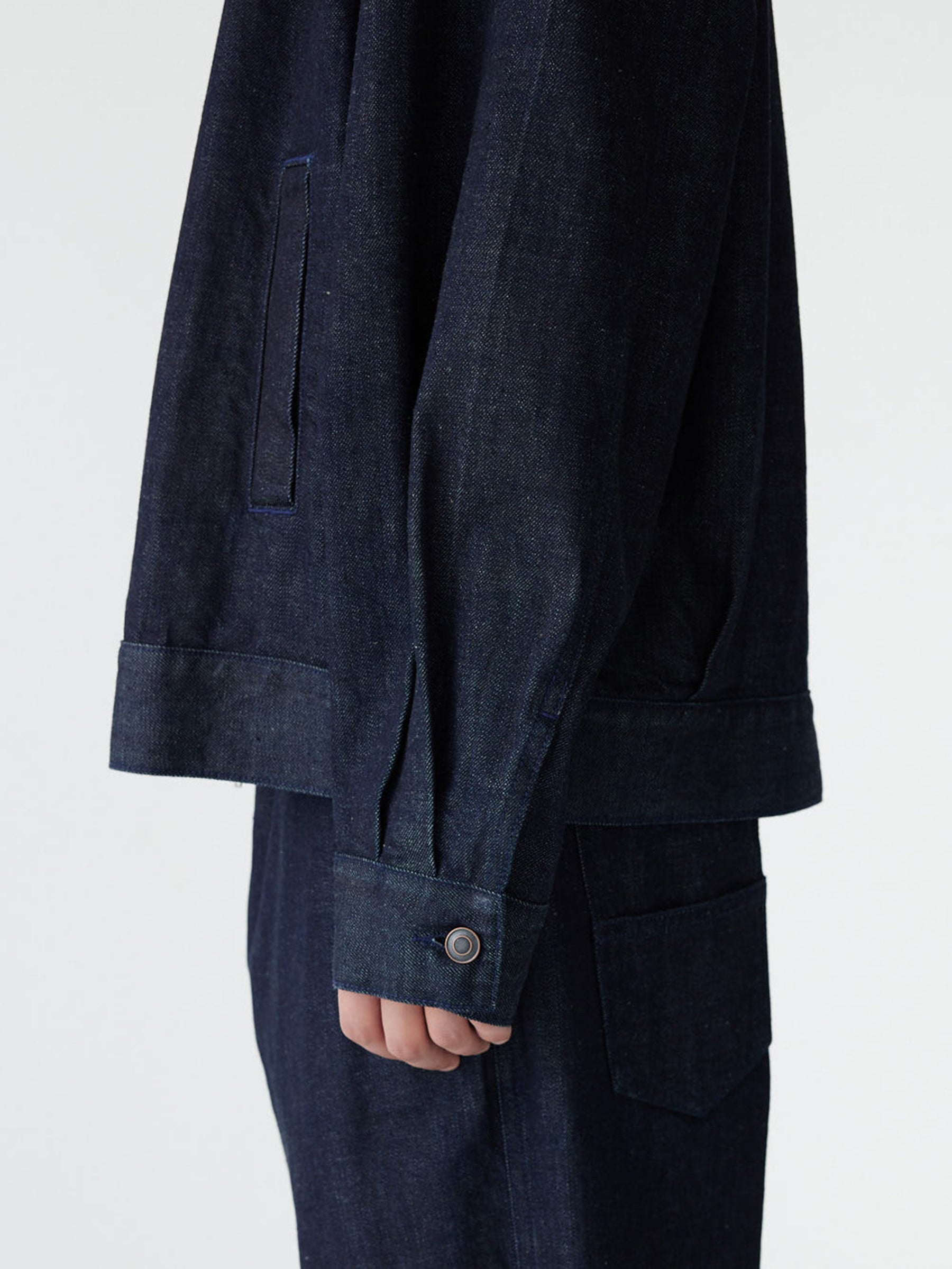 The Denim Zip Up Jacket is a clean, utility-inspired style designed with a refined, modern silhouette. Featuring a zip-through front with collar and half stand, finished with front welt pockets and buttoned cuffs. A separate hem band with tuck detailing at the back adds subtle shape, while an internal denim patch with visible external topstitching at the centre back neck provides a considered finish. Crafted from mid-weight organic cotton twill woven in Japan.