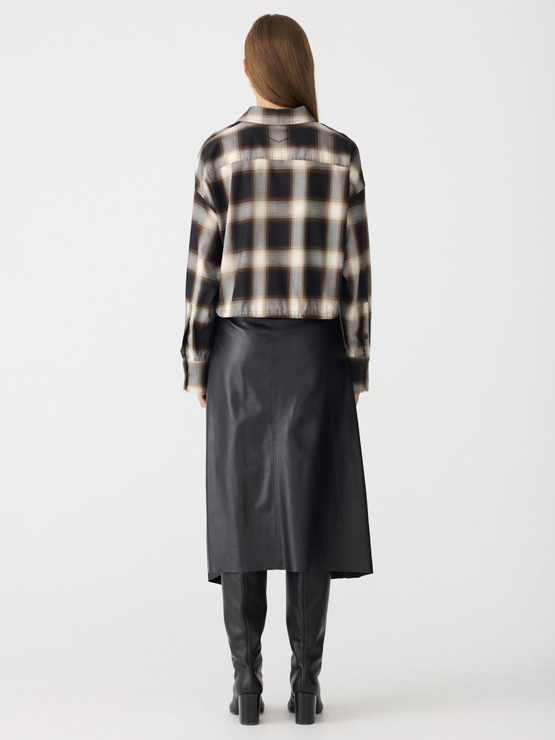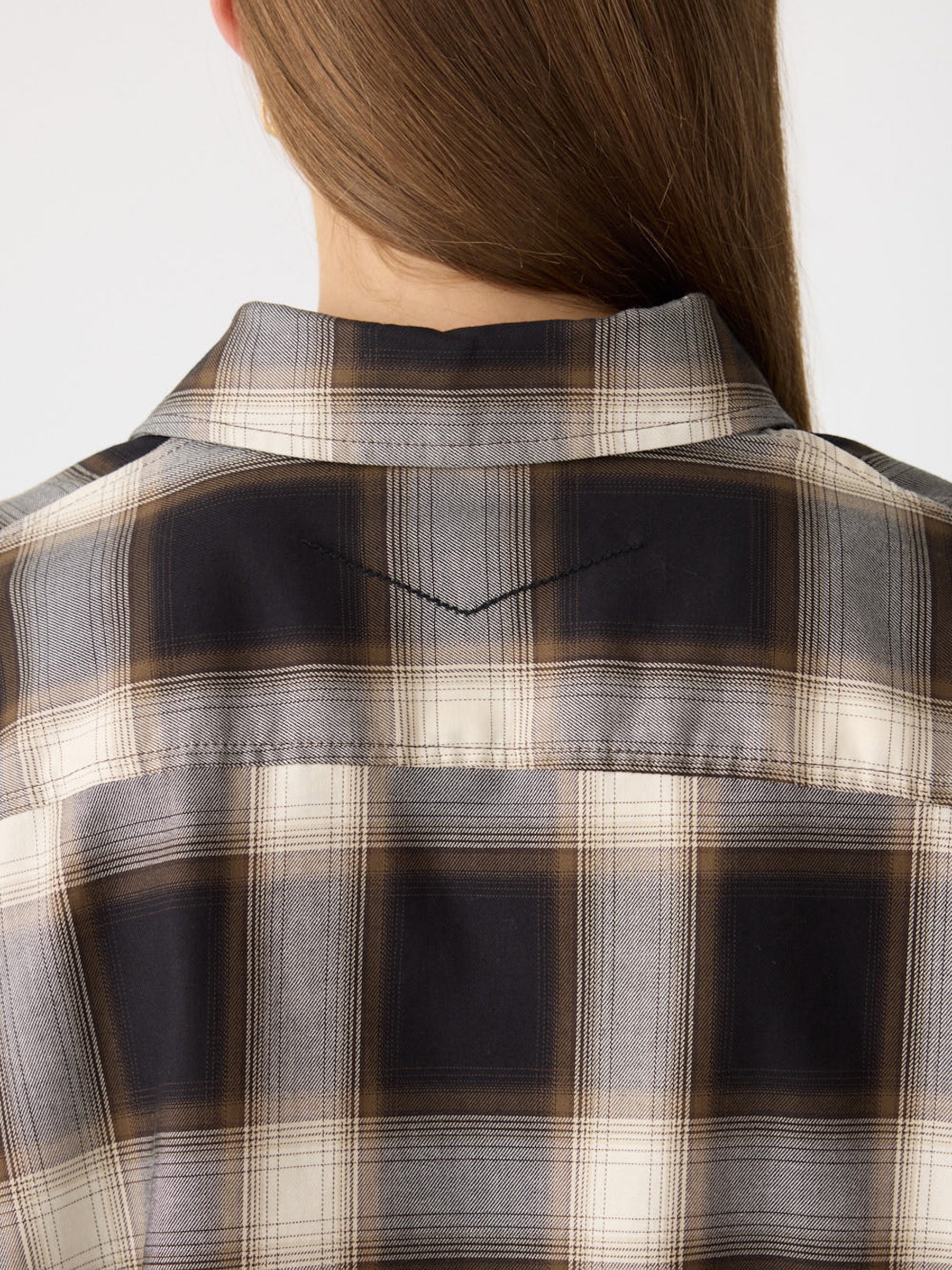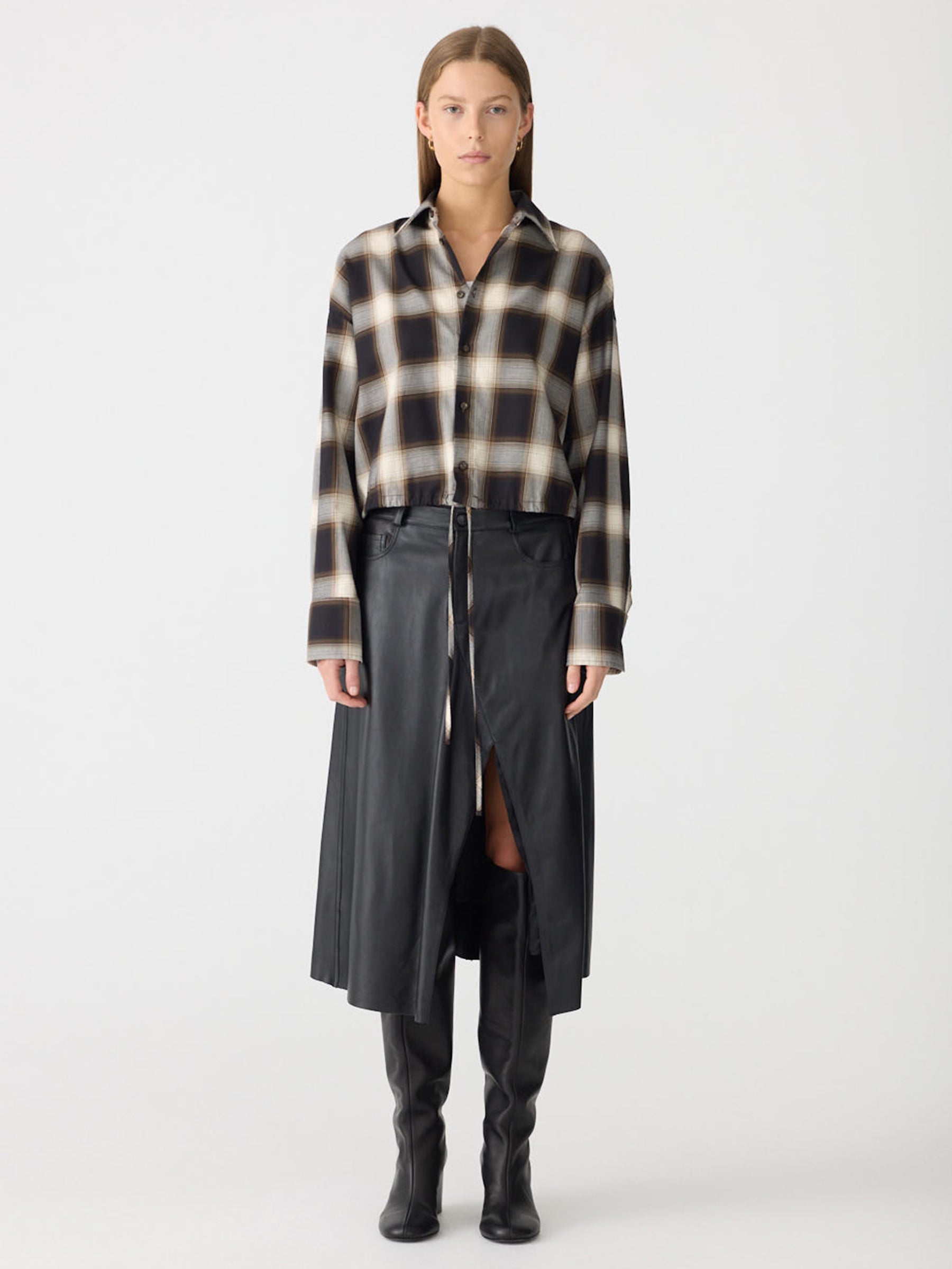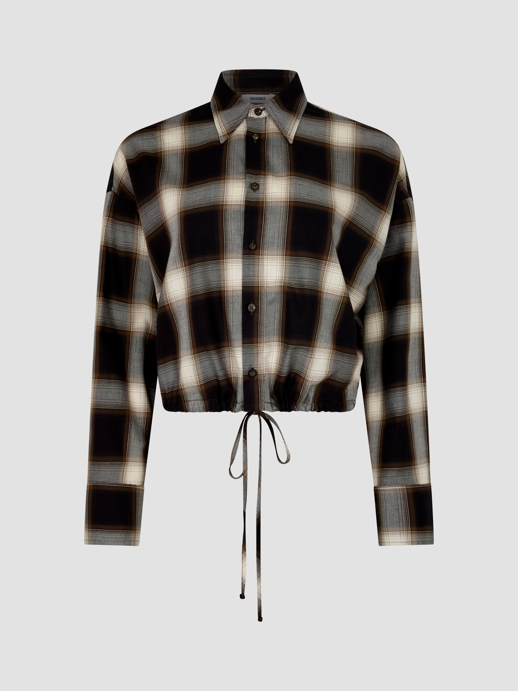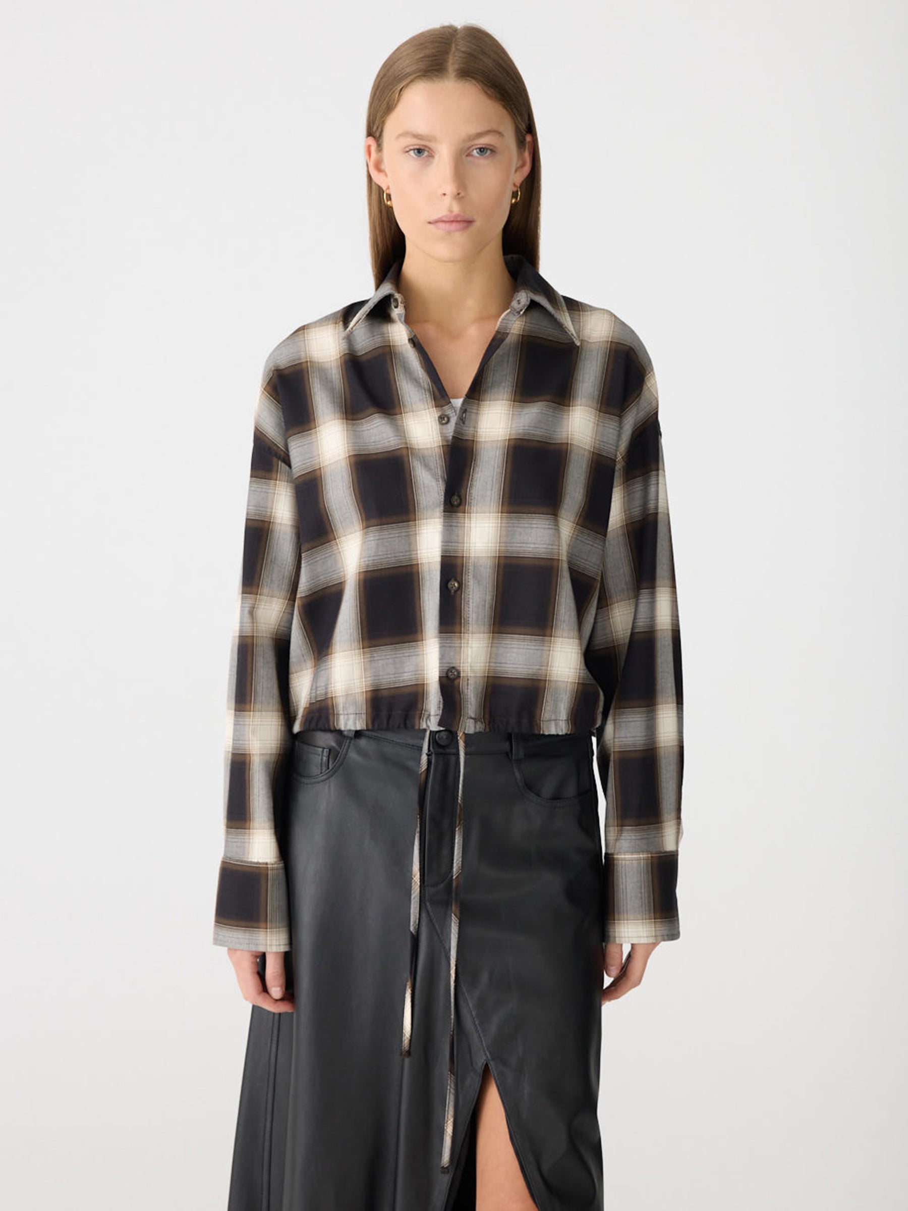 The Drawstring Check Shirt is a relaxed style designed with a boxy, cropped silhouette. Crafted from soft cotton with a drapey handfeel, this piece features a large check pattern and a drawstring hem that can be cinched for a more sculpted shape. Finished with a front placket and tortoise shell buttons.