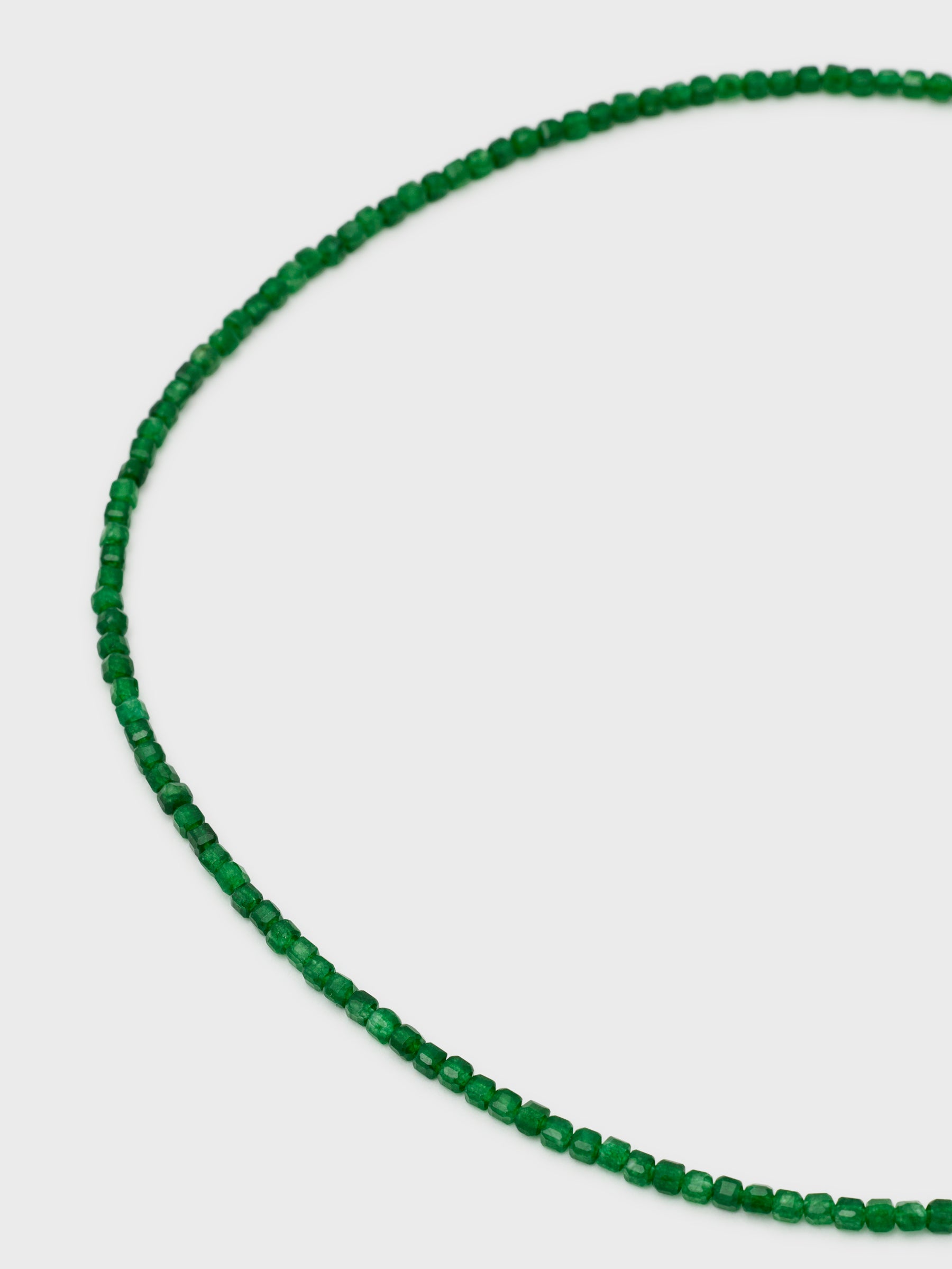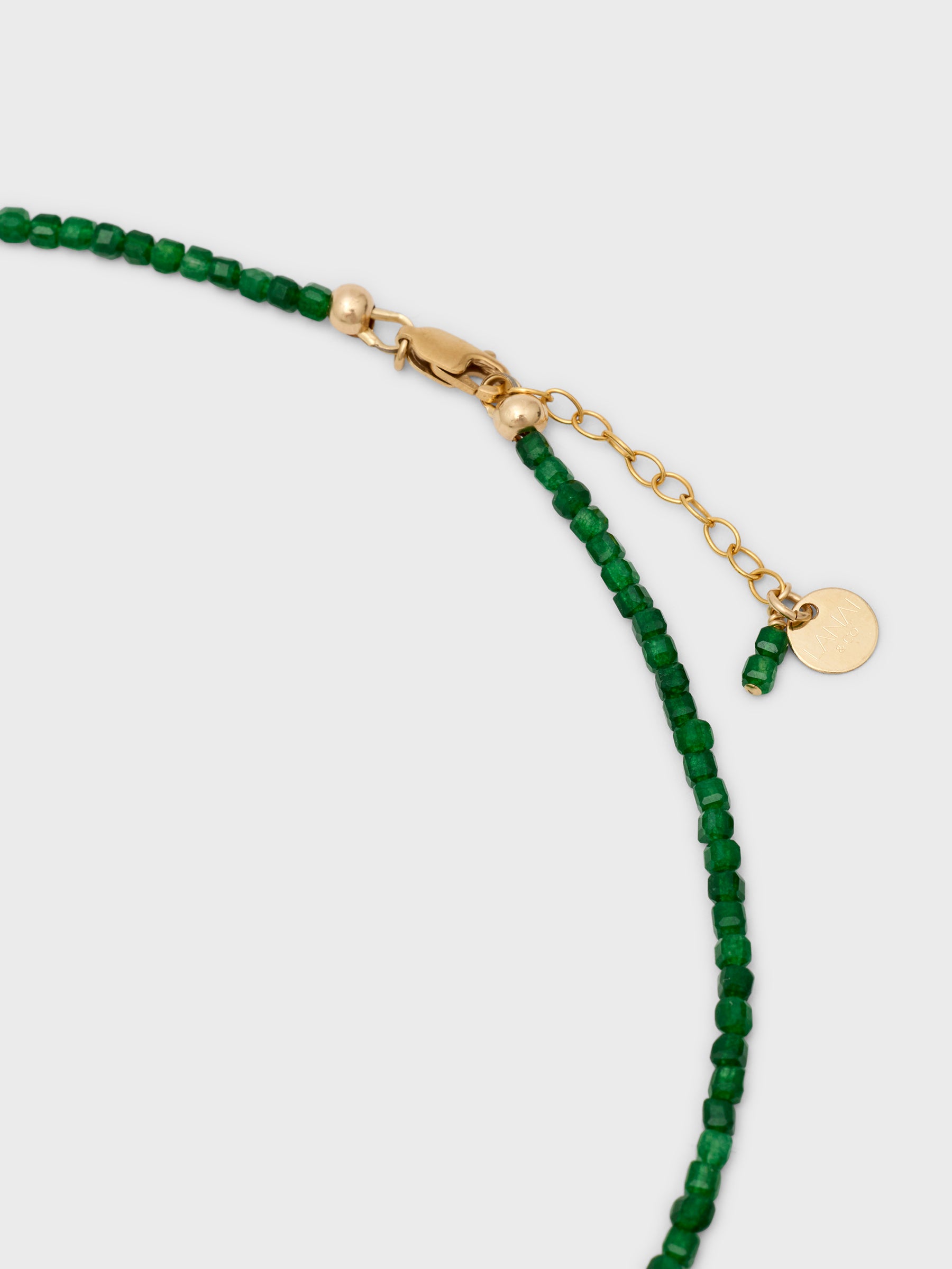 Hand-beaded in faceted green jade, this necklace showcases naturally varied tones of deep and soft greens, highlighting the unique character of each bead. Finished with a 14k gold-filled clasp closure and crafted using ethically sourced materials. Subtle irregularities in colour and texture celebrate the natural form of the stone. Faceted green jade beads