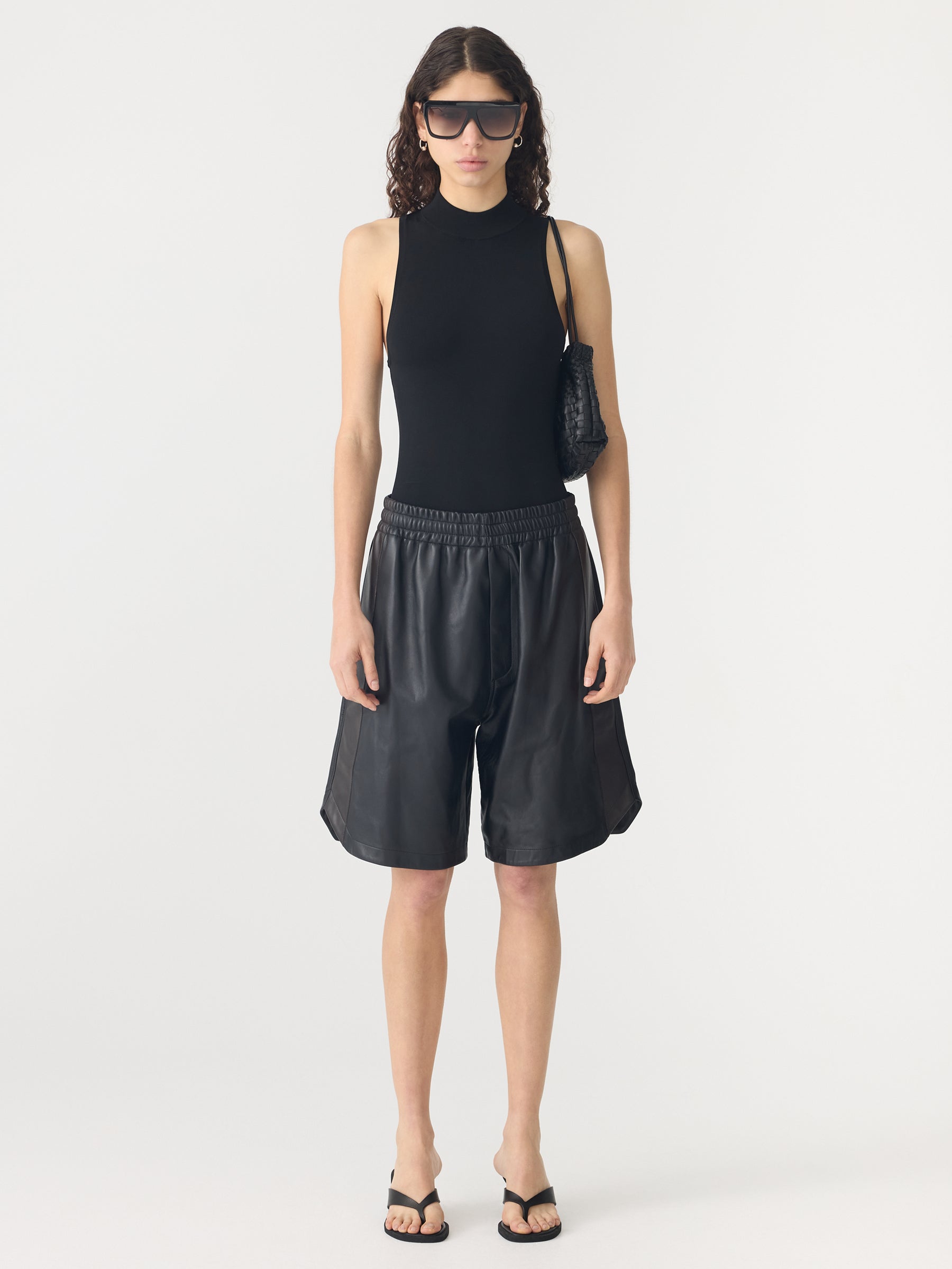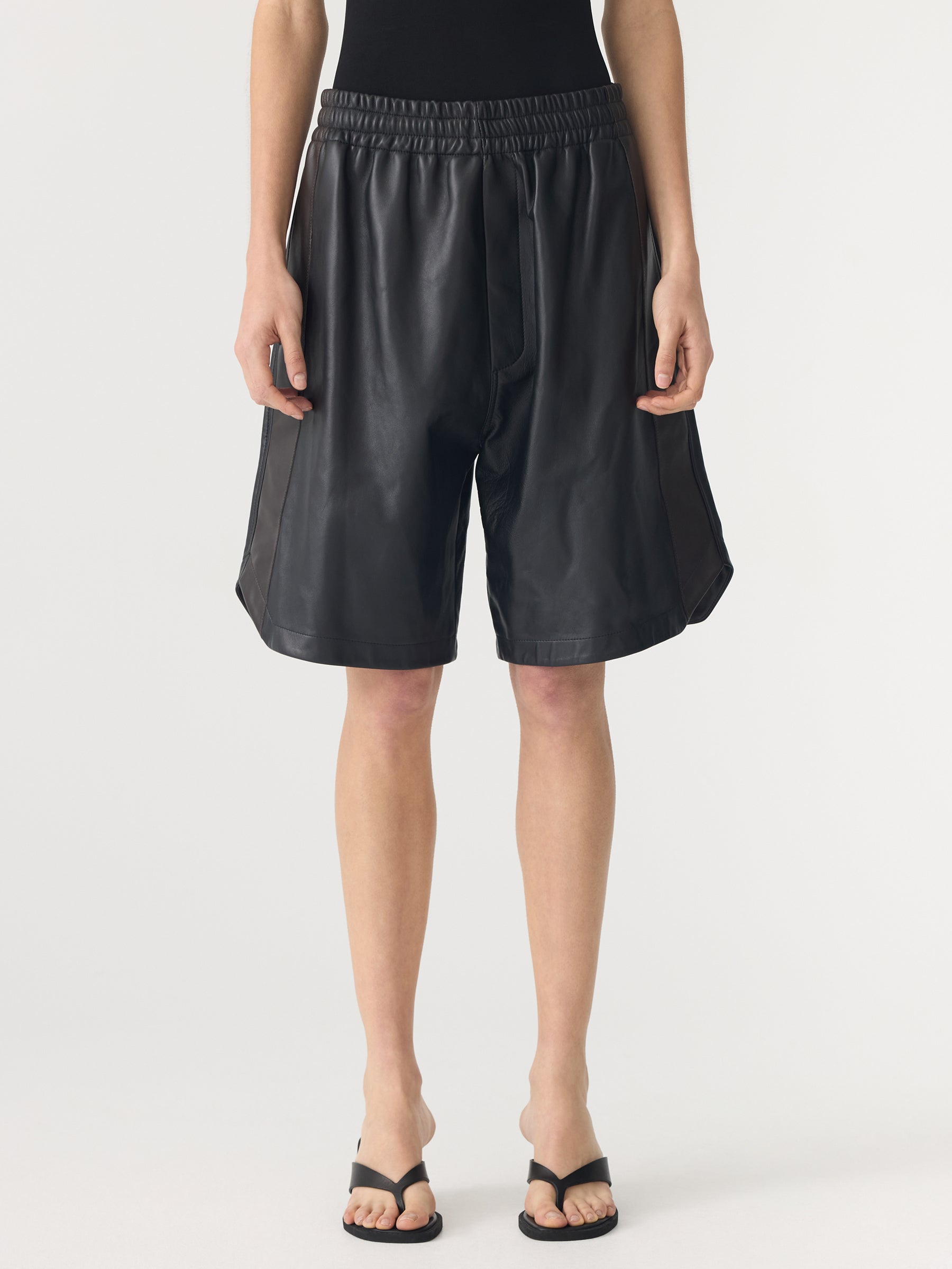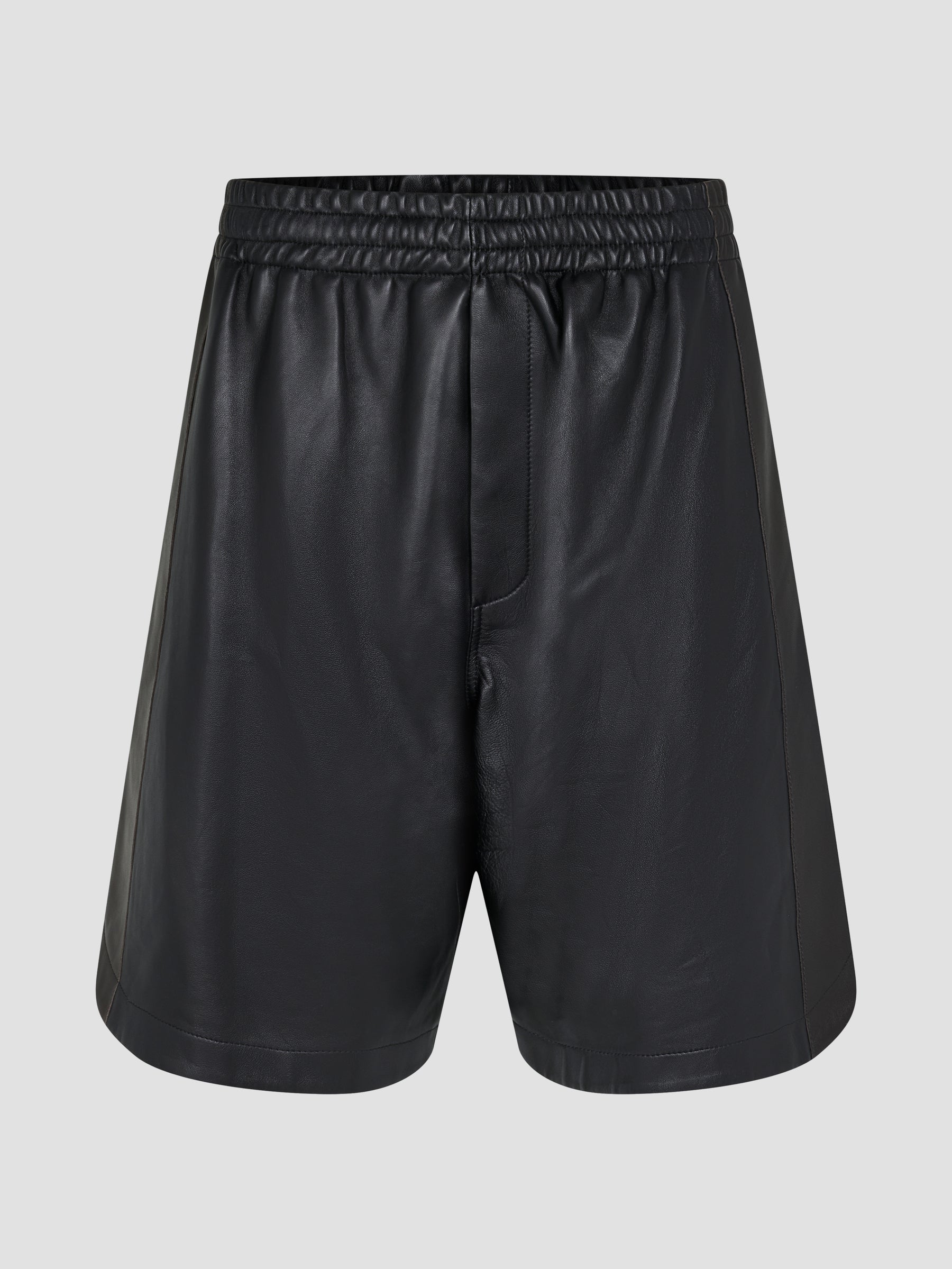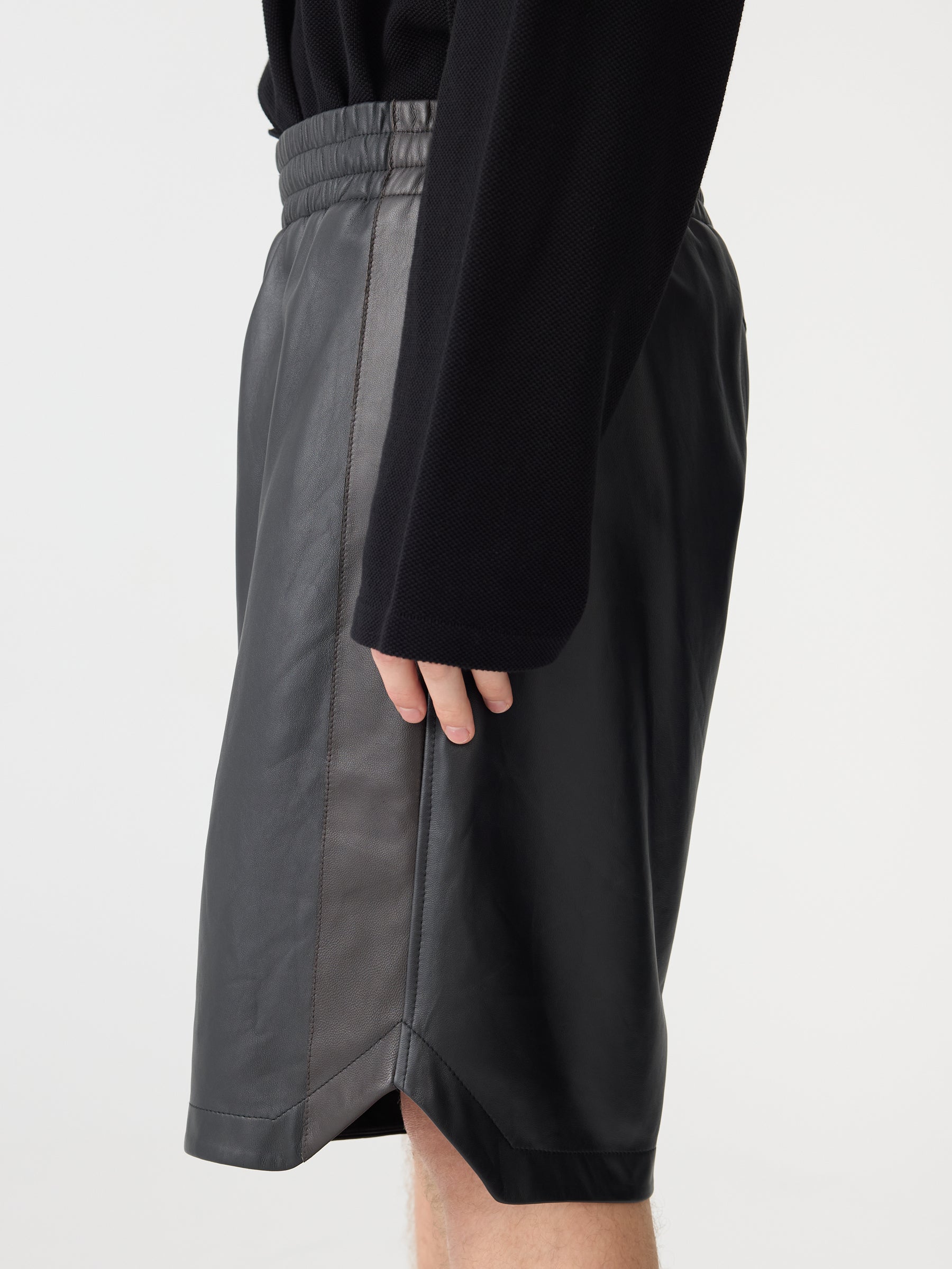 Basketball-inspired short crafted from smooth leather, designed with a relaxed fit and elasticated waistband. Finished with side entry pockets and subtle panel detailing for ease of movement. Leather offers a structured yet supple hand feel with a natural drape.