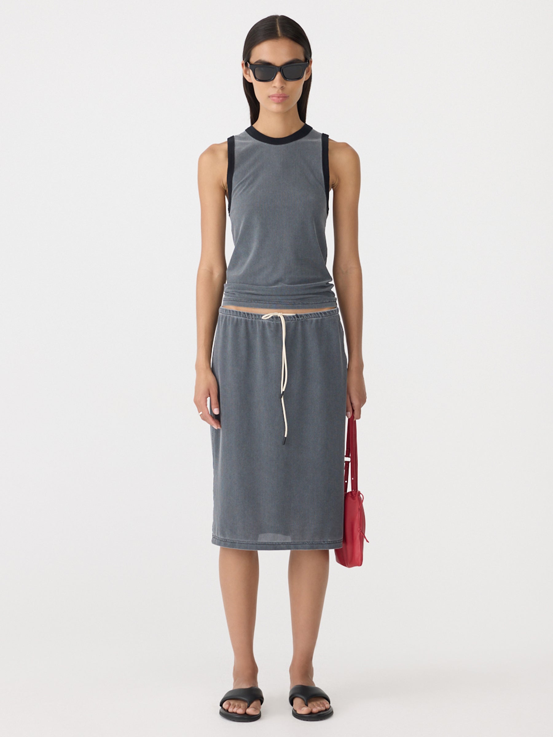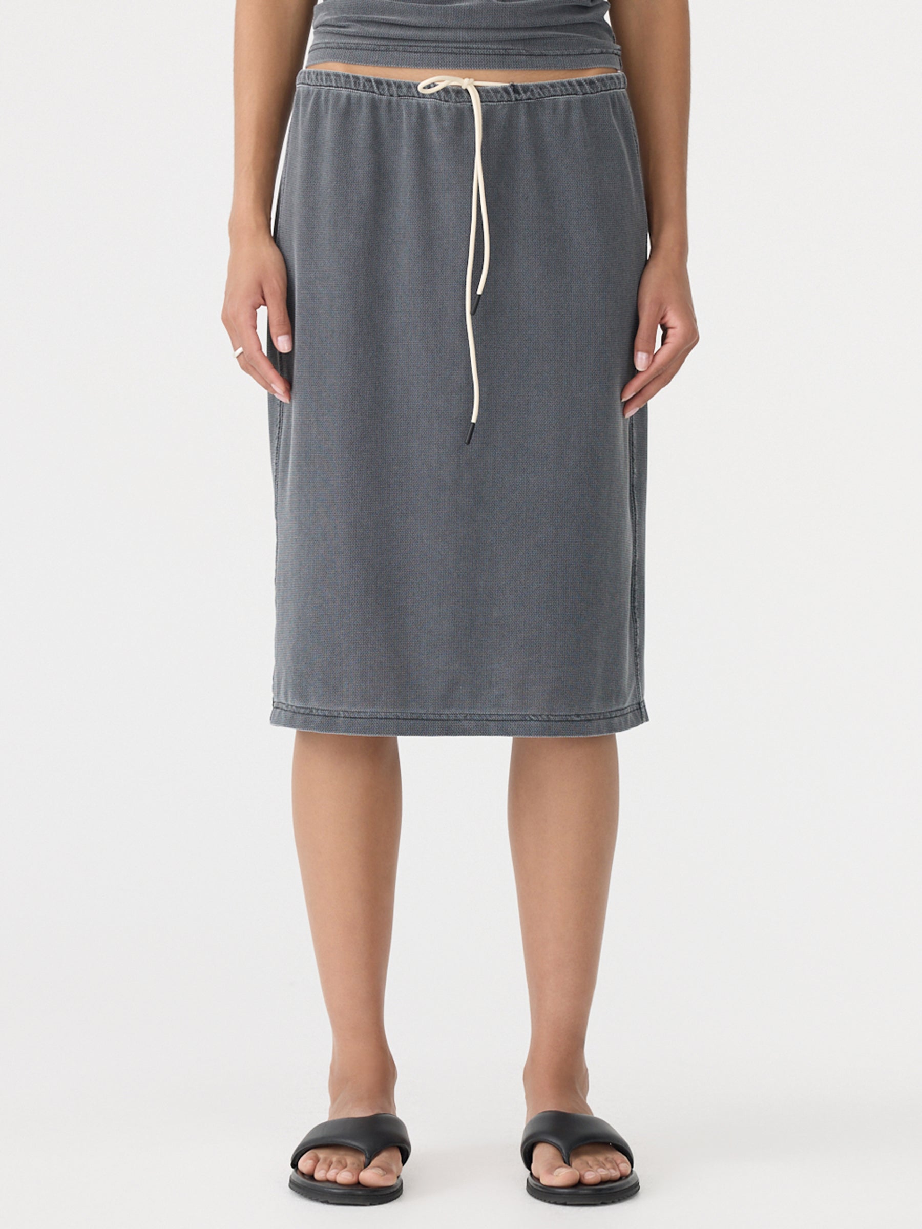 Crafted from a lightweight polyester-elastane blend, the Mesh Pull On Seam Detail Skirt is designed for breathability and ease in a midi length. Featuring an elasticated waistband with internal drawcord and subtle side seam detailing, the style is locally washed using a special technique to achieve a soft, vintage-inspired finish.