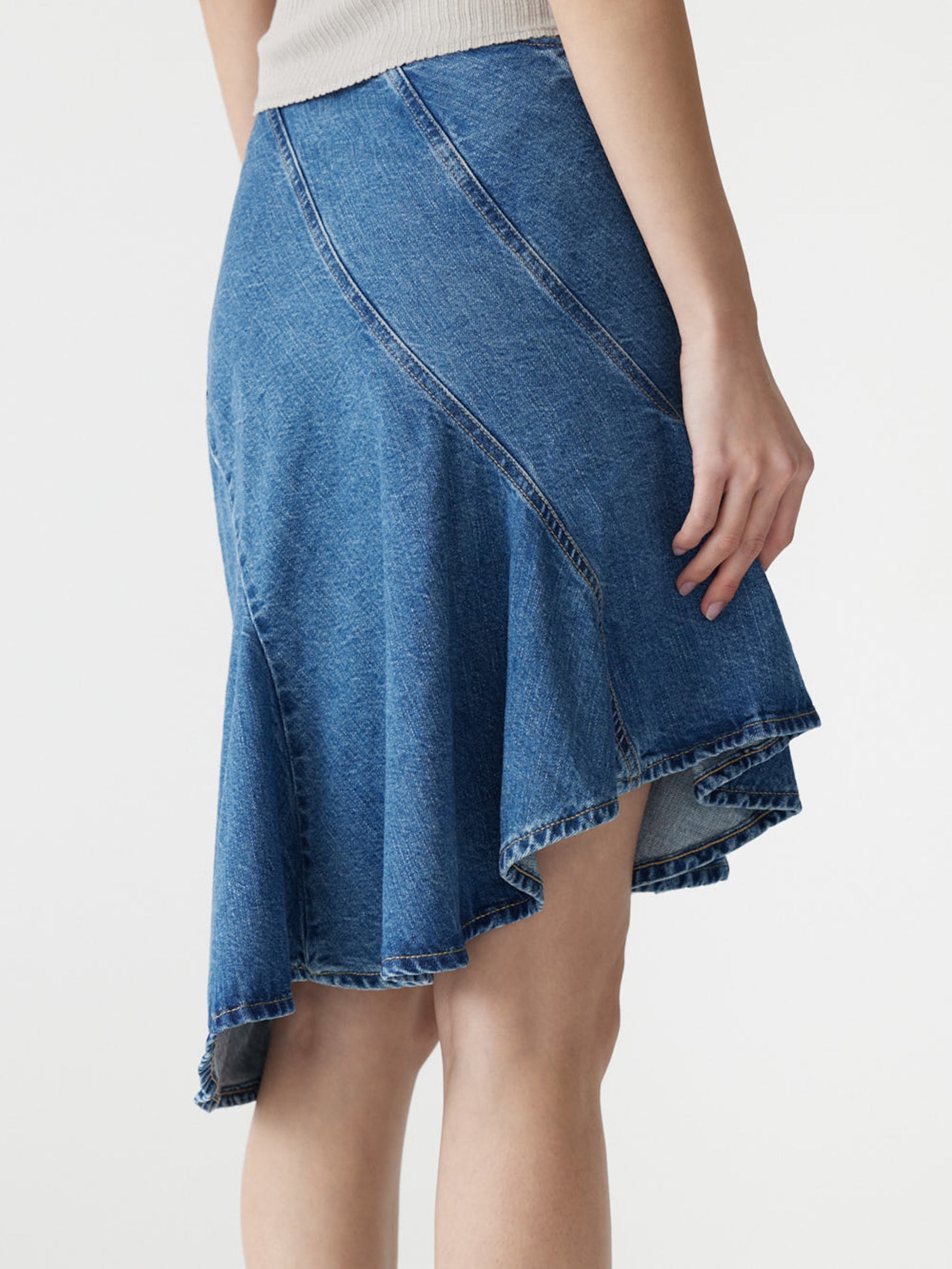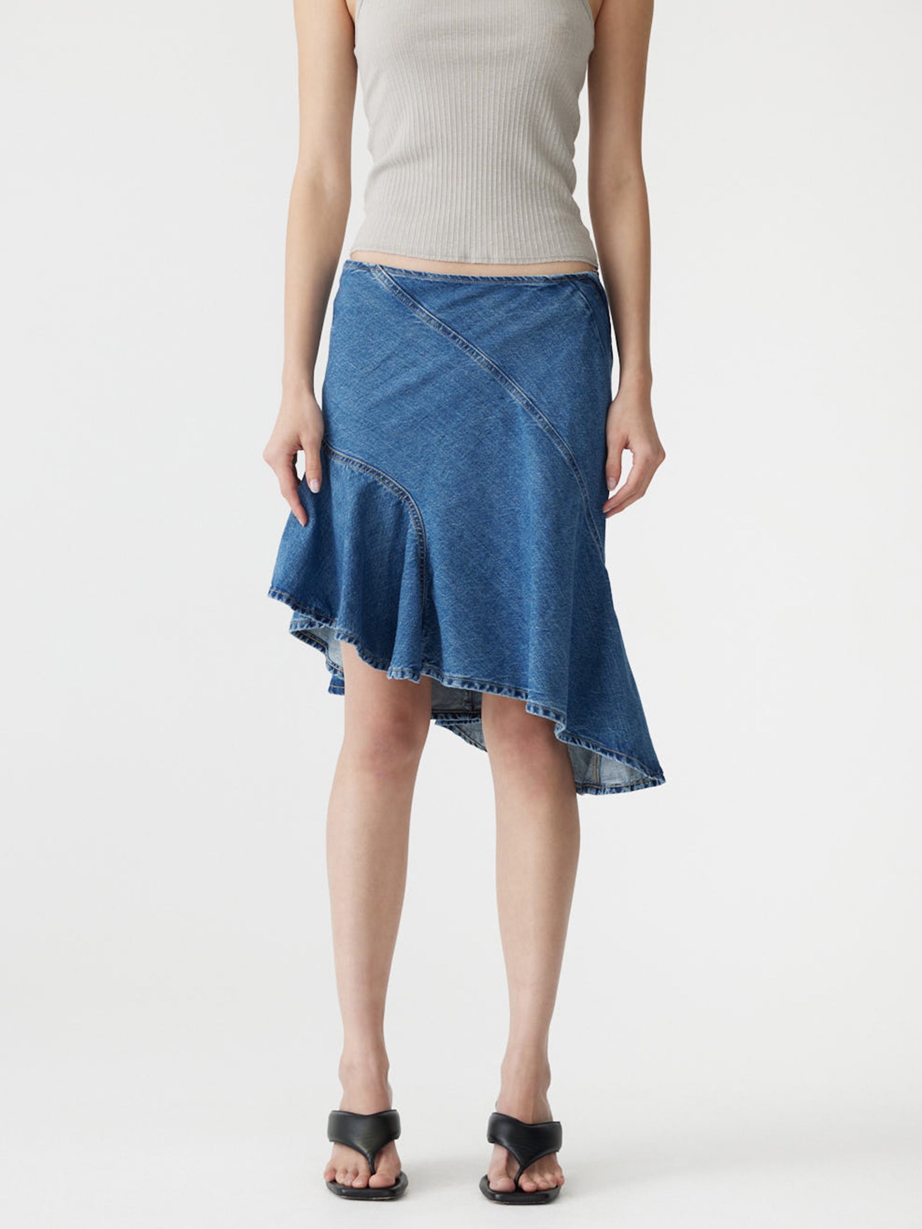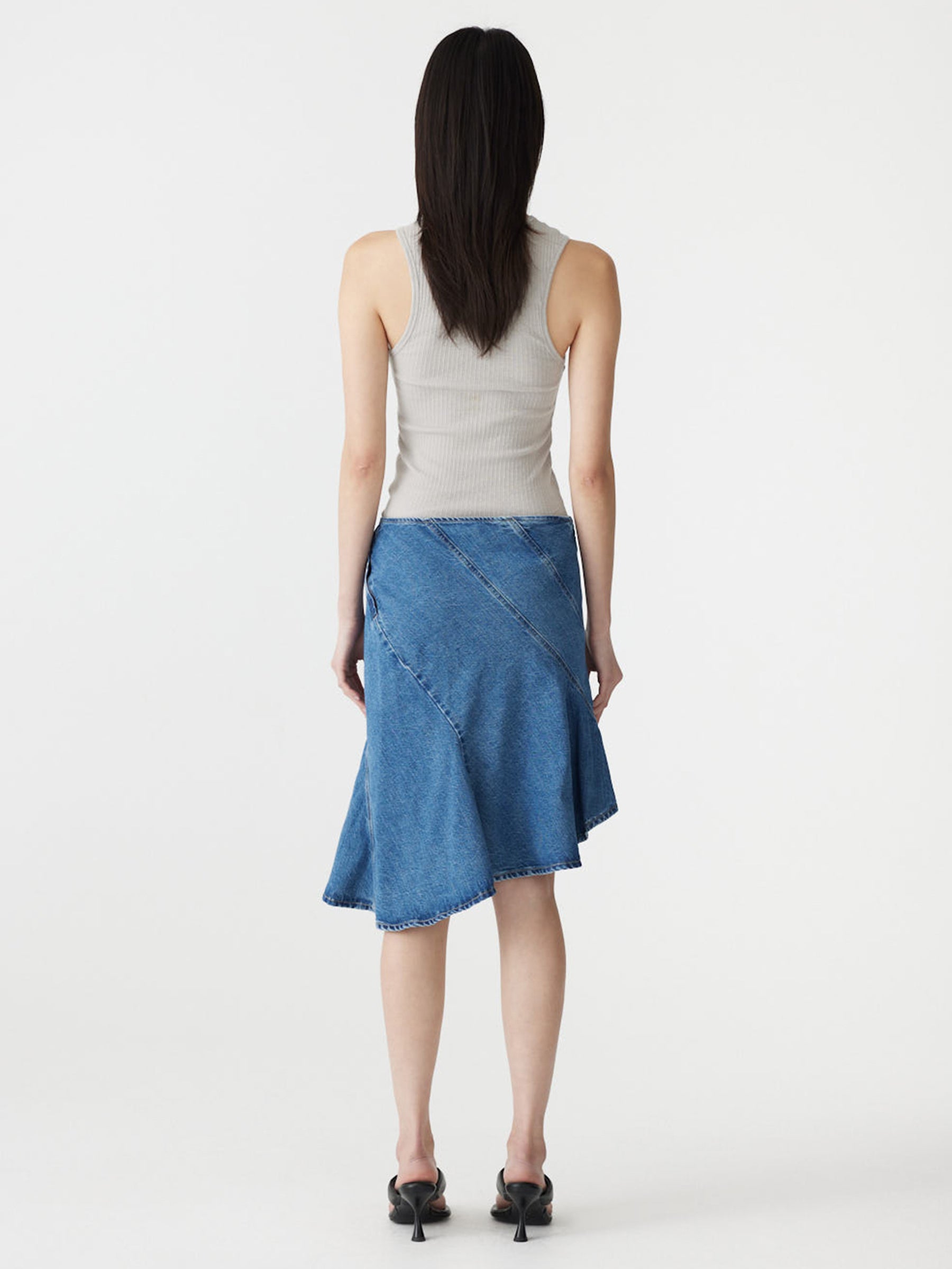 Crafted from mid-weight organic cotton twill woven in Japan, the Panelled Denim Skirt is defined by an asymmetric hemline with angled panels through the front and back. An off-centre front zip provides closure, with lap and fell seams finished with contrast topstitching. The 11.5oz denim is treated with a heavy wash and softening process to create a washed-back surface and subtle high–low effect, finished with hand sanding to gently fade the indigo and add depth to the denim.