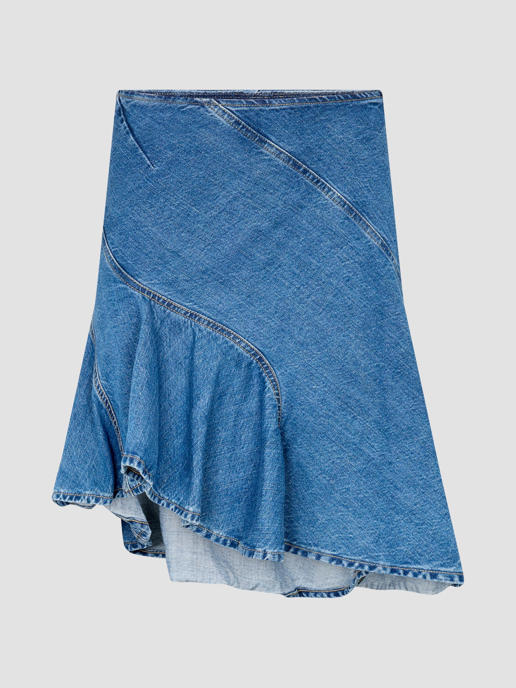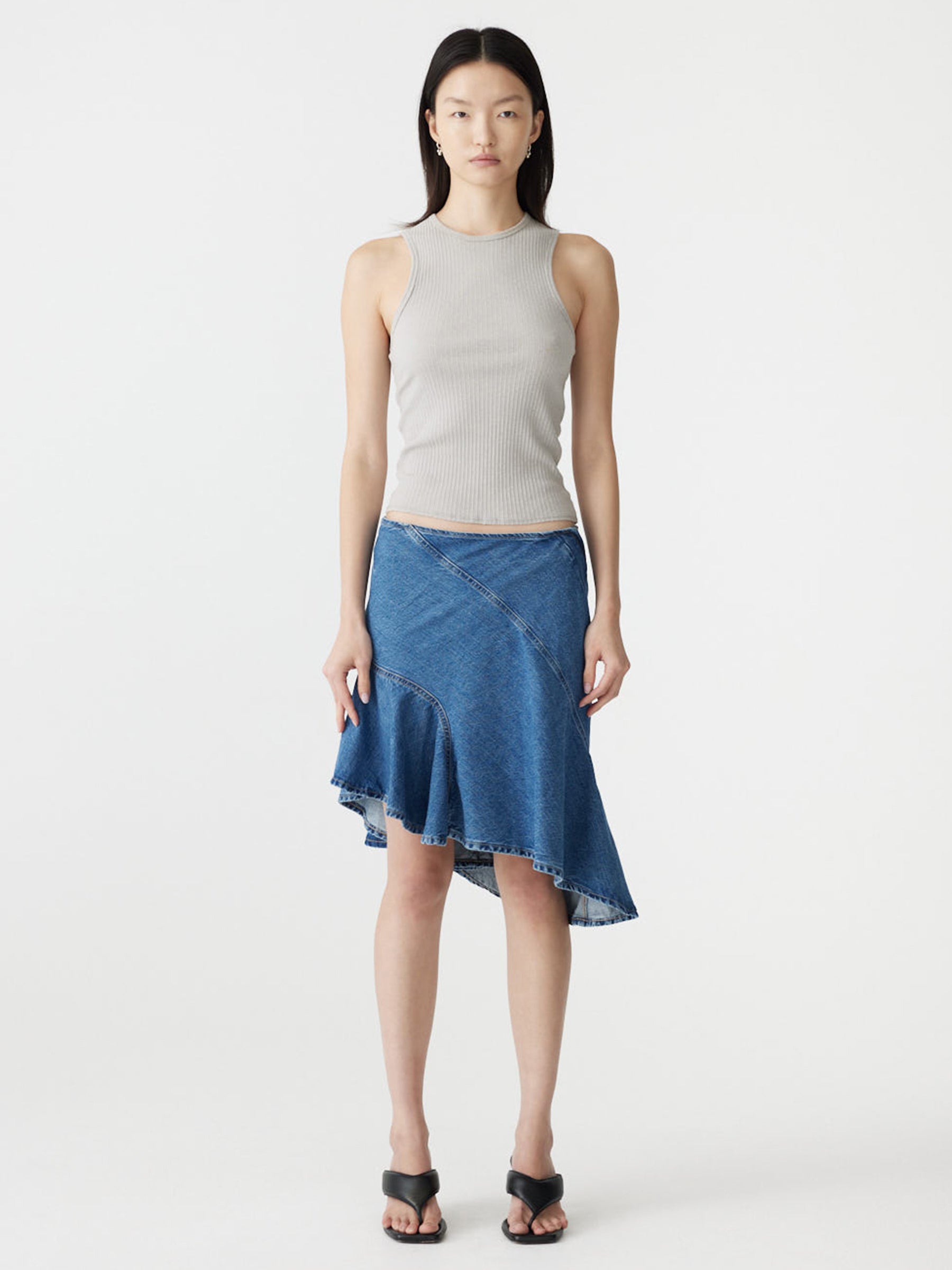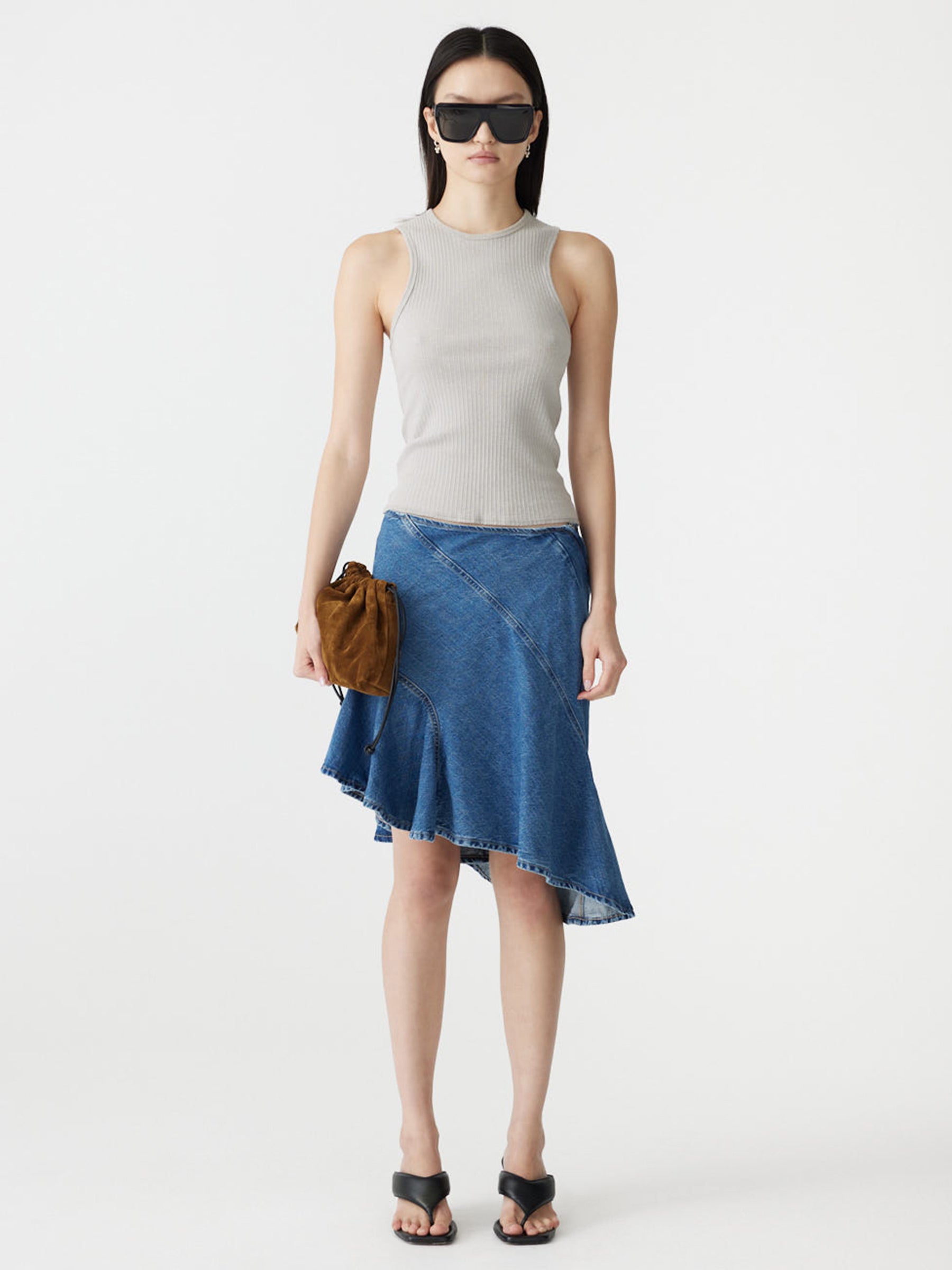 Crafted from mid-weight organic cotton twill woven in Japan, the Panelled Denim Skirt is defined by an asymmetric hemline with angled panels through the front and back. An off-centre front zip provides closure, with lap and fell seams finished with contrast topstitching. The 11.5oz denim is treated with a heavy wash and softening process to create a washed-back surface and subtle high–low effect, finished with hand sanding to gently fade the indigo and add depth to the denim.