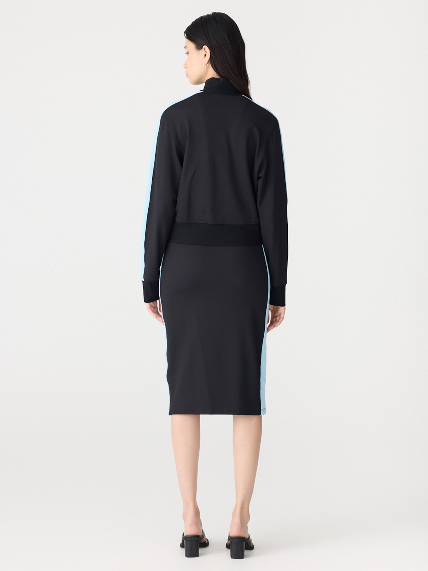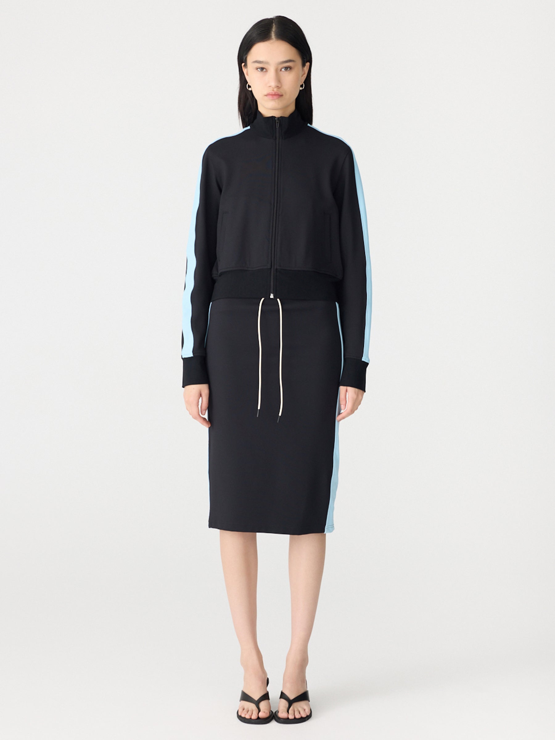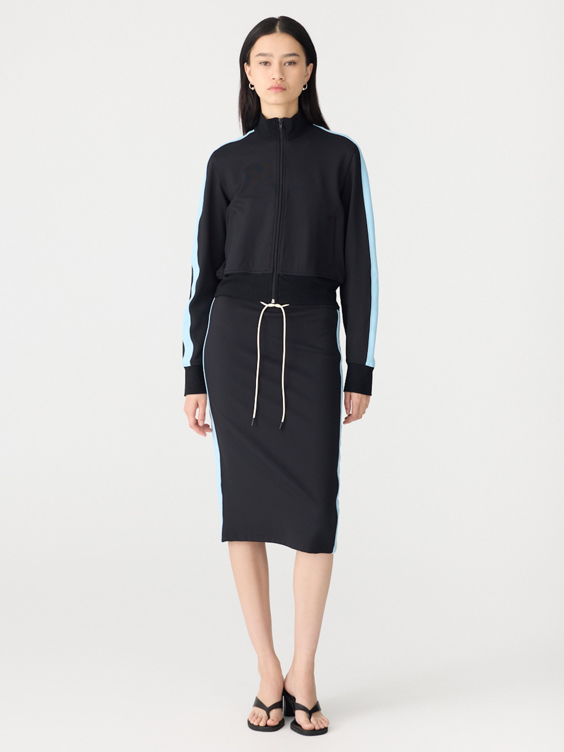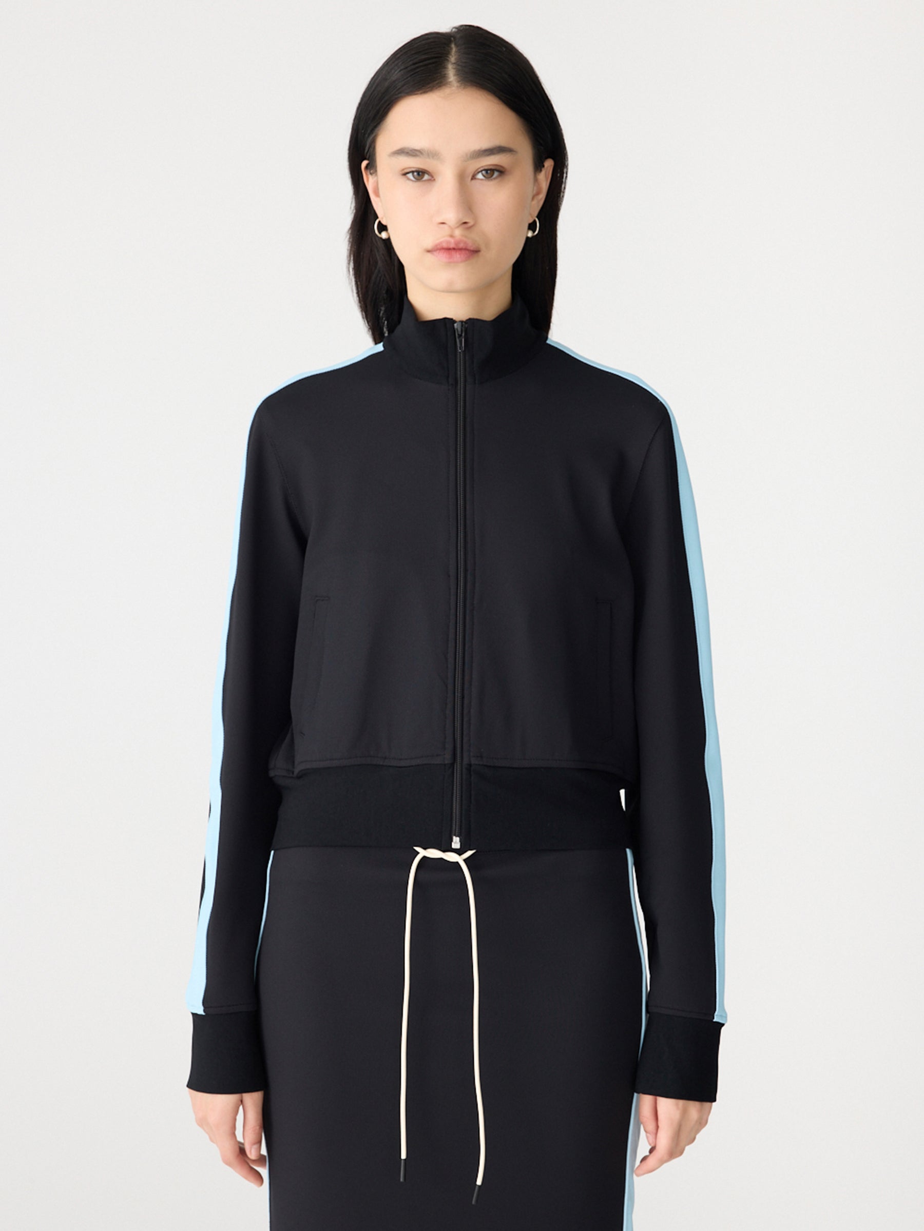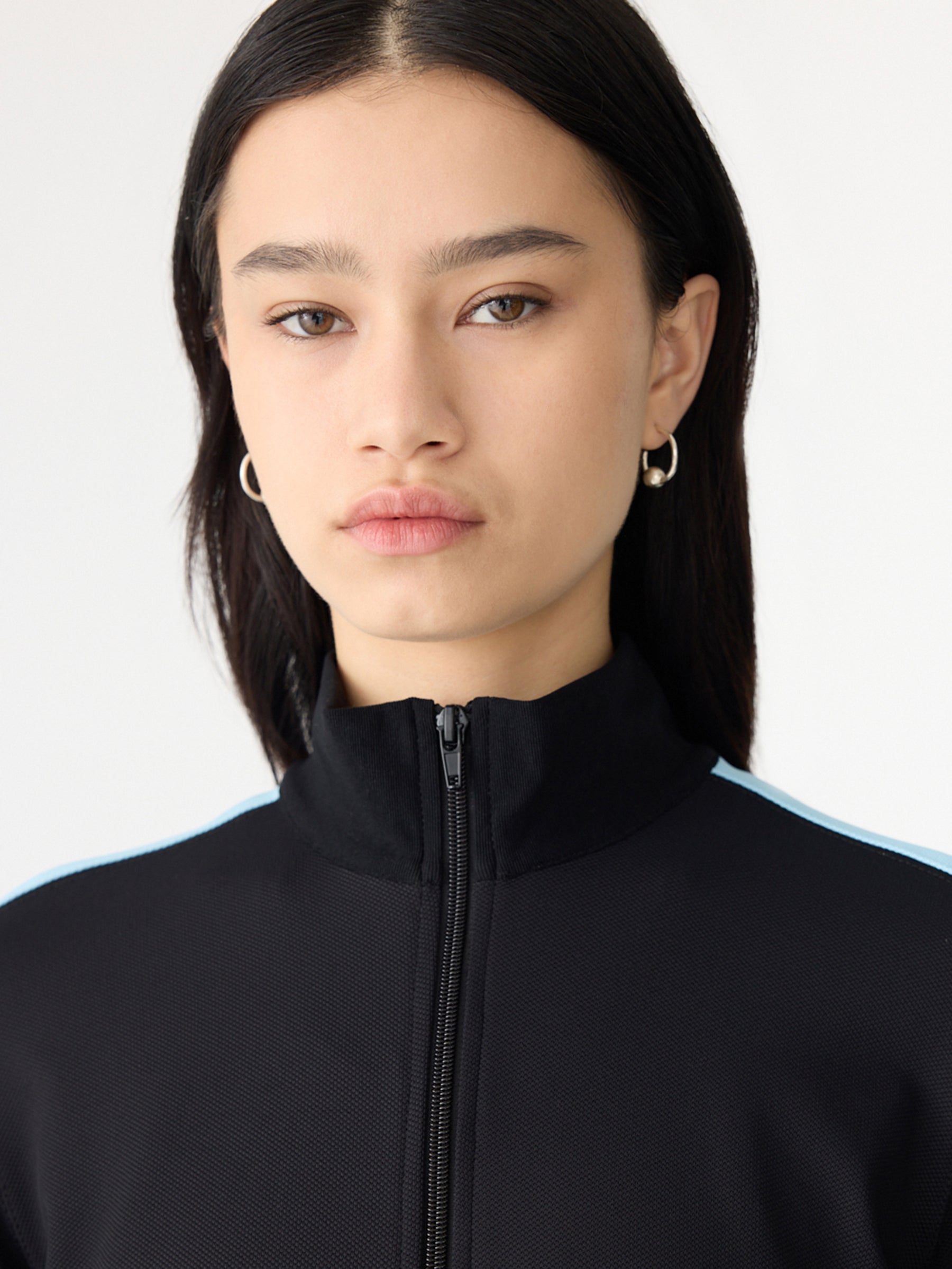 A signature style reworked into a modern athletic silhouette, the Rib Panel Pique Zip Up Jacket is crafted in a structured pique jersey with four-way stretch and a 3D athletic component for elevated comfort and movement. Designed with a cropped fit, this style features contrast rib panel detailing along the sleeves, a high collar neckline and centre-front zip closure. Finished with ribbed cuffs and hem for a refined sporty touch.