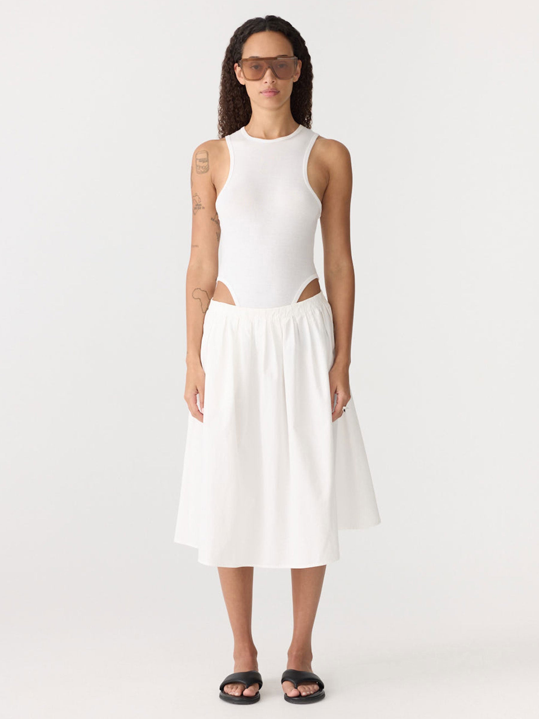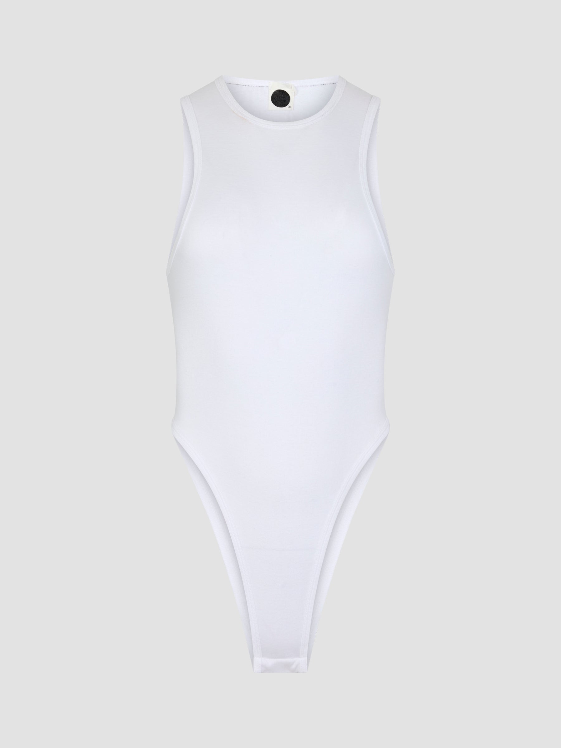 Rib Tank Bodysuit designed with a high neckline and streamlined silhouette. Crafted for a close fit with a high-cut leg and snap fastening at the base for ease of wear. Rayon blend jersey offers stretch, softness and a smooth hand feel.