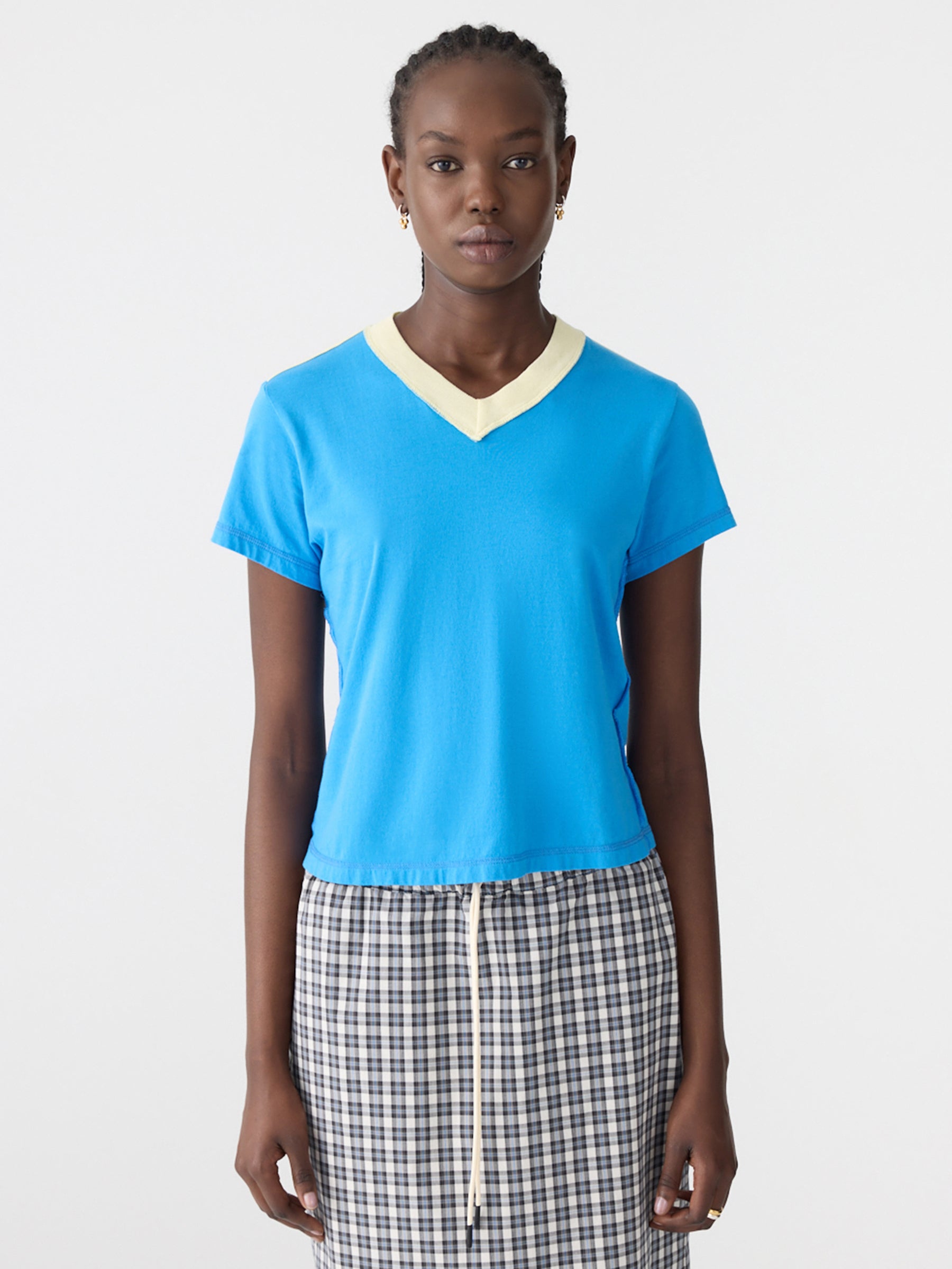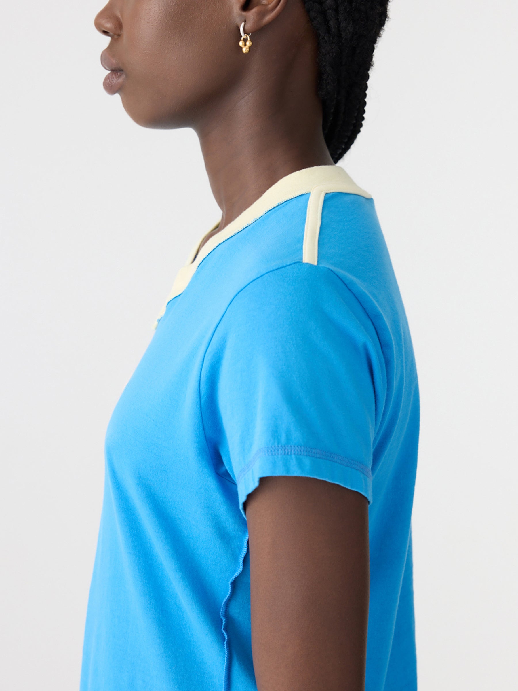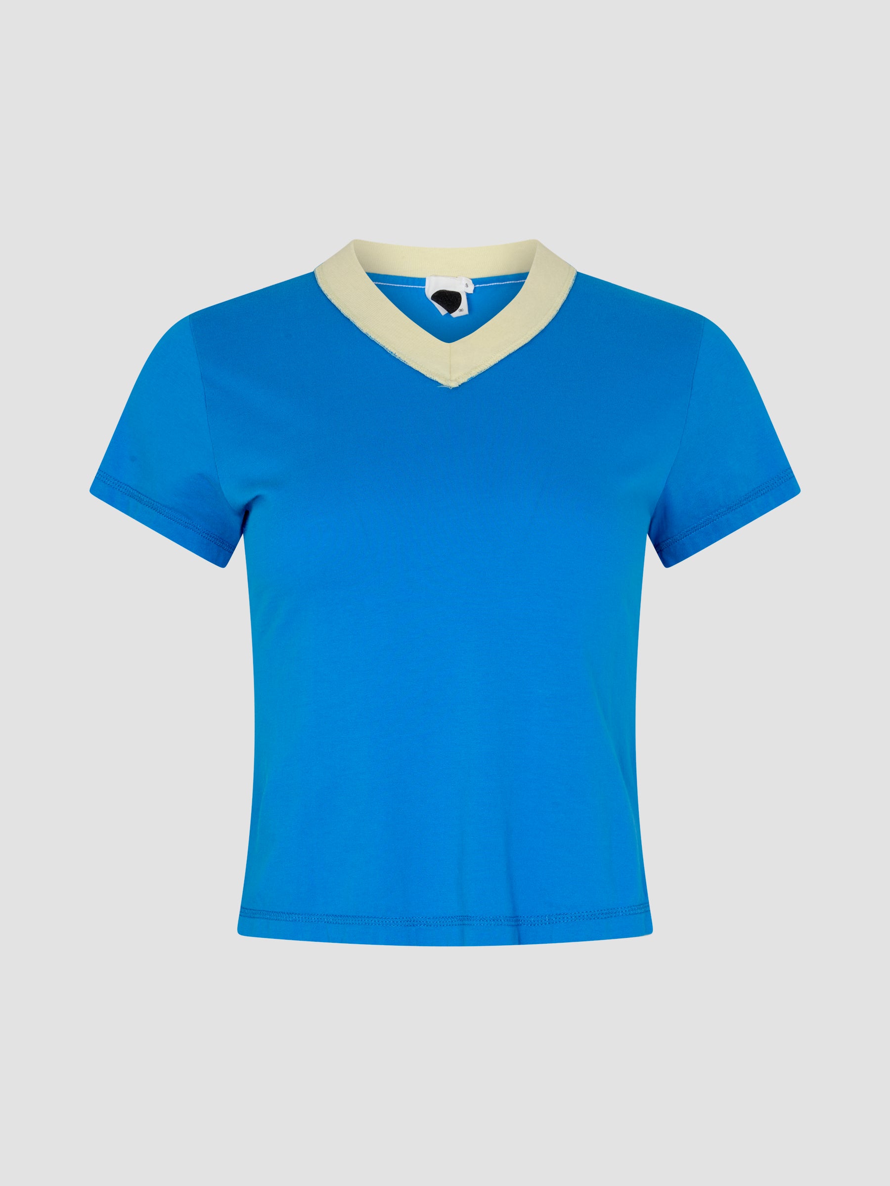 Designed as a high rotation staple, the Reversed V-Neck Baby T-Shirt is crafted from lightweight organic cotton single jersey for a slim fit shape. The final garment boasts a V-neck in organic cotton rib, cap sleeves and a cropped silhouette. Refined by a raw edge hem, contrast V neck and signature contrast Bassike stitch detail.