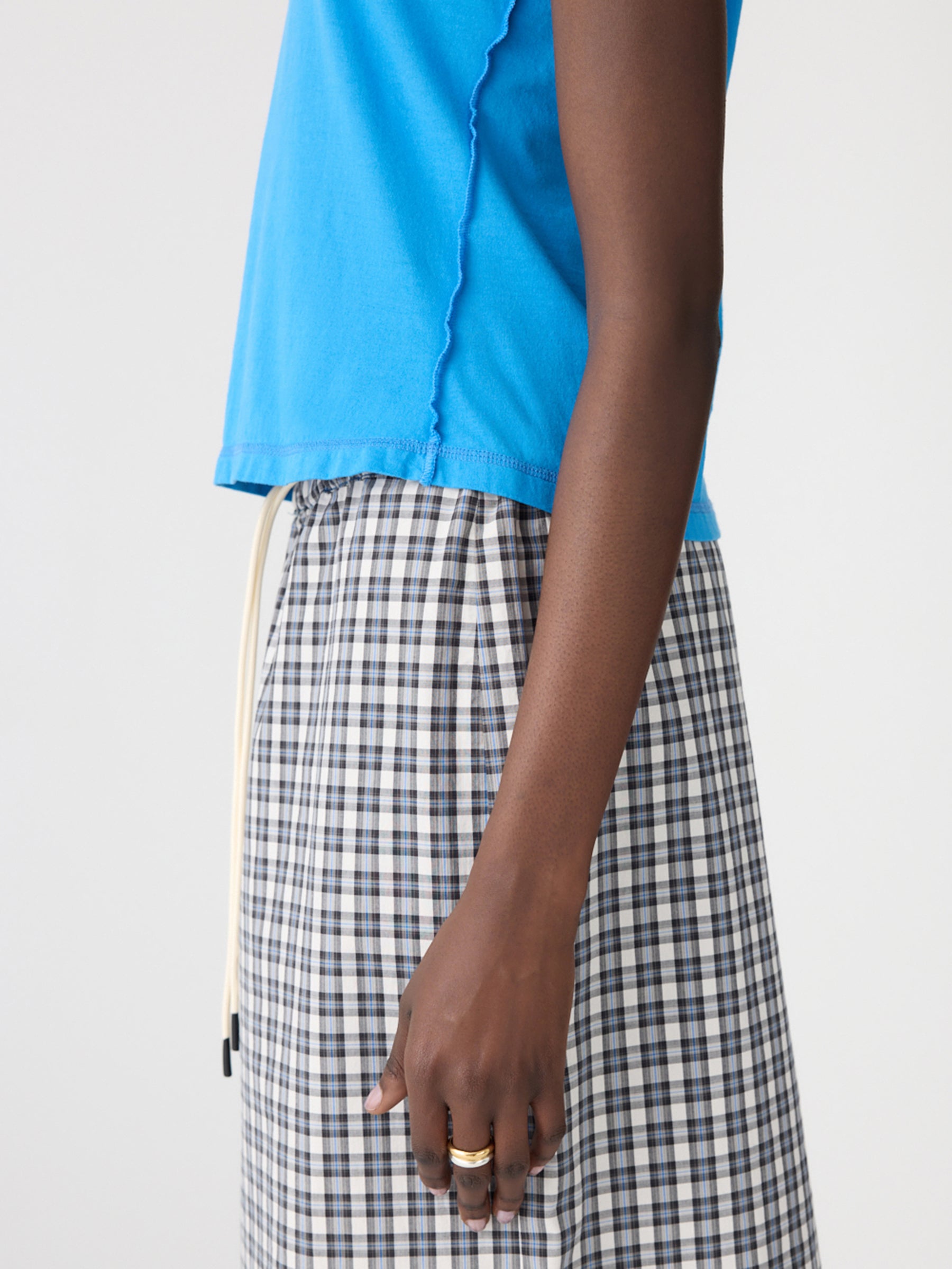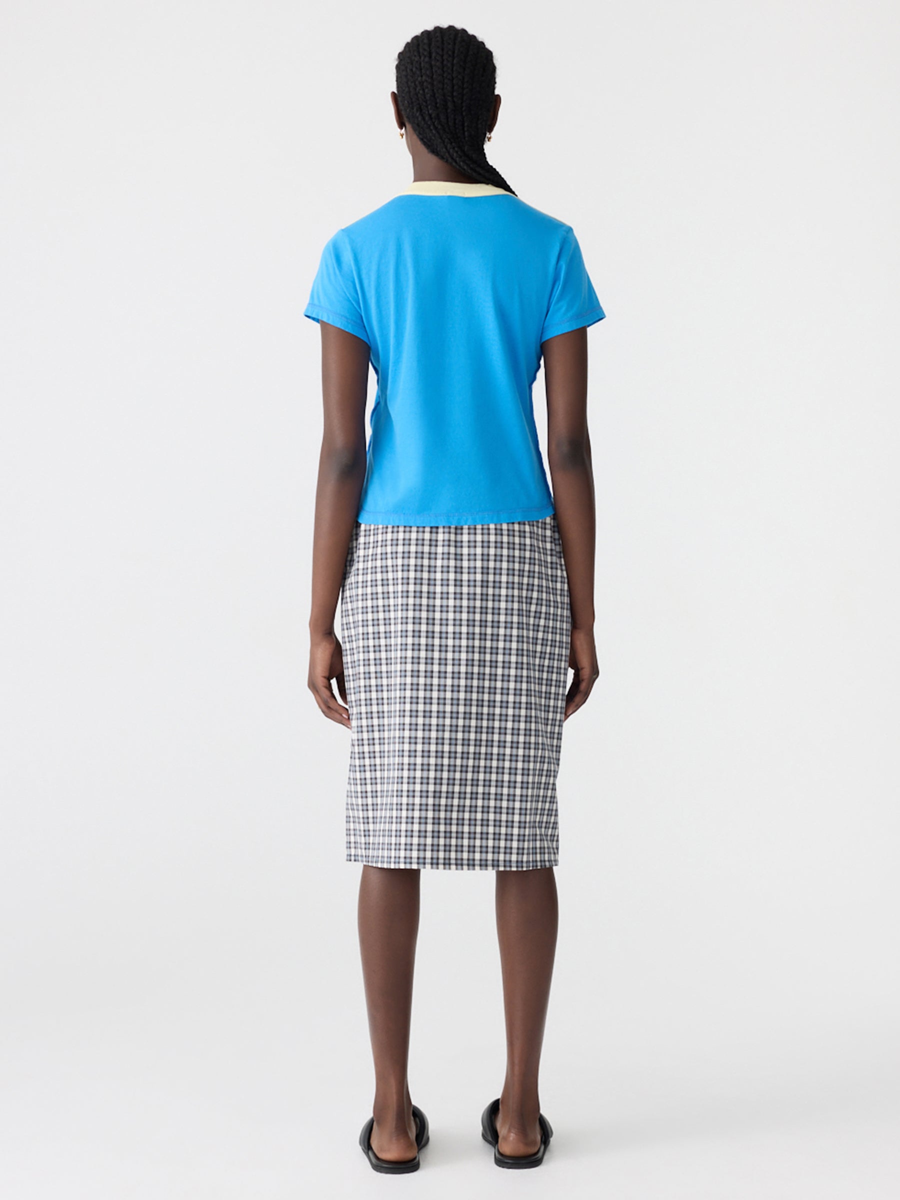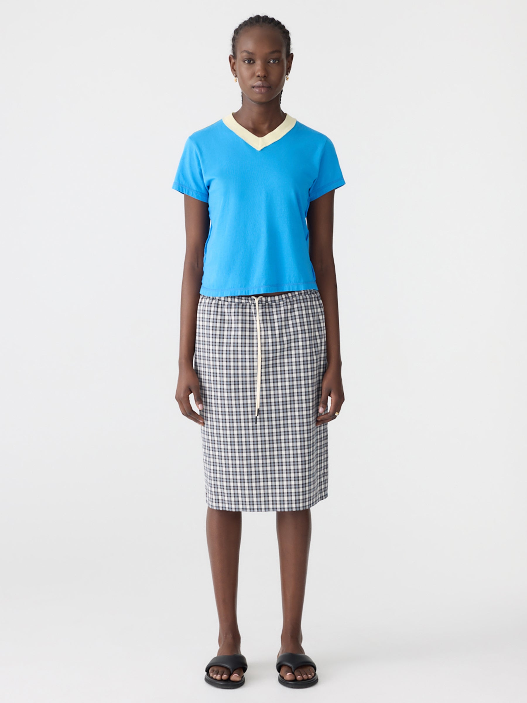 Designed as a high rotation staple, the Reversed V-Neck Baby T-Shirt is crafted from lightweight organic cotton single jersey for a slim fit shape. The final garment boasts a V-neck in organic cotton rib, cap sleeves and a cropped silhouette. Refined by a raw edge hem, contrast V neck and signature contrast Bassike stitch detail.