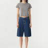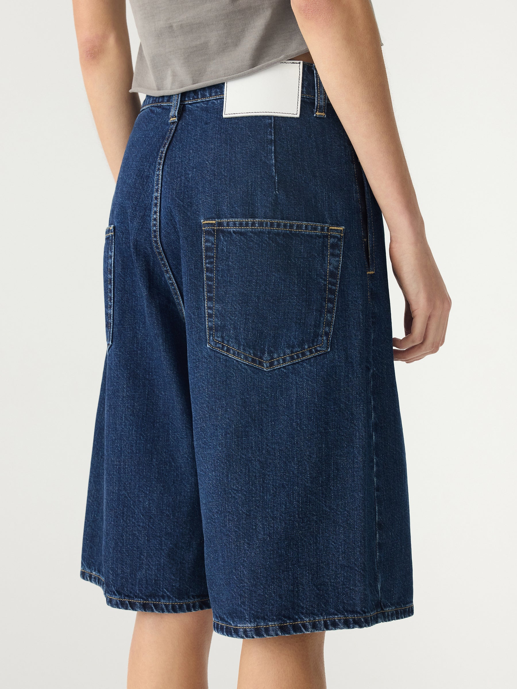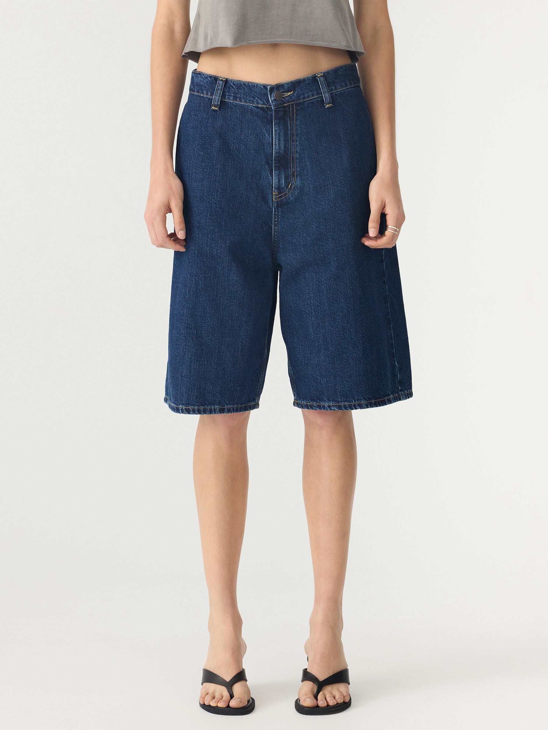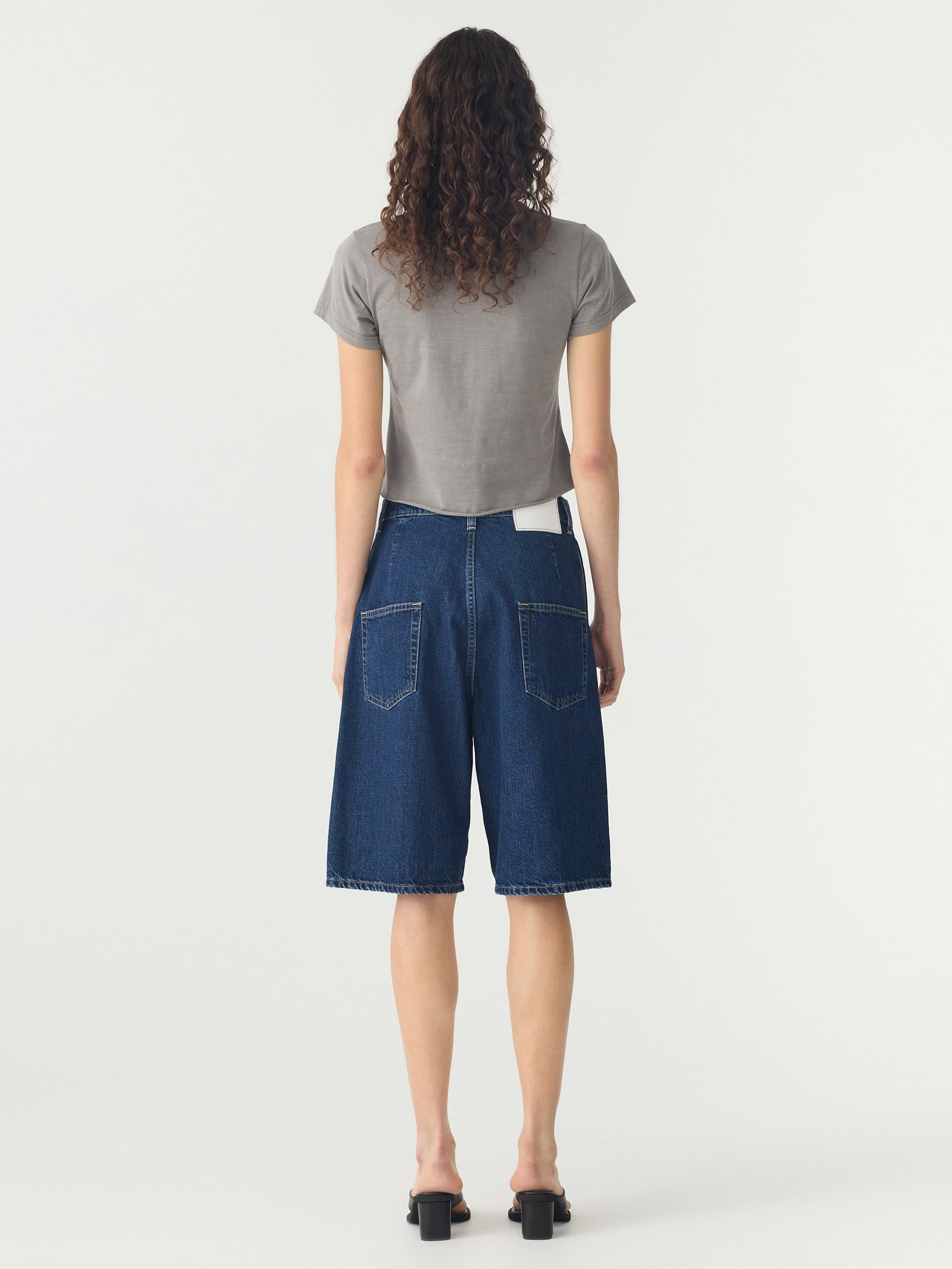Crafted from mid-weight organic cotton twill woven in Japan, the Denim Short is designed with a slightly wide, straight leg shape that finishes just below the knee. Featuring a zip fly with shank button closure, back patch pockets, and darts for subtle shaping. Finished with lap and fel denim construction and contrast topstitching throughout for durability and definition.