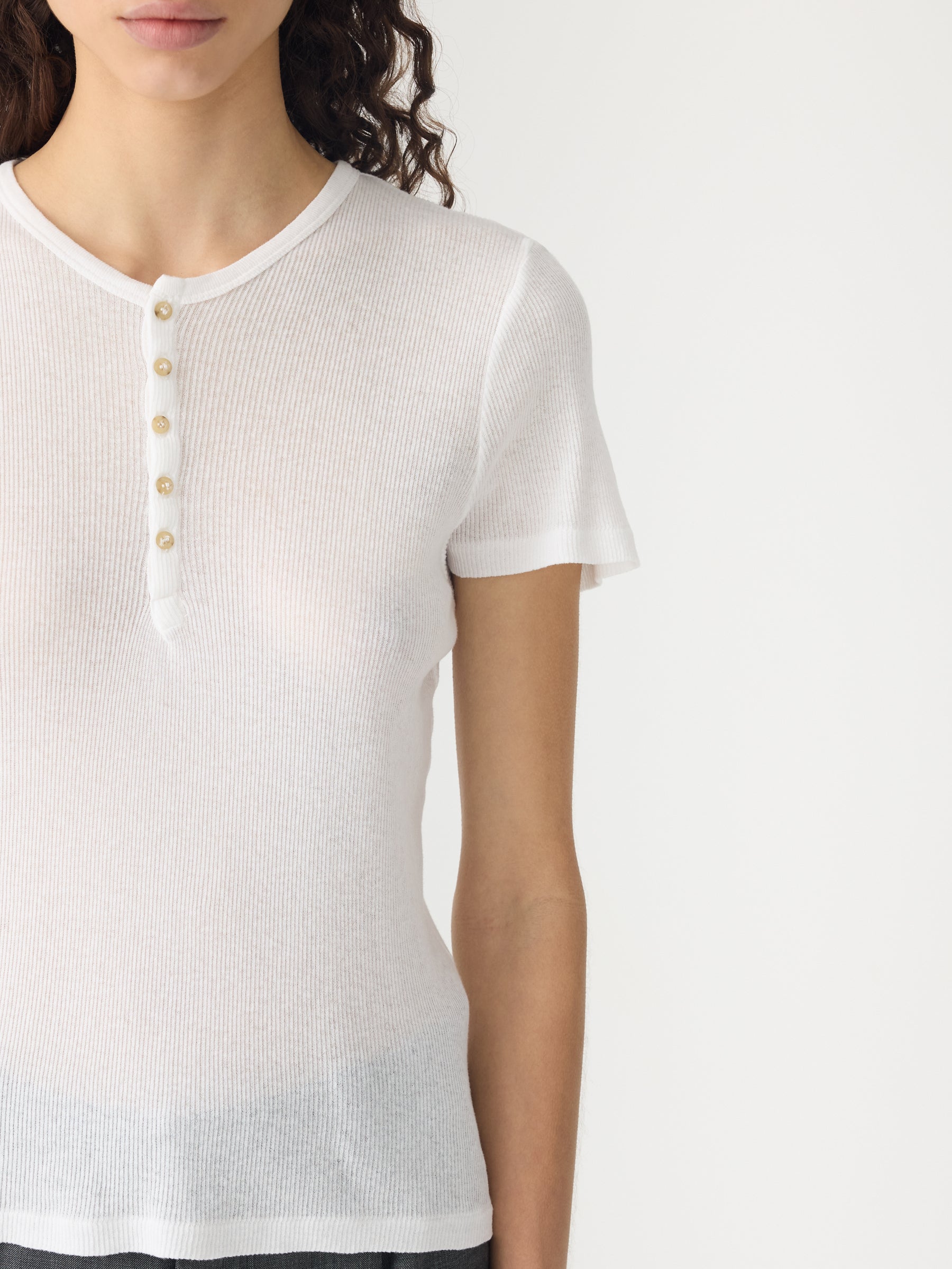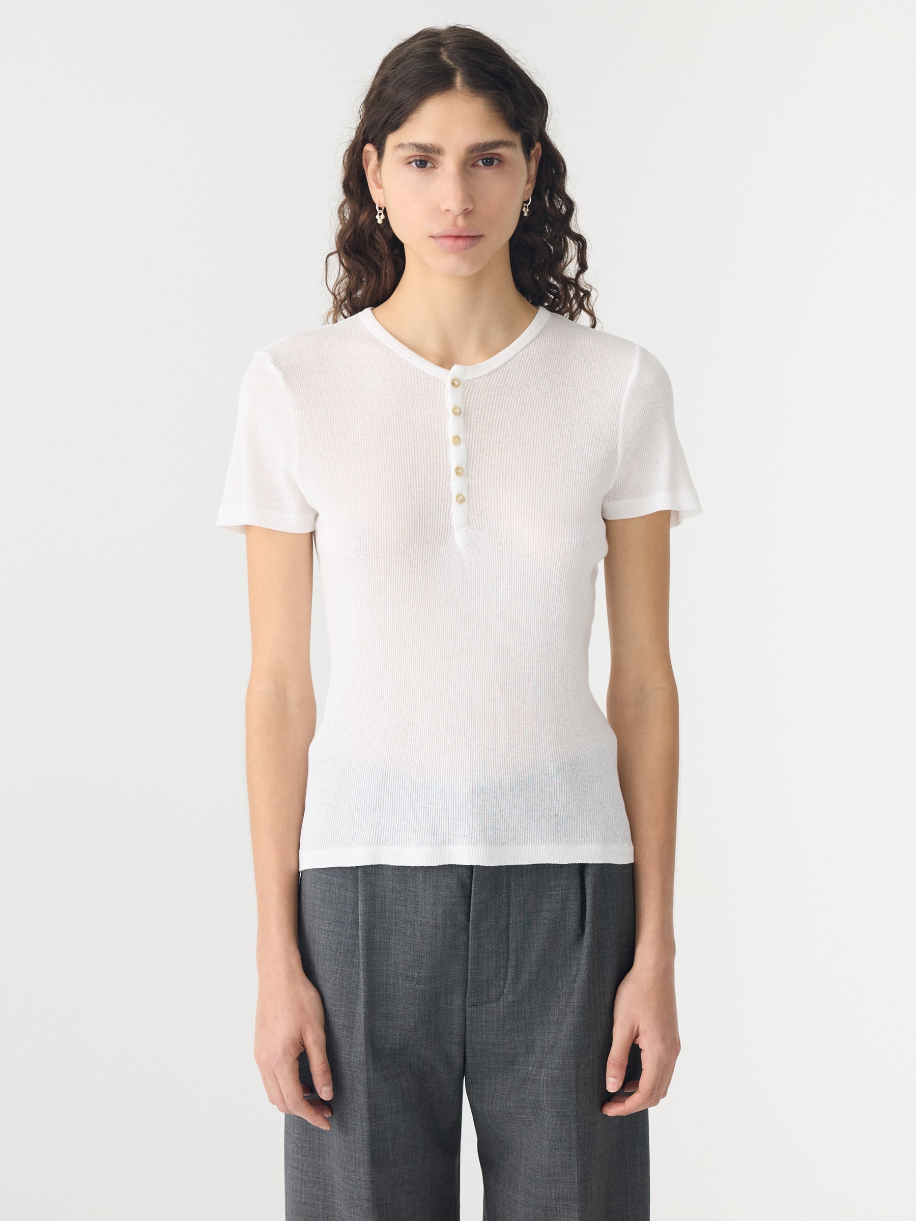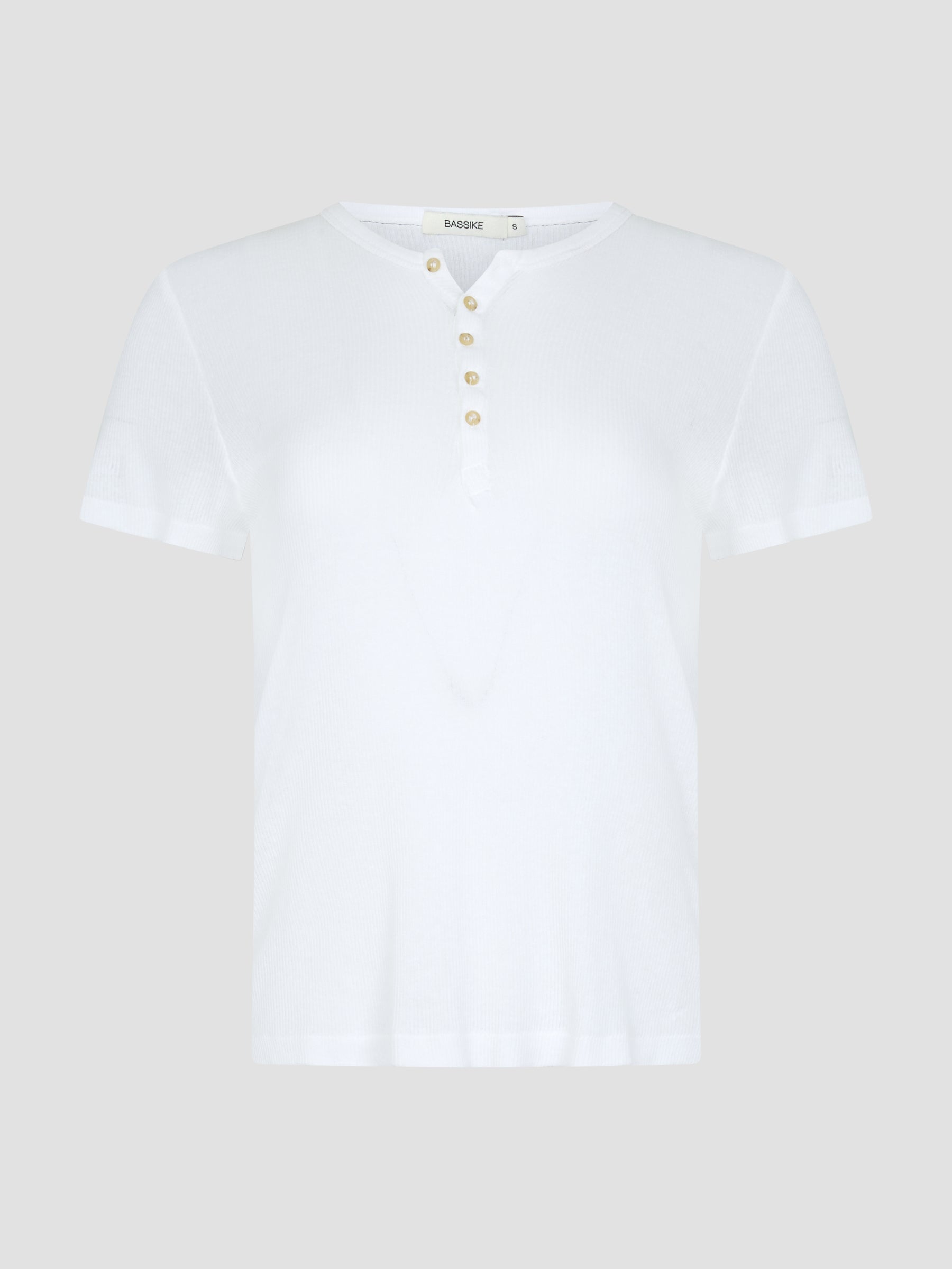 A new signature style, the Sheer Rib Placket Short Sleeve T-Shirt is designed for a slim fit in an organic sheer rib fabrication. This high-rotation staple features a quarter front placket with buttons, a ribbed neckline and finished hems. Complete with Bassike’s signature contrast chainstitch at the back neck.