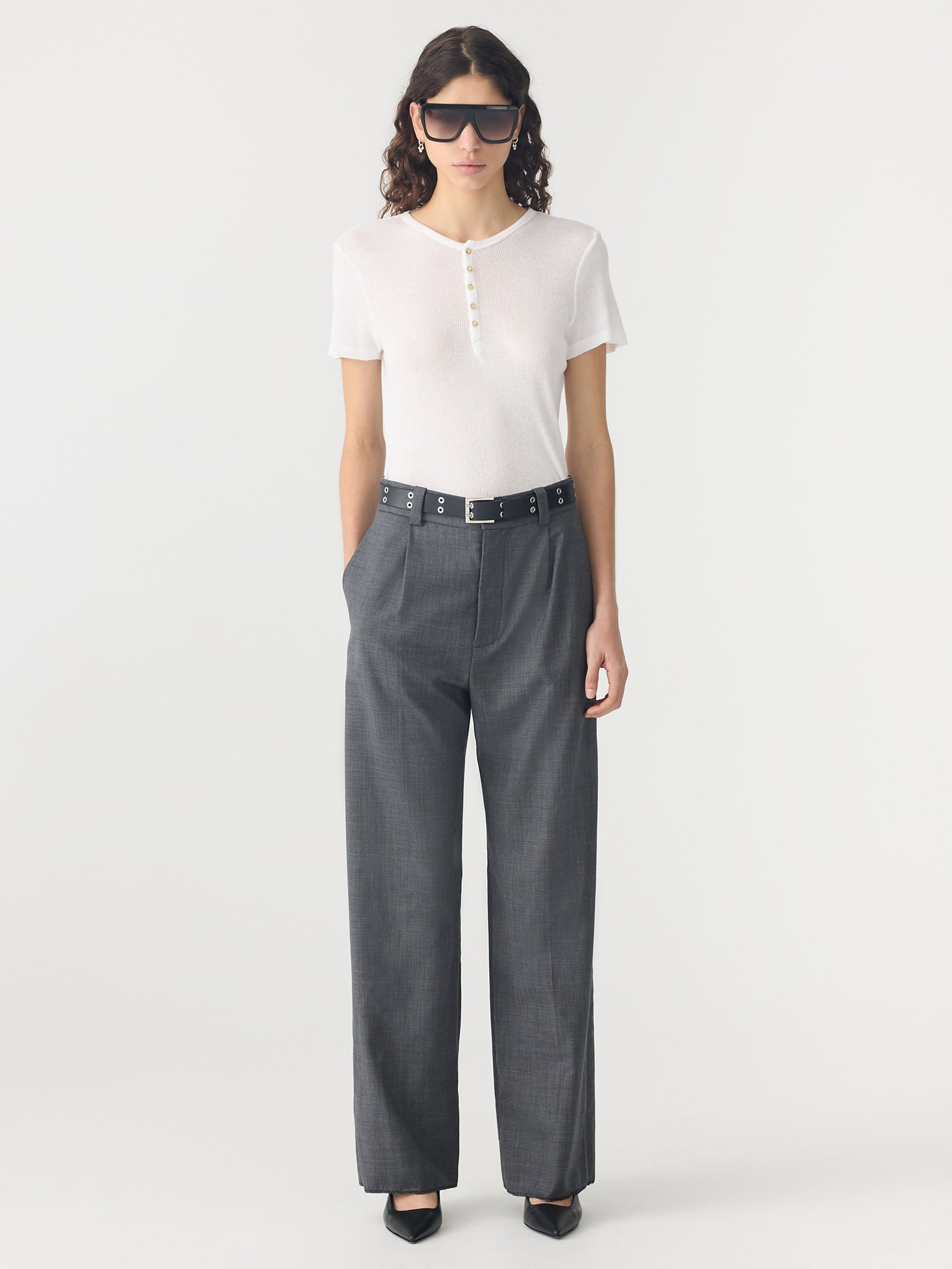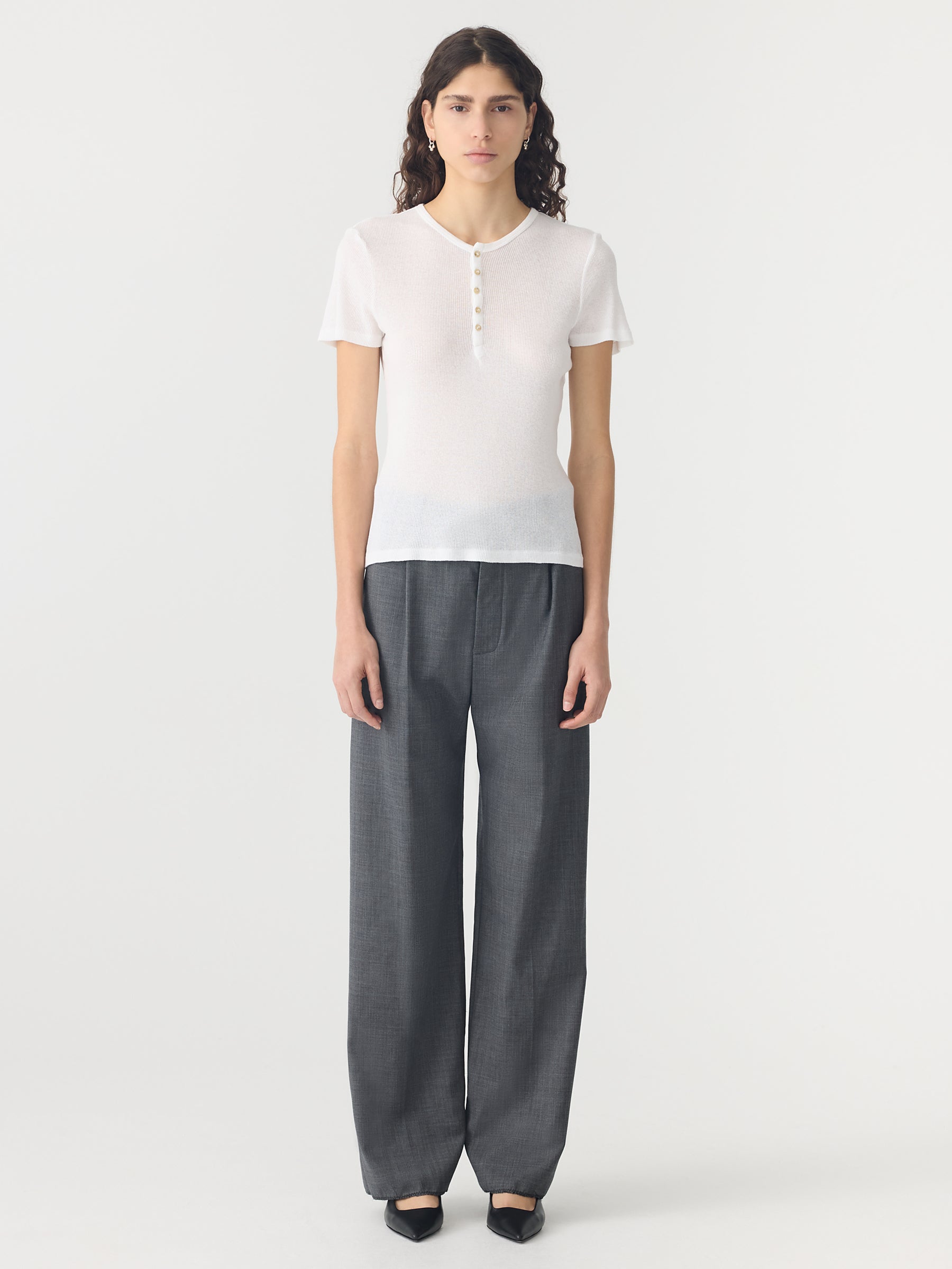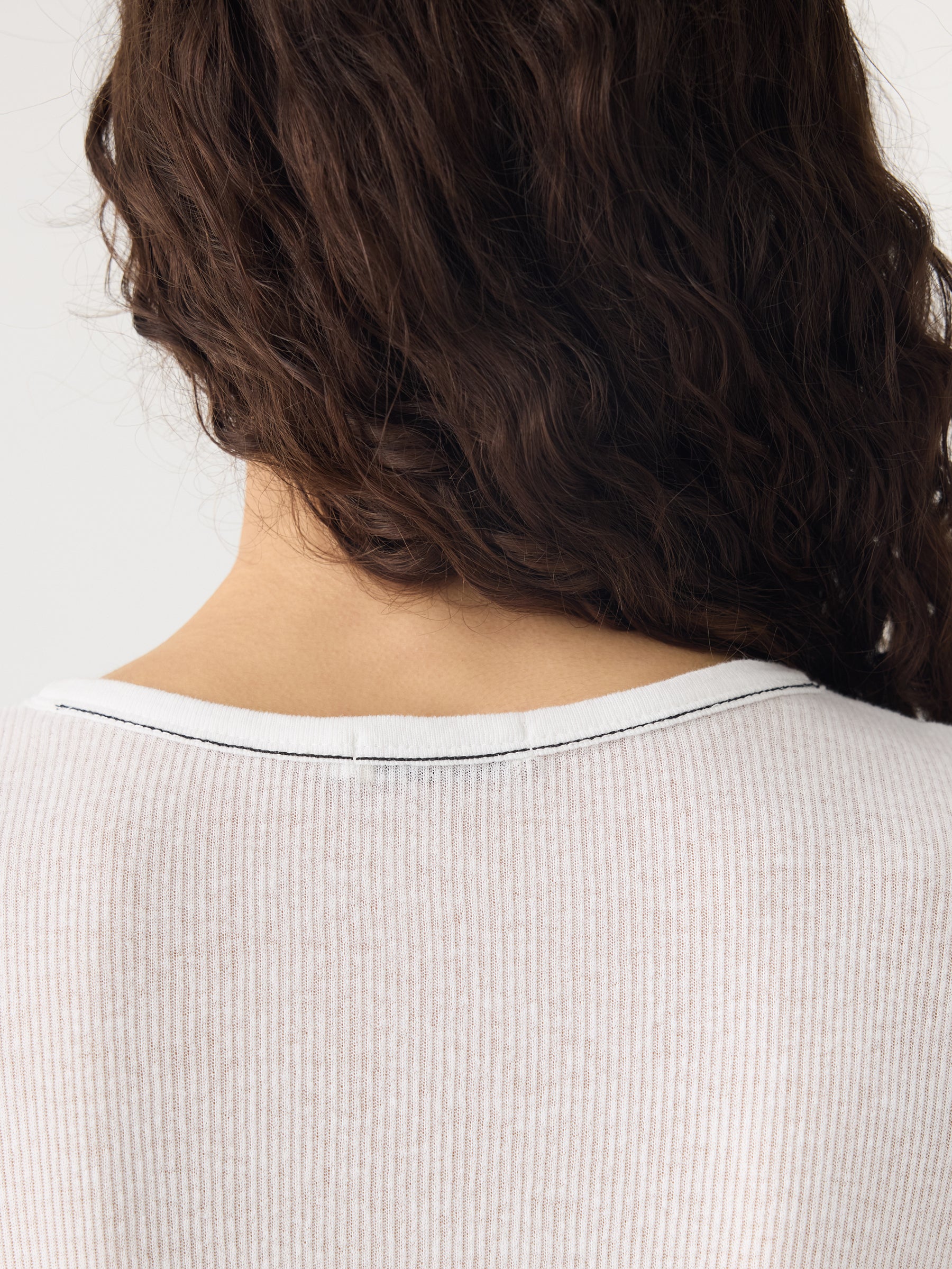 A new signature style, the Sheer Rib Placket Short Sleeve T-Shirt is designed for a slim fit in an organic sheer rib fabrication. This high-rotation staple features a quarter front placket with buttons, a ribbed neckline and finished hems. Complete with Bassike’s signature contrast chainstitch at the back neck.
