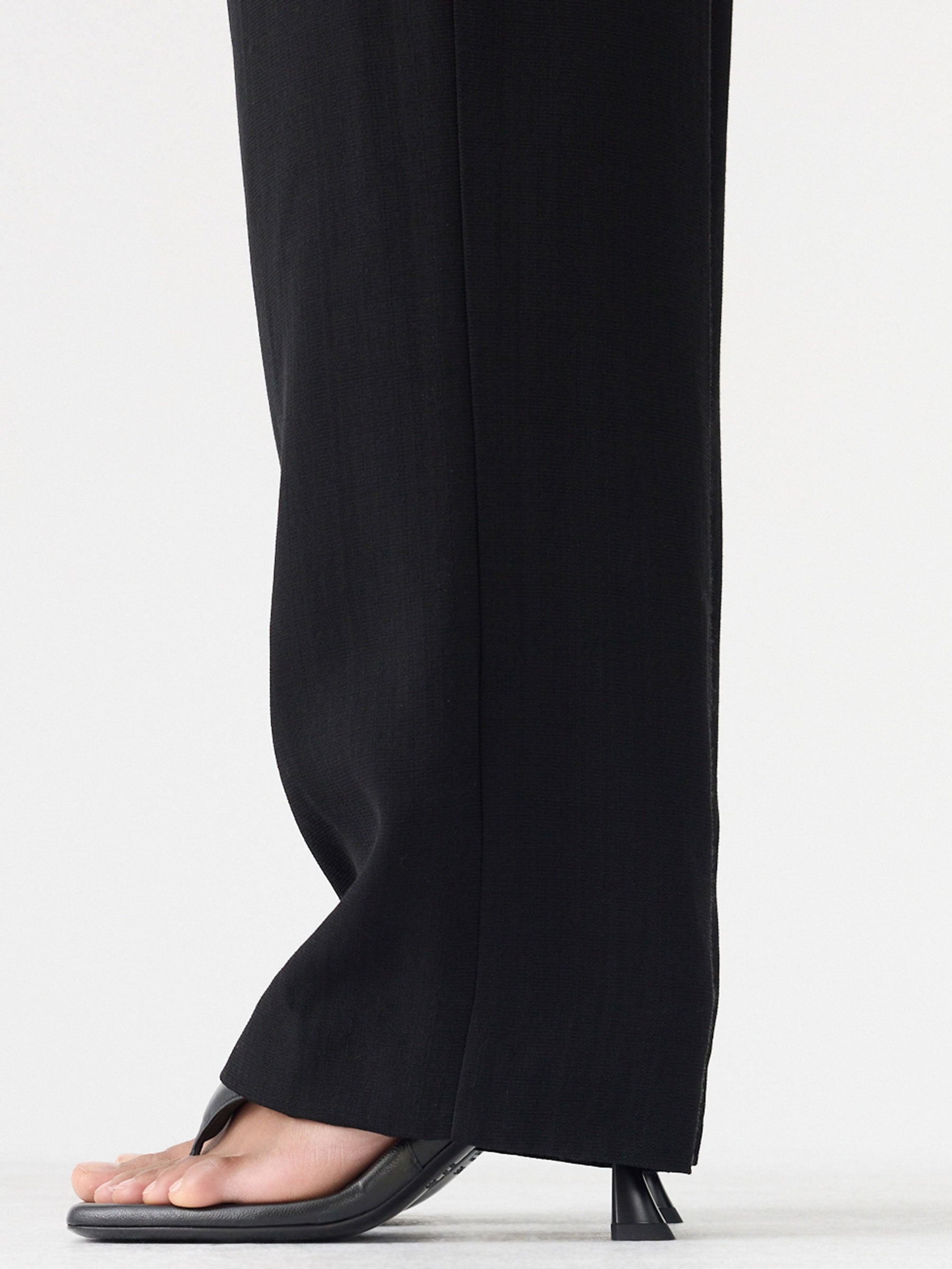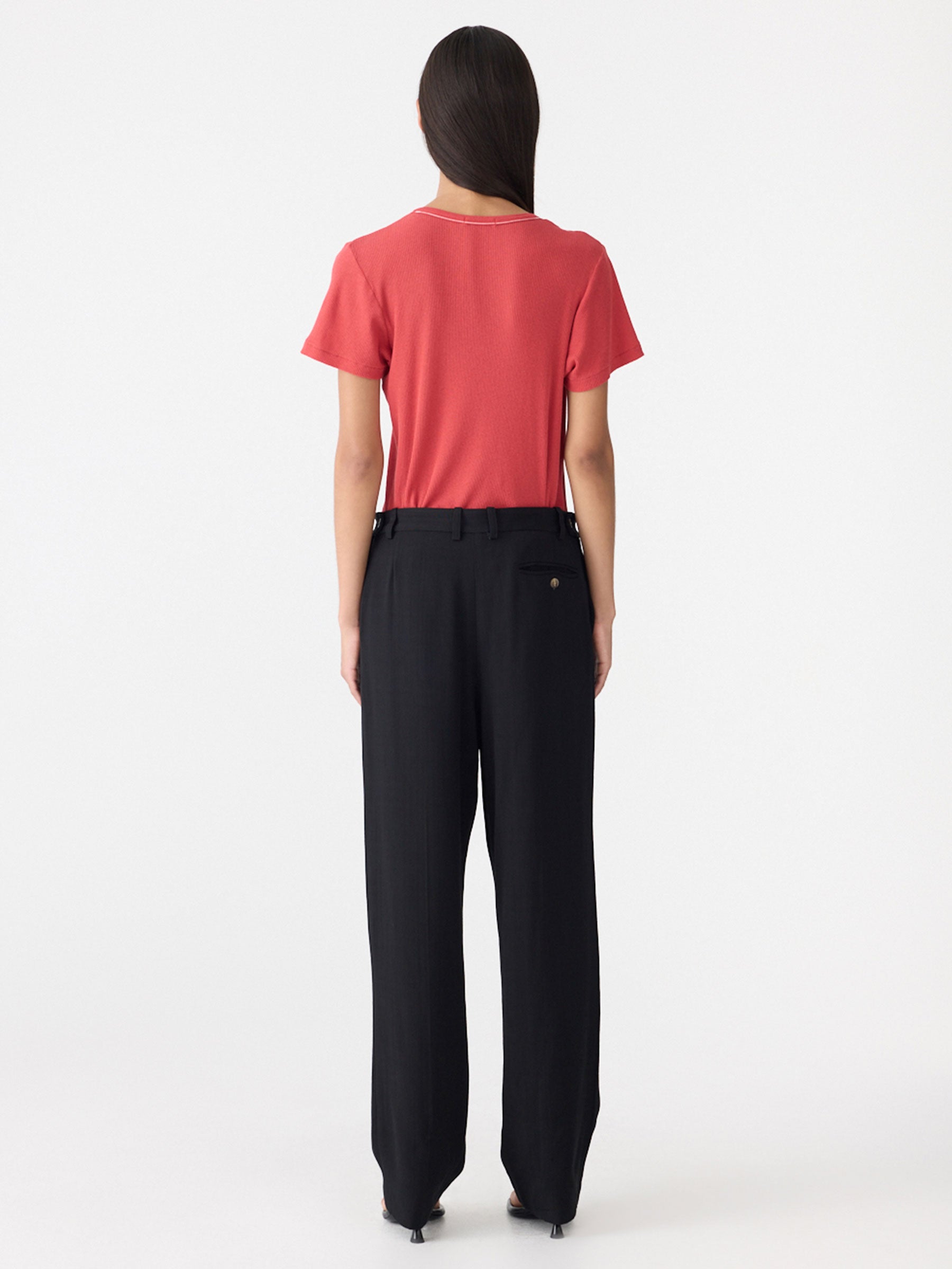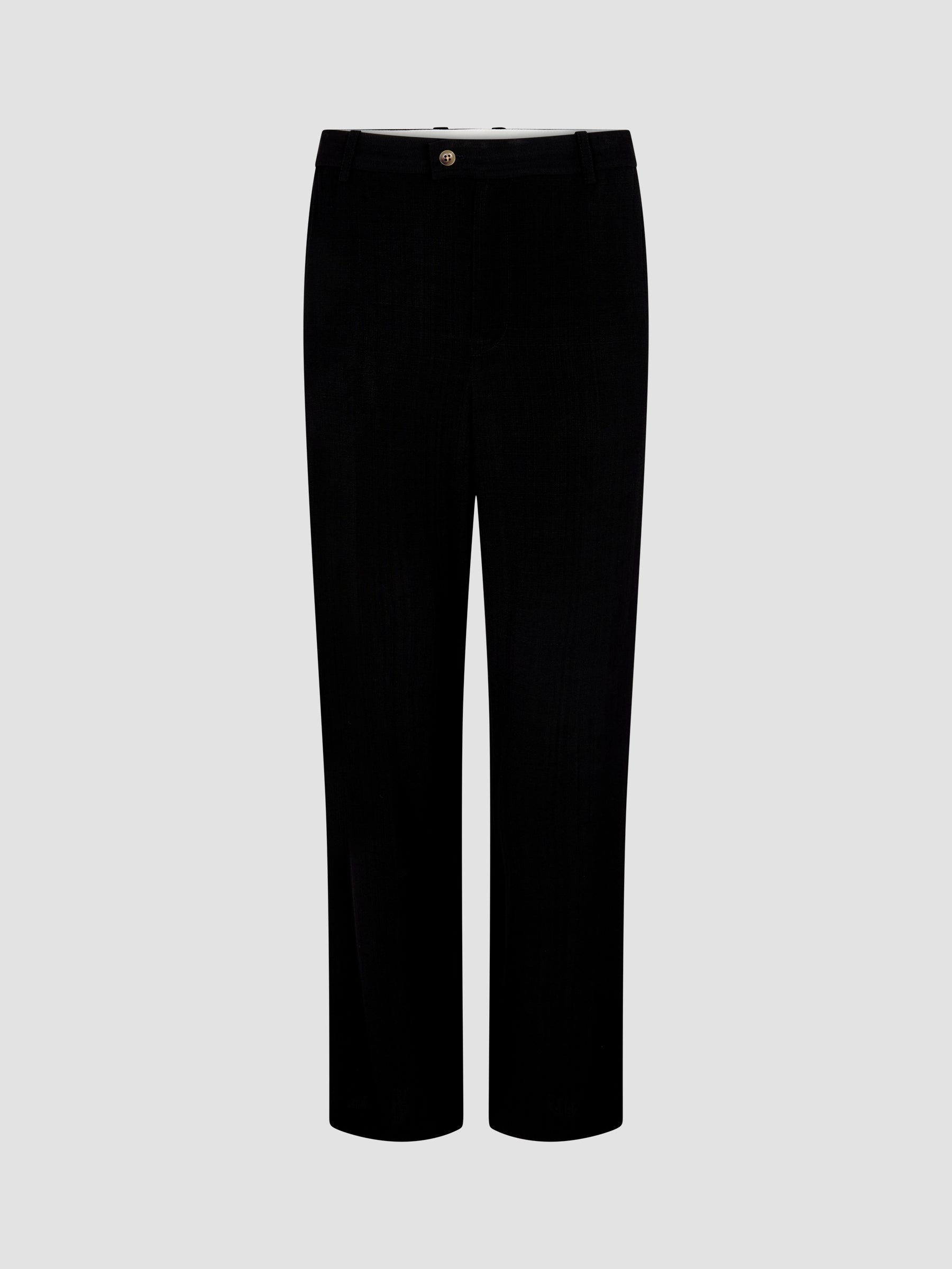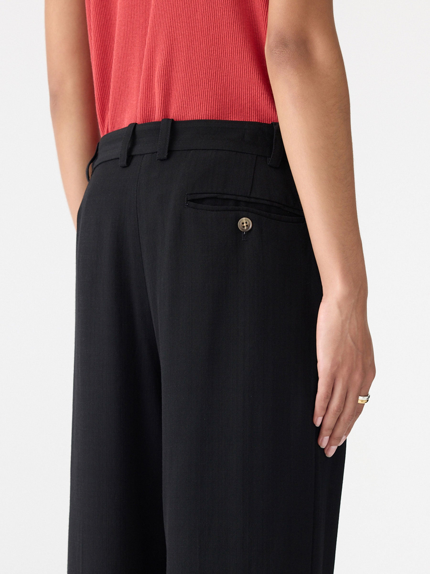 Tailored pant crafted from tightly woven viscose with a soft drape and subtle textured surface. Designed with side adjustable detailing for a personalised fit with a structured internal waistband. Finished with side seam pockets and a back jett pocket with button closure.