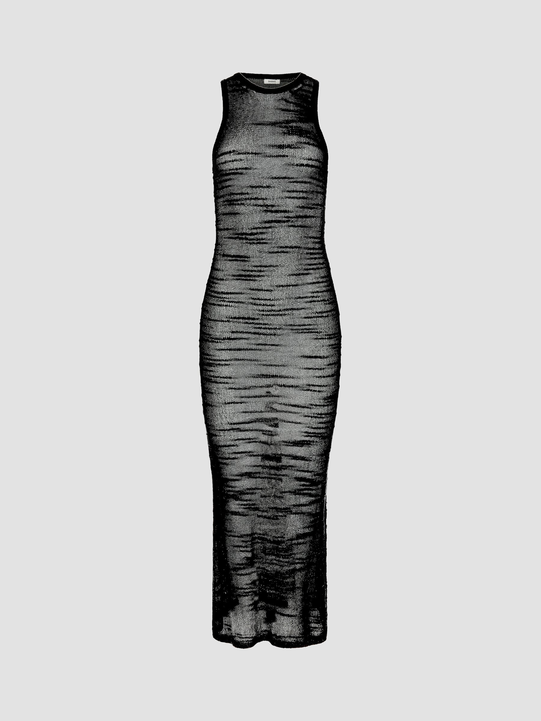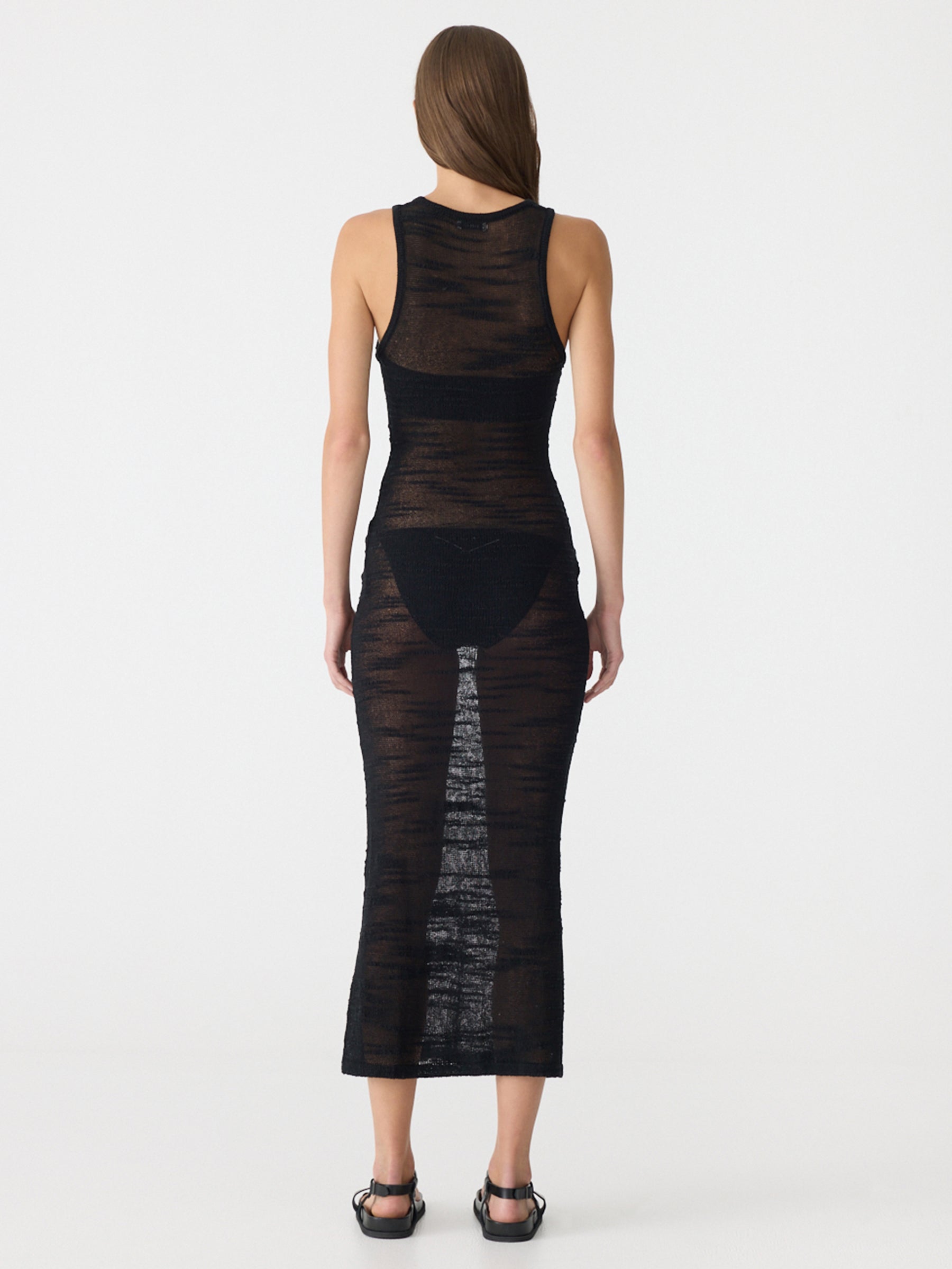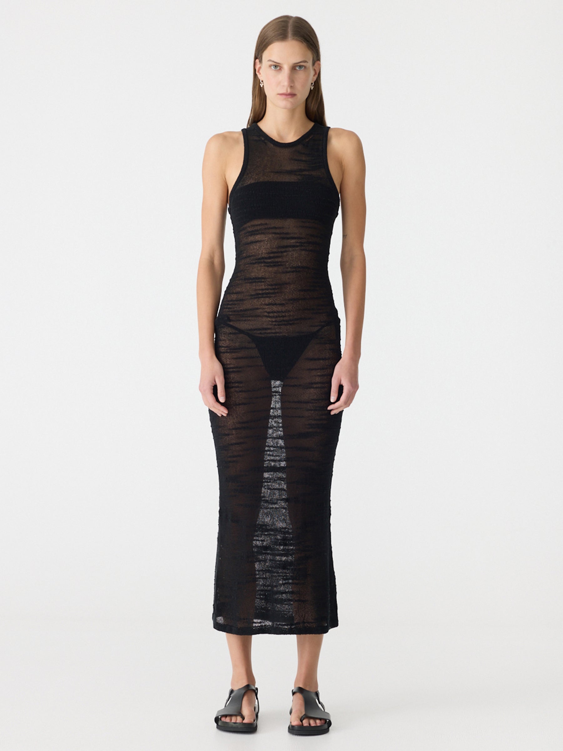 The Semi Sheer Knitted Tank Dress is designed with a soft racer neckline and a delicate, textured knit. Crafted from a sustainable blend of cotton and recycled polyamide fibre, this pull-on style offers a semi-sheer finish and fluid drape.